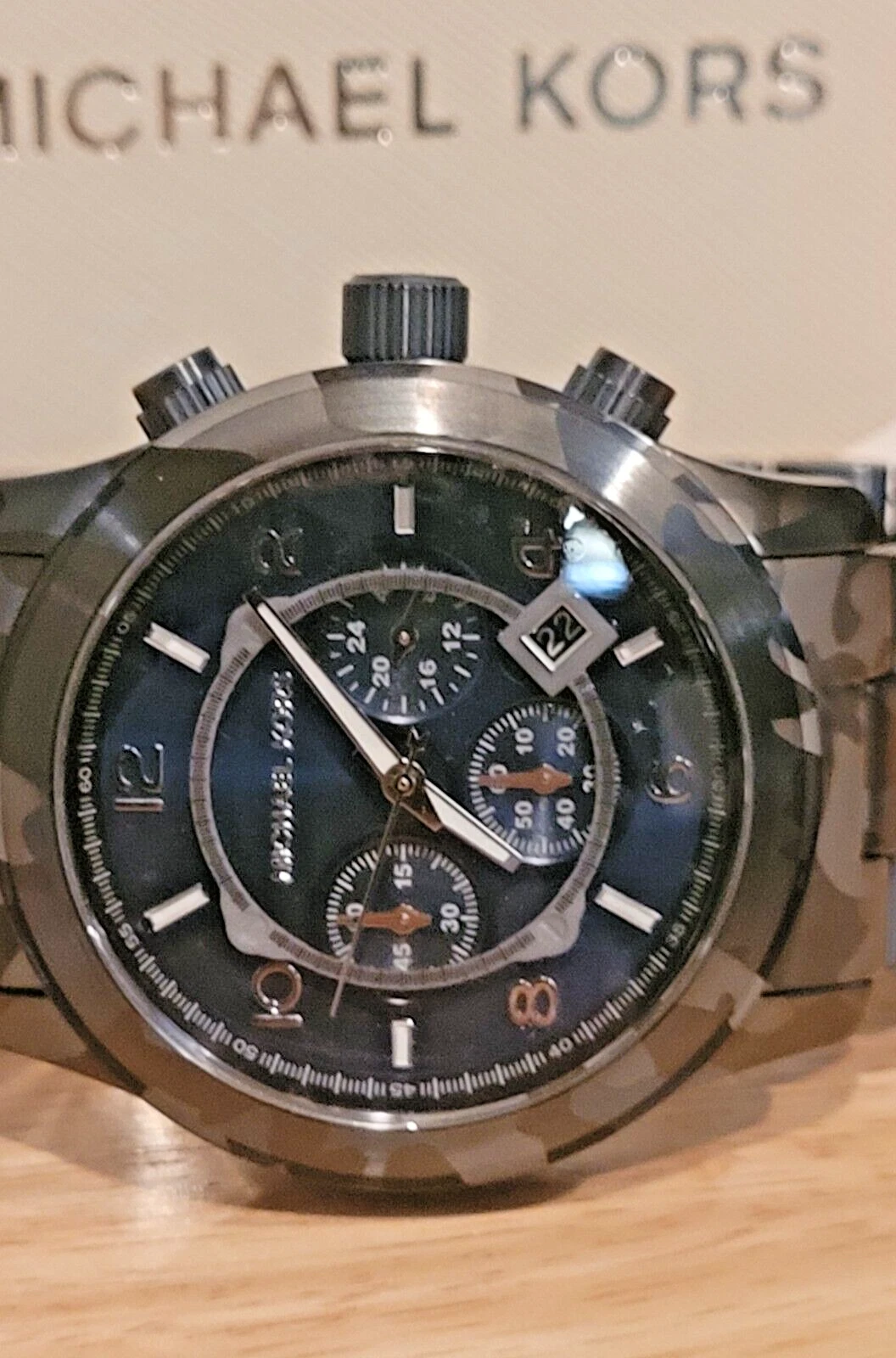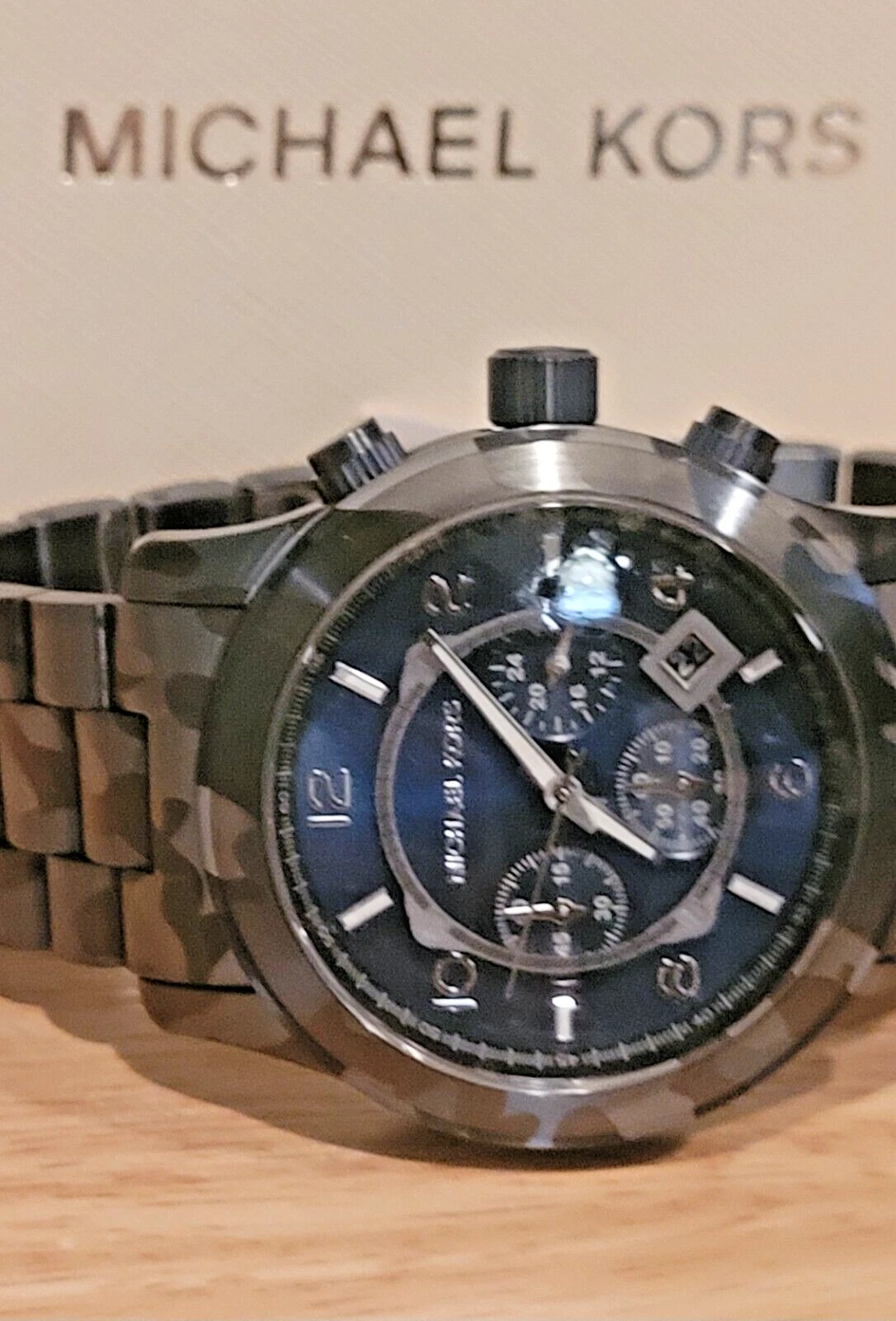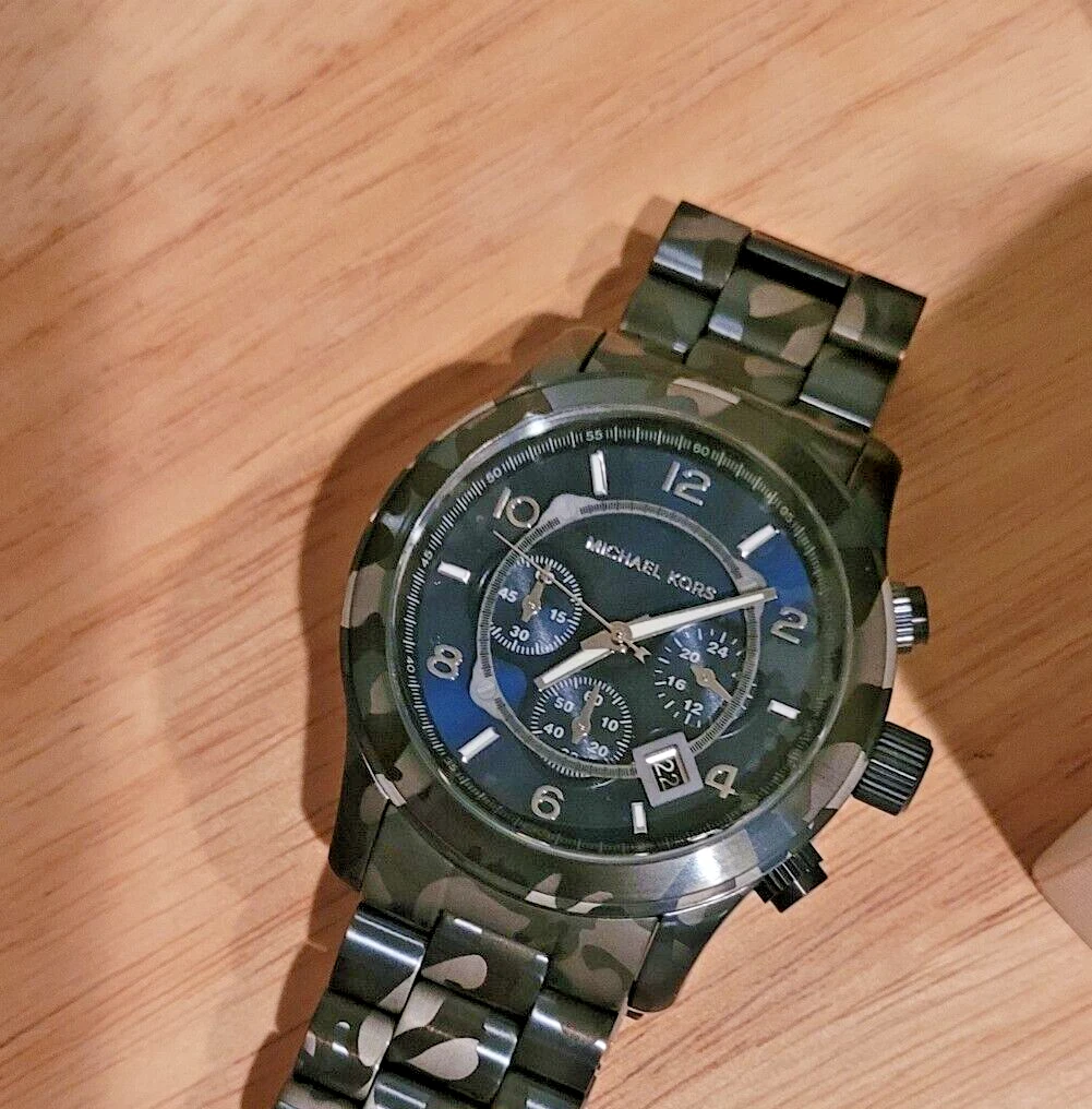 New Michael Kors Men's Chronograph Runway Blue Camouflage Stainless Steel Watch