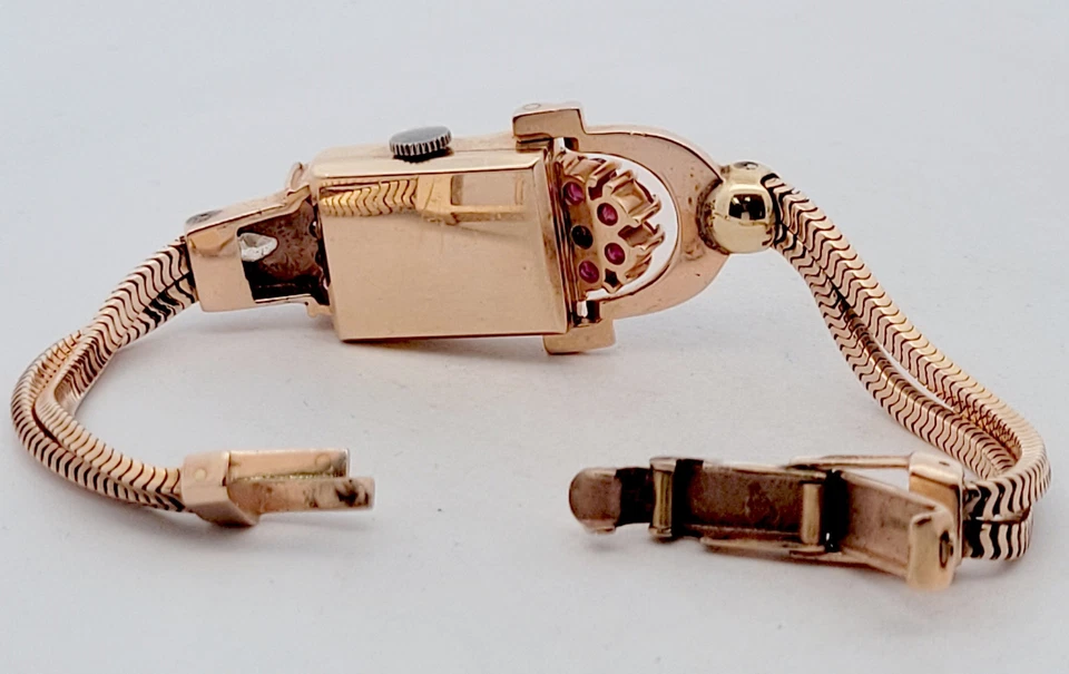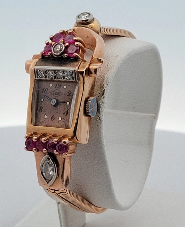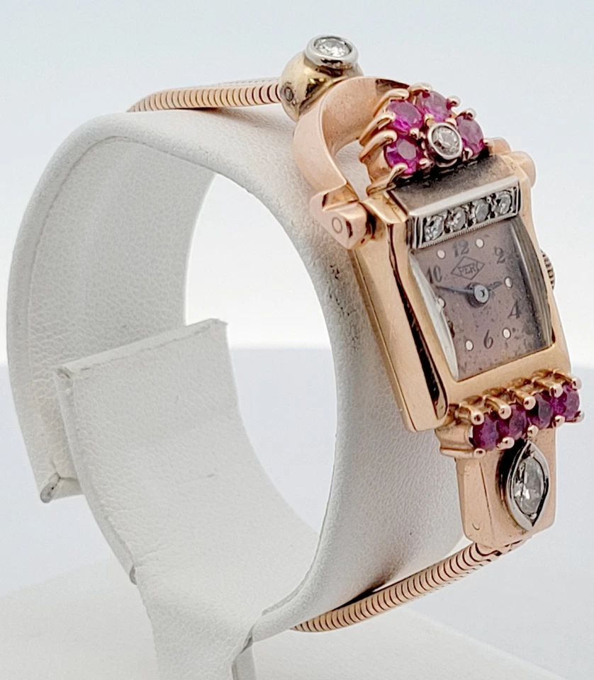 Vintage 14K Rose Gold Diamond & Ruby Manual Wind Ladies Watch