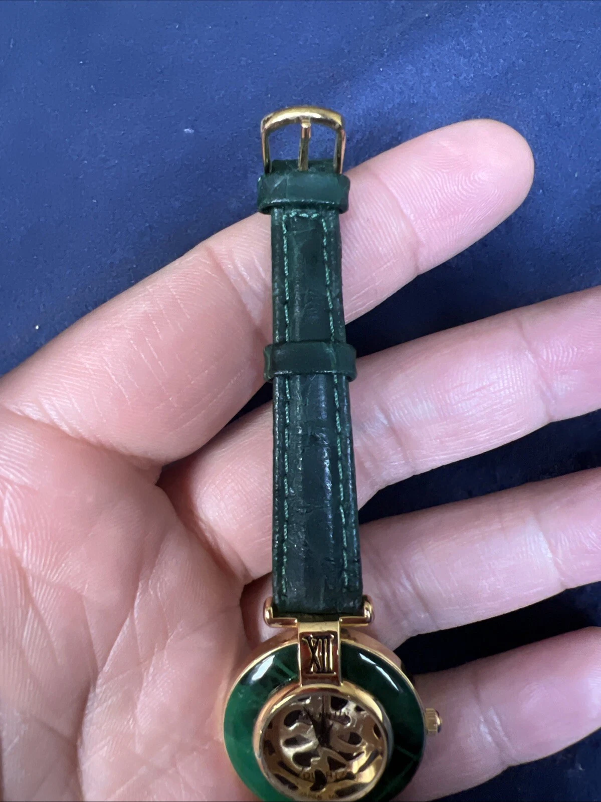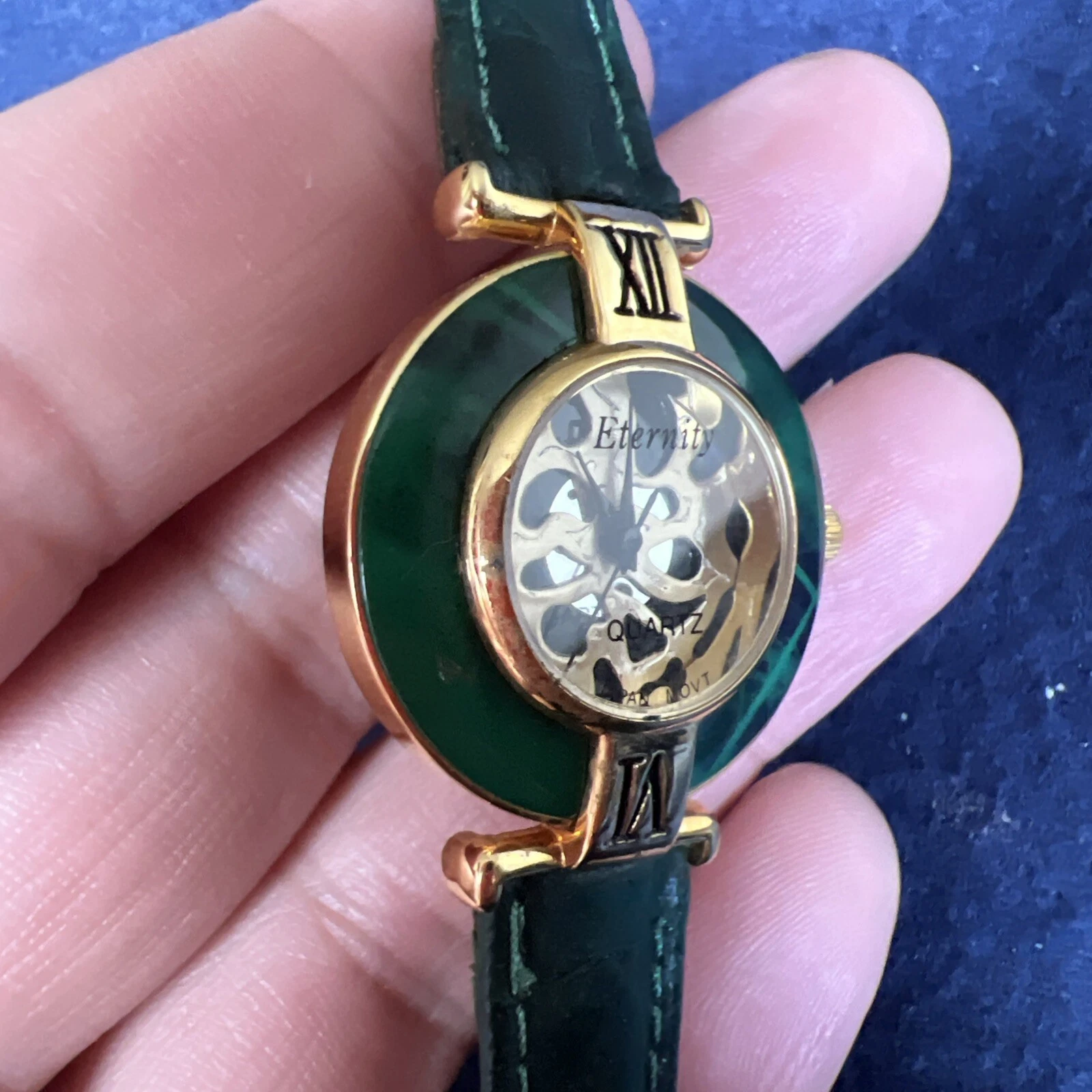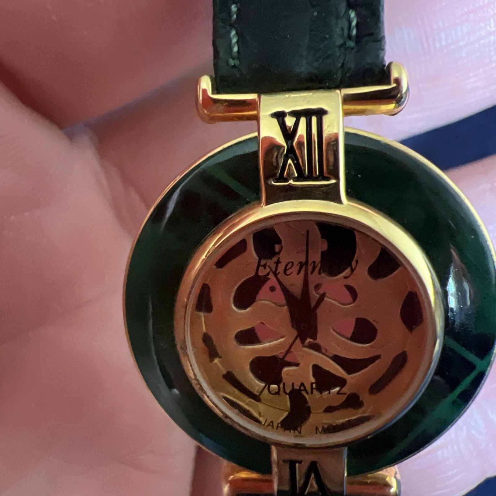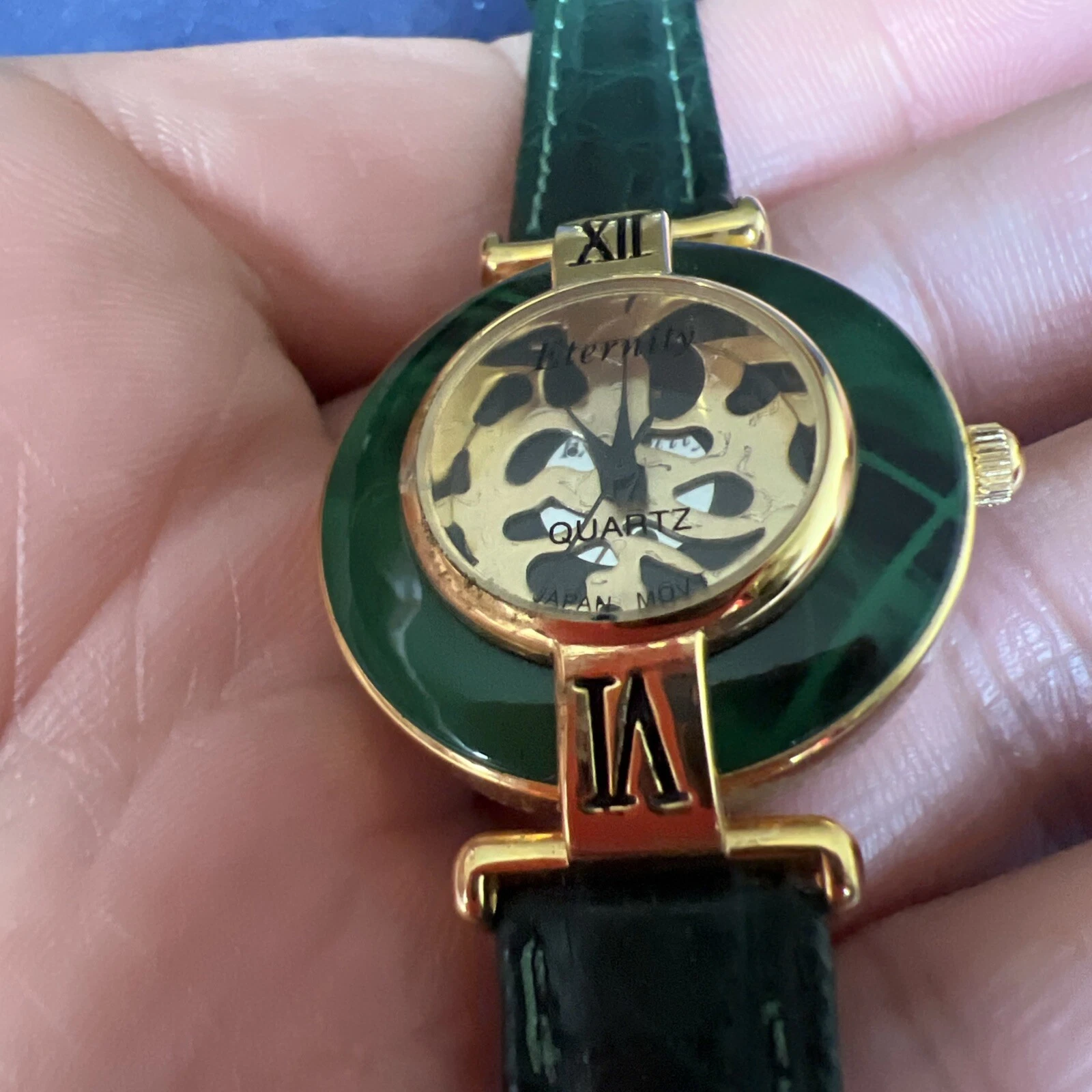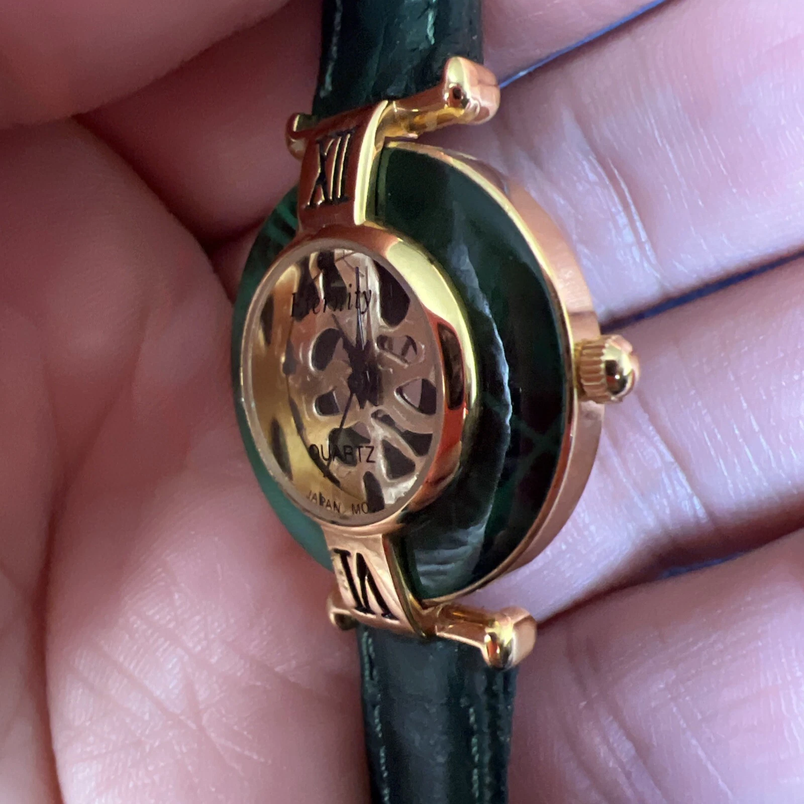 Vintage Eternity Watch Women Gold Tone Faceted Crystal Green Band NEW BATTERY