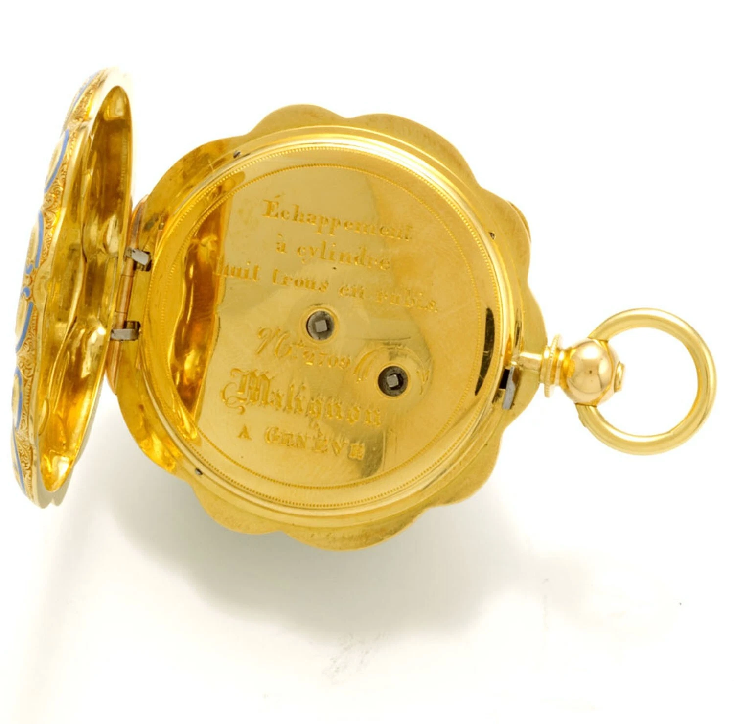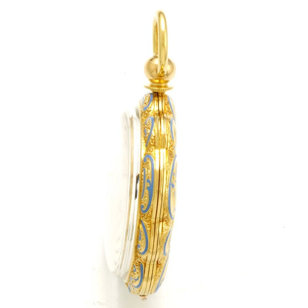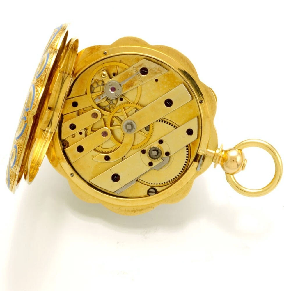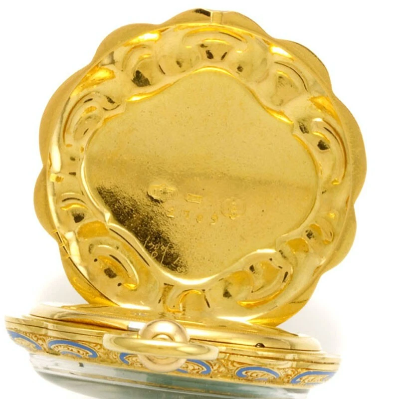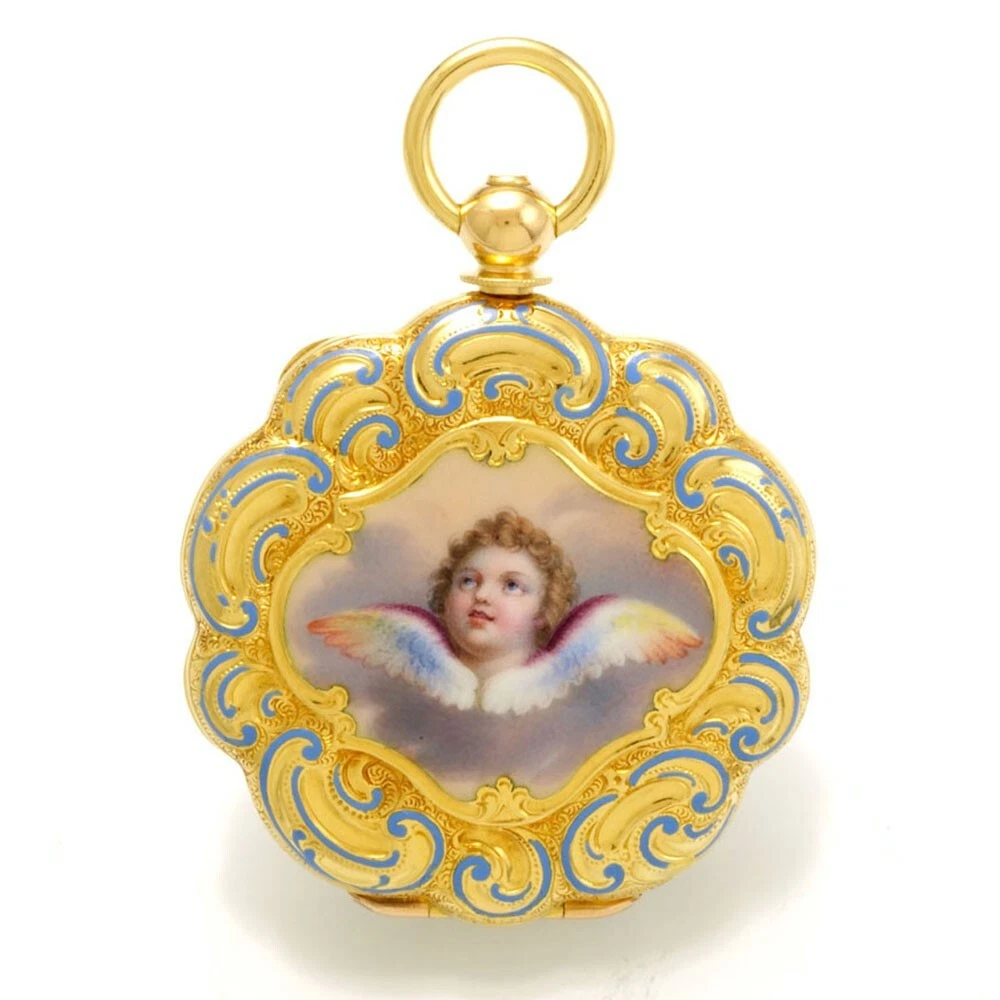 Rare Antique 18K Scalloped Edge Cherub Enameled Gold Dialed Lapel Watch