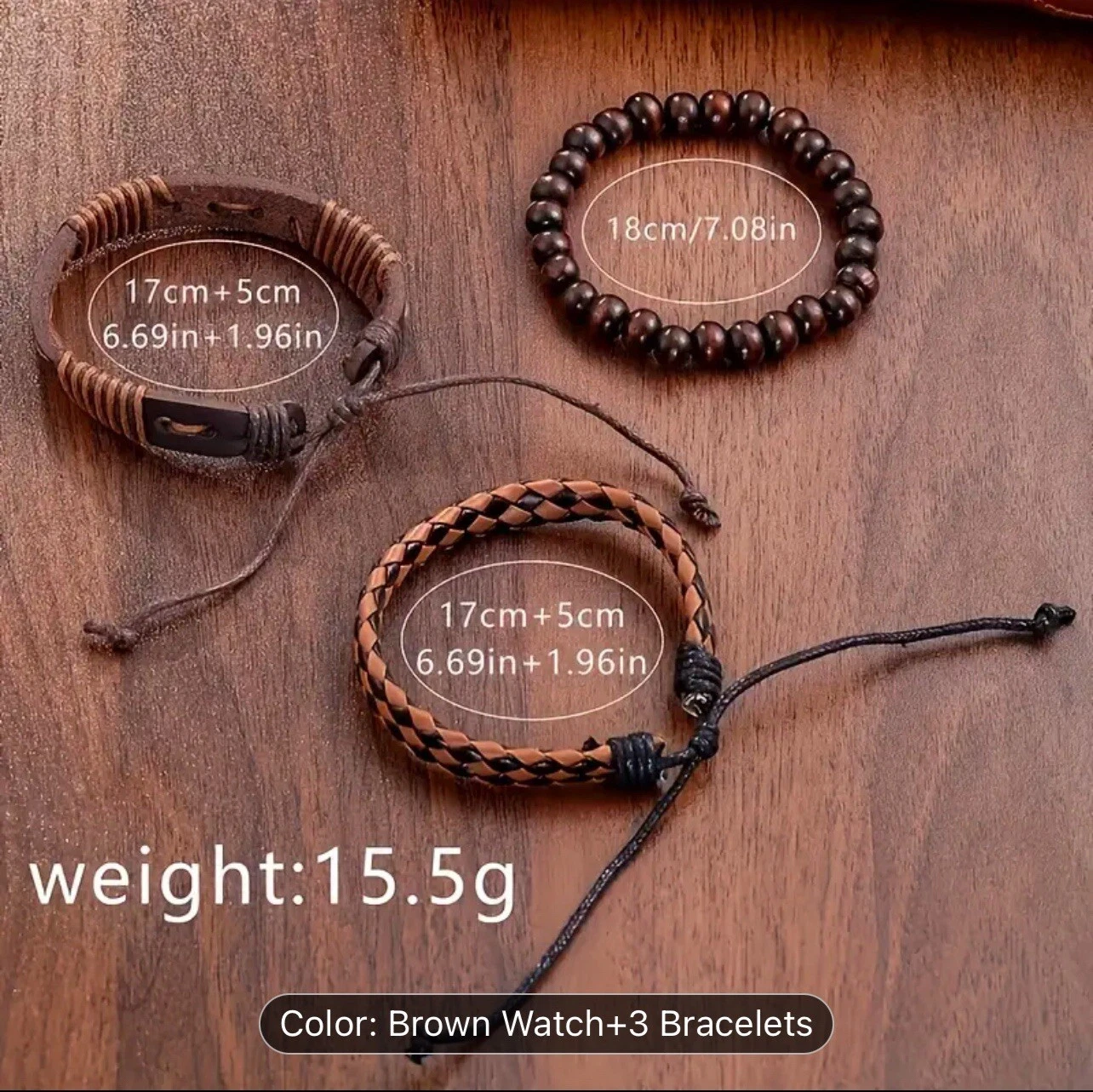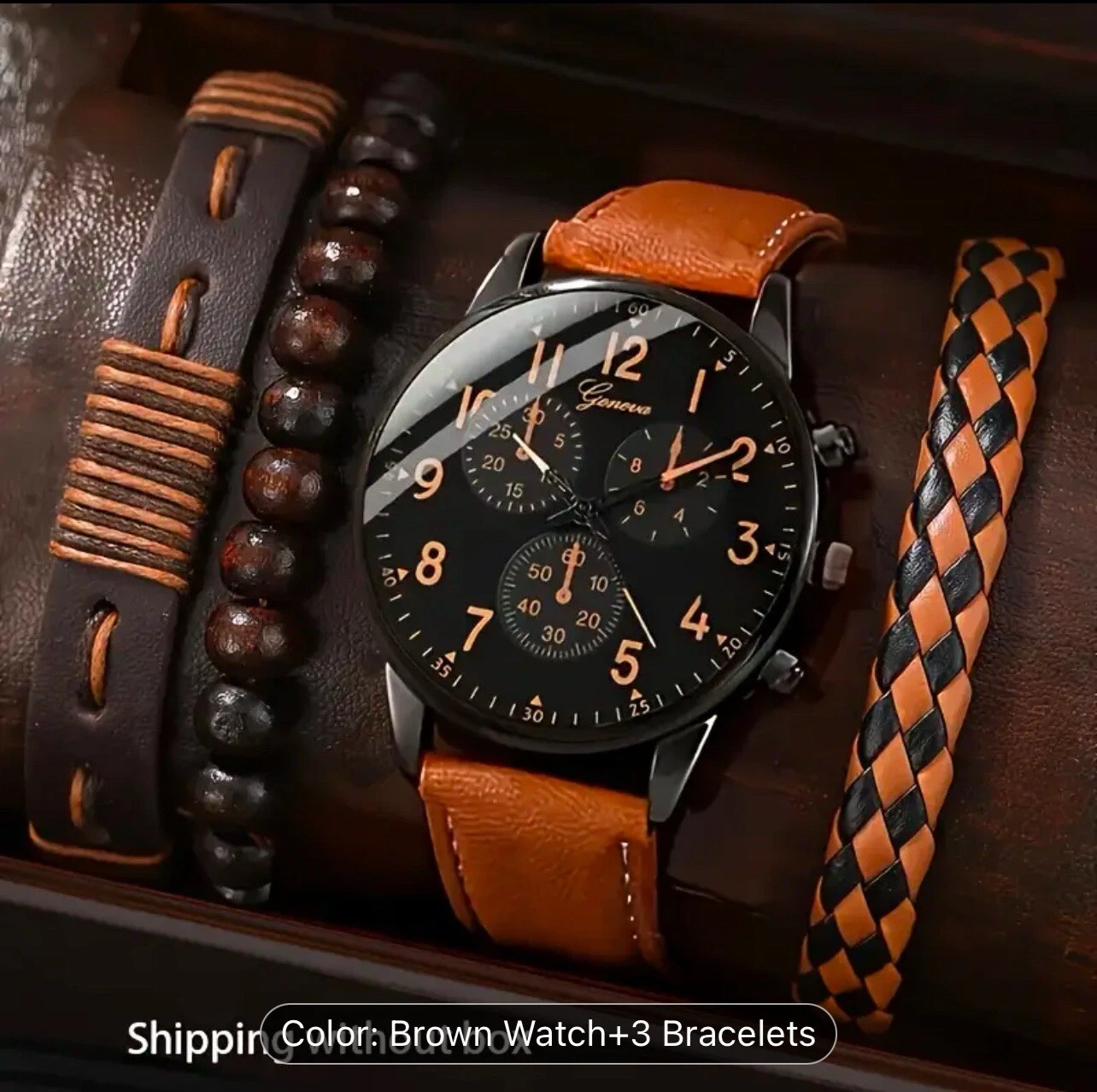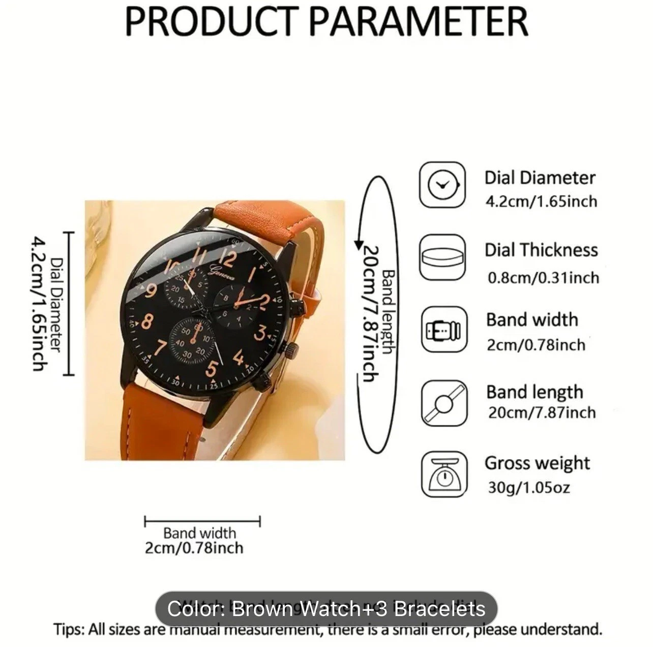 Men's Brown & Black Geneva Watch Faux Leather band w/ 4pc Bracelet Set