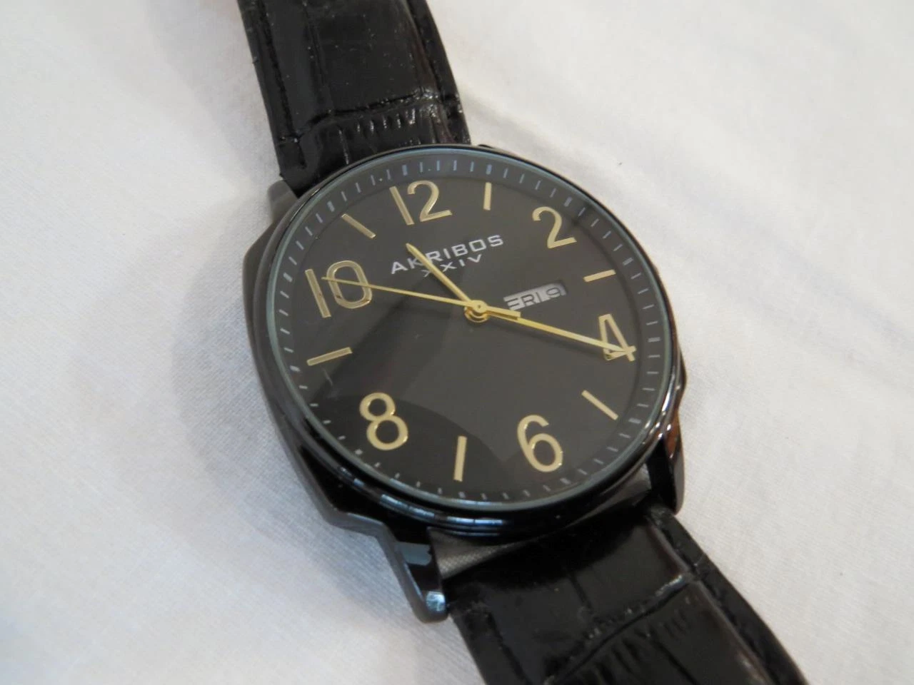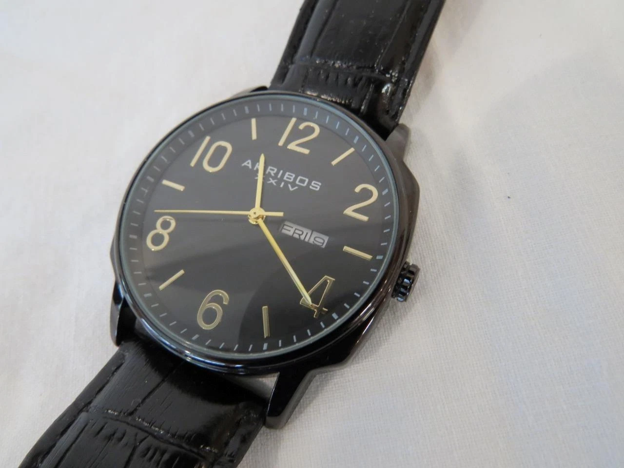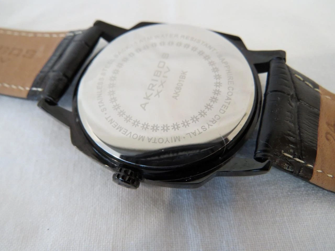 Men's Akribos BLACK Stainless Watch Leather Band Day/Date 45mm NWOT