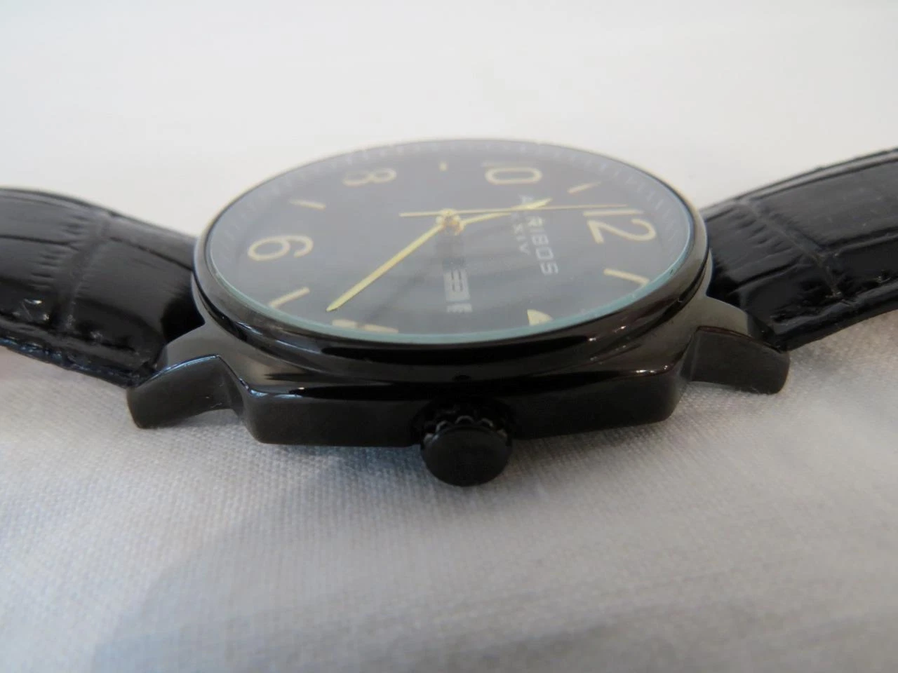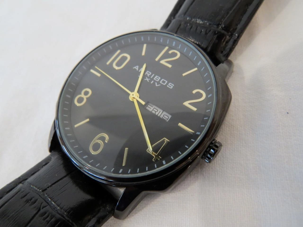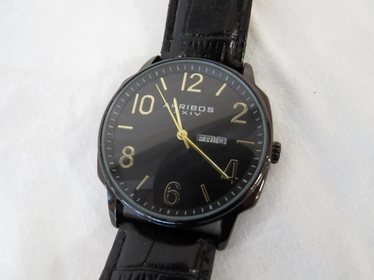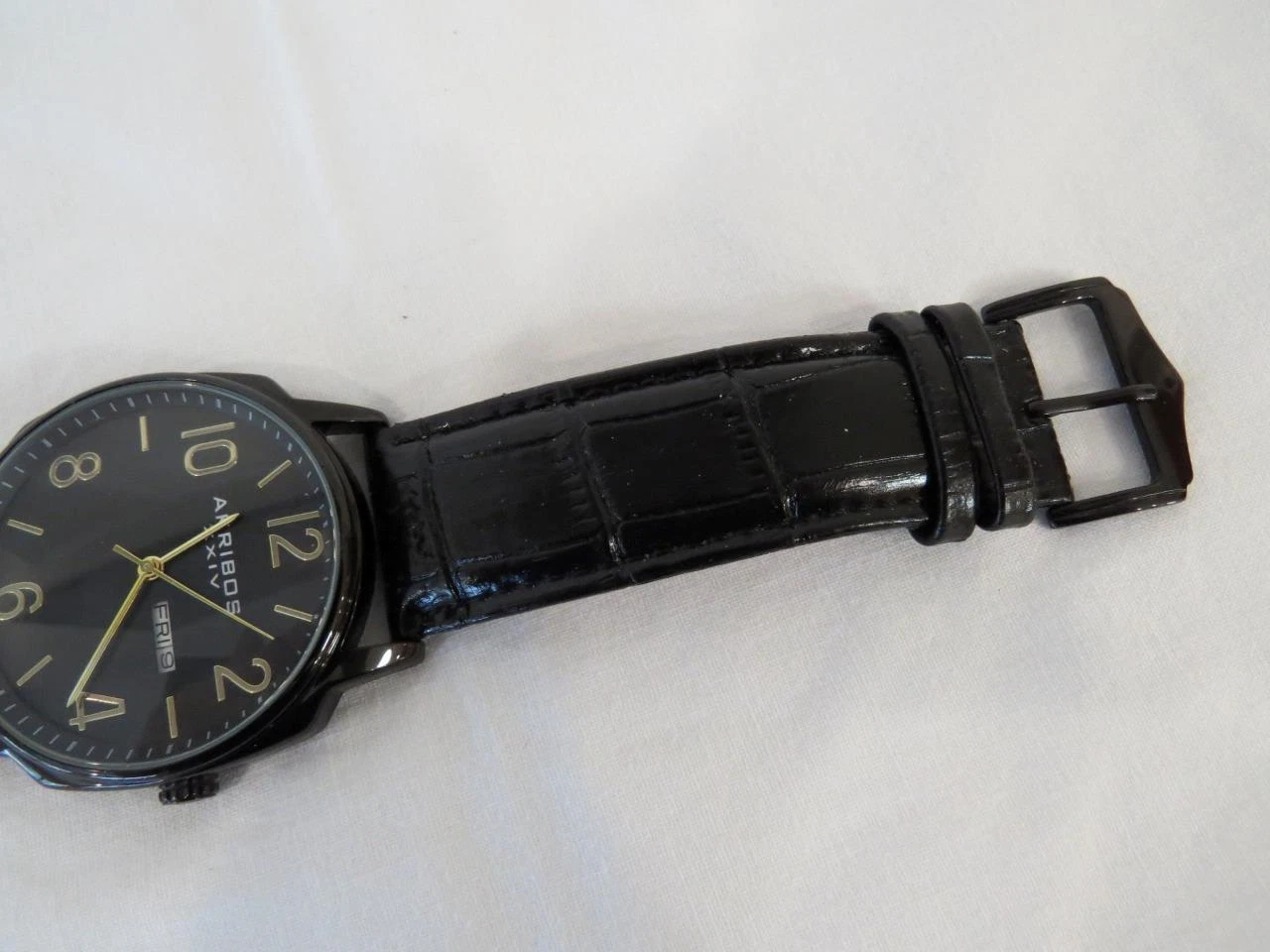 Men's Akribos BLACK Stainless Watch Leather Band Day/Date 45mm NWOT