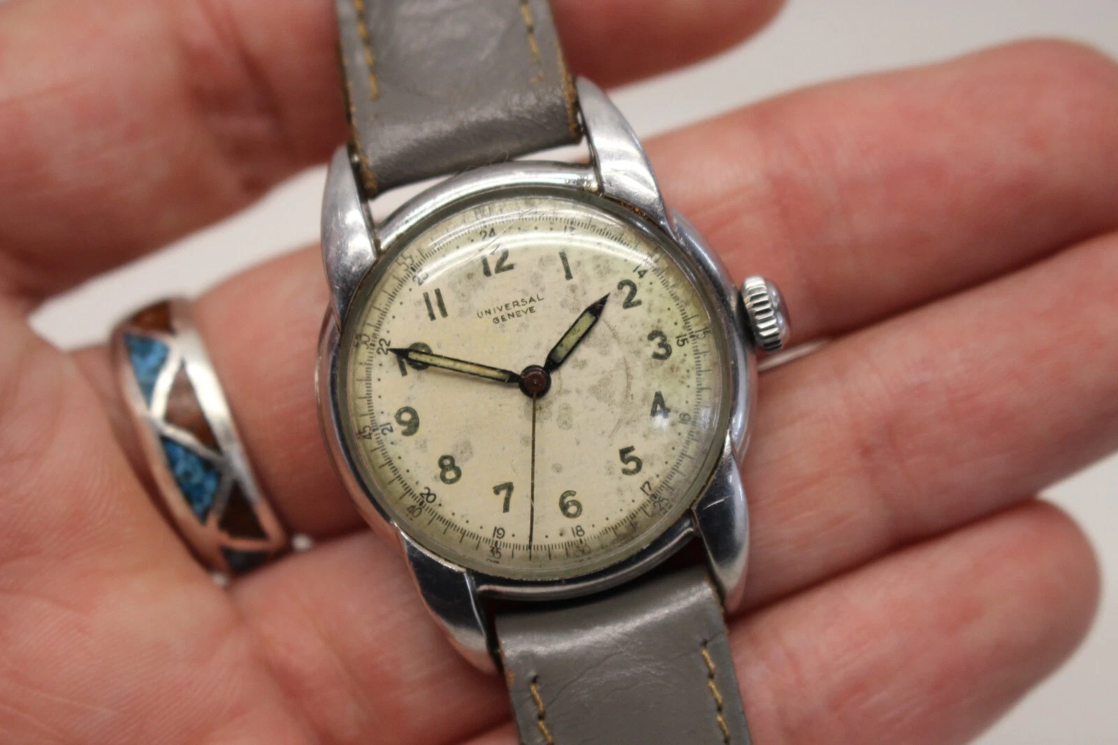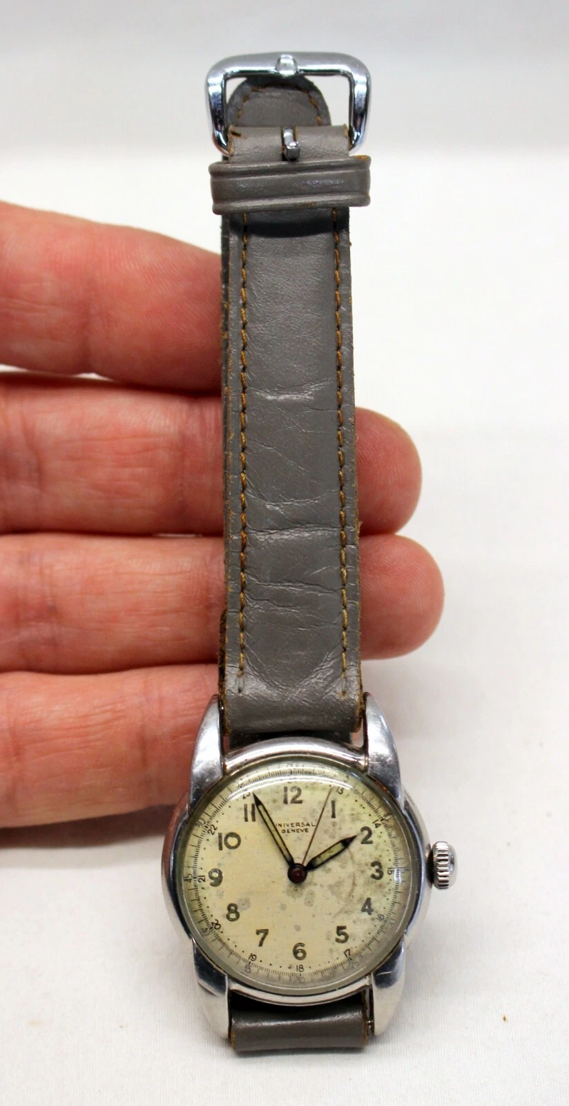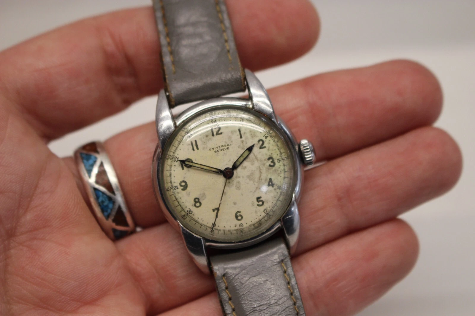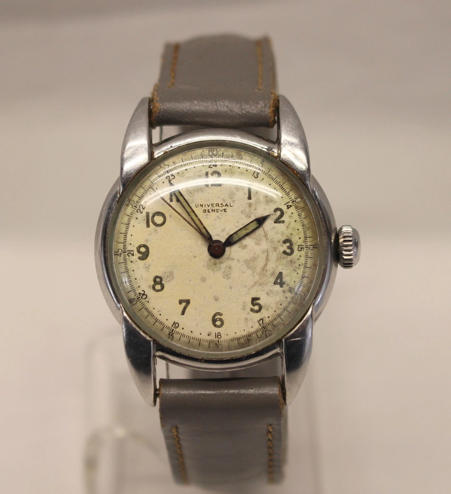 1950's UNIVERSAL GENEVE Manual Watch MILITARY DIAL Running RARE CASE DESIGN 31mm