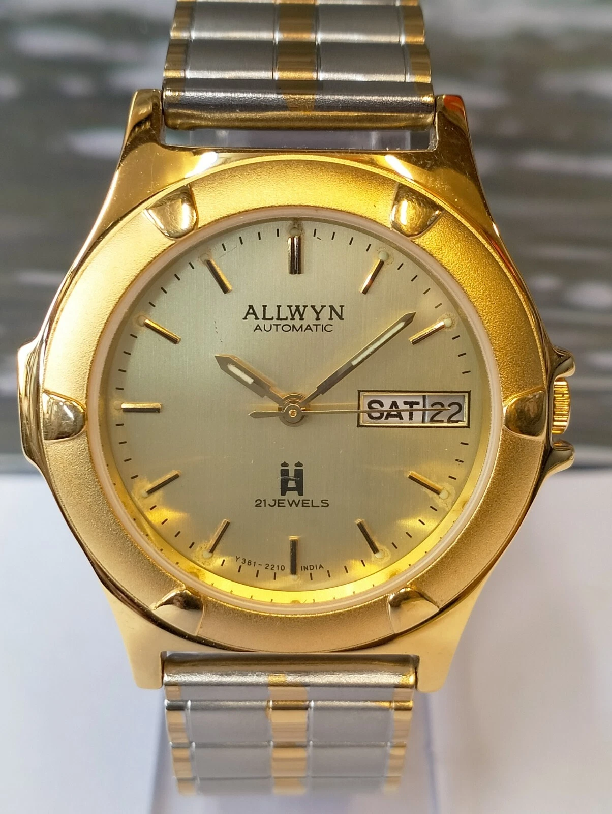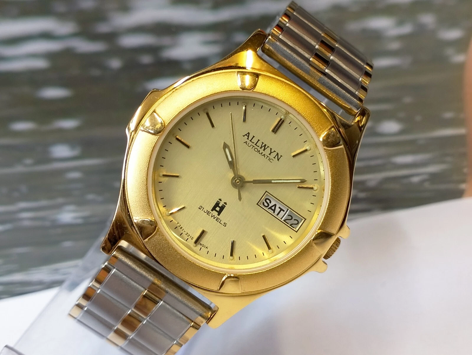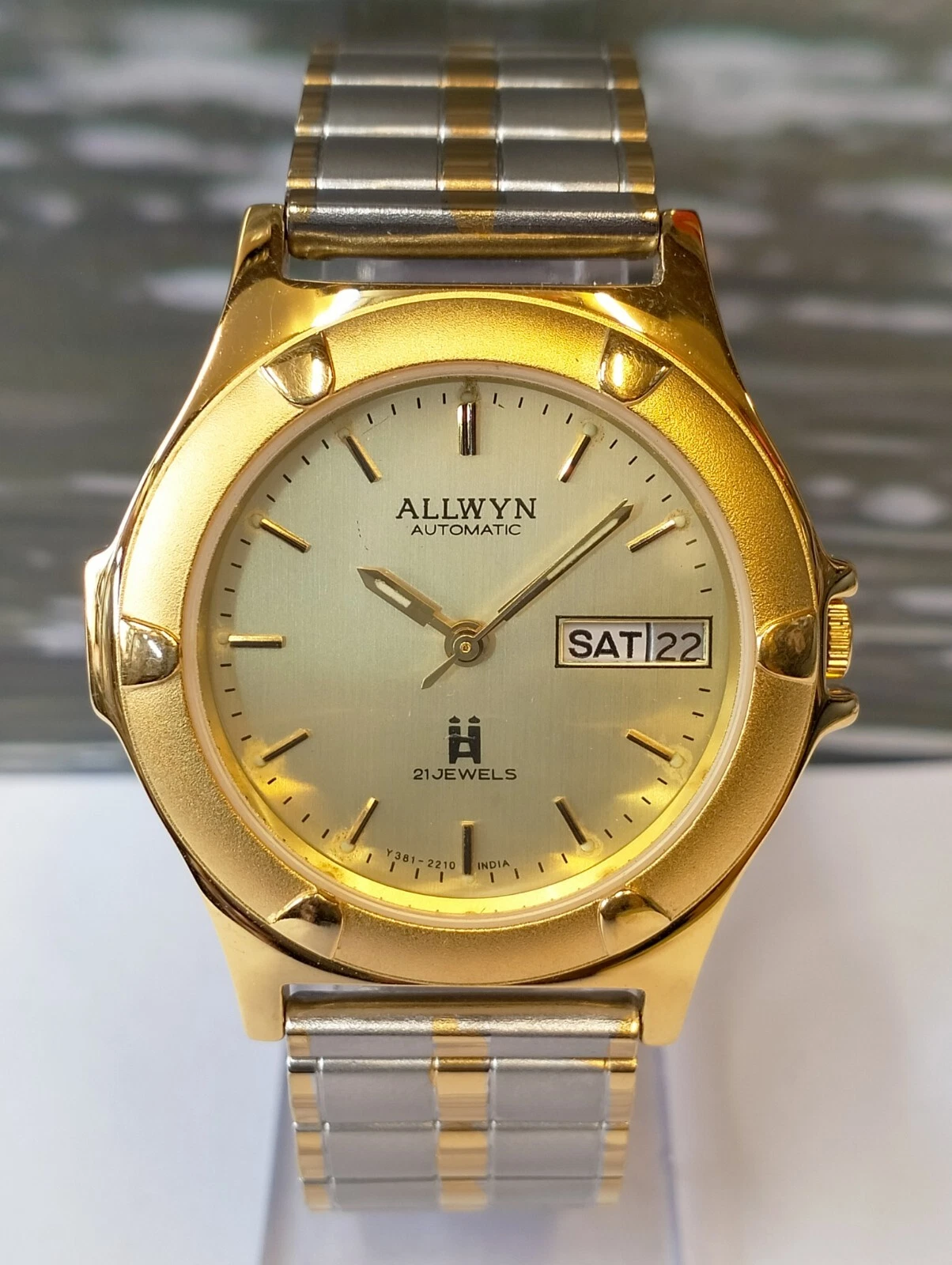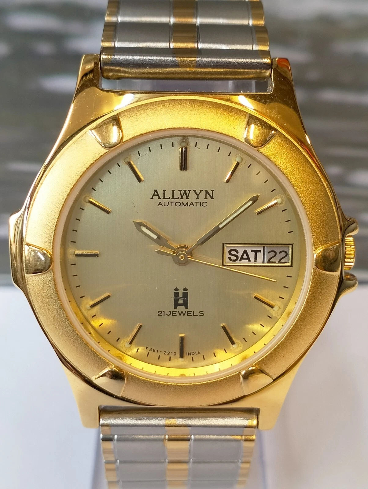 ALLWYN 21 JEWELS AUTOMATIC NOS GOLD DIAL Y381-8460 INDIA MEN'S FULL WORKING VTG.