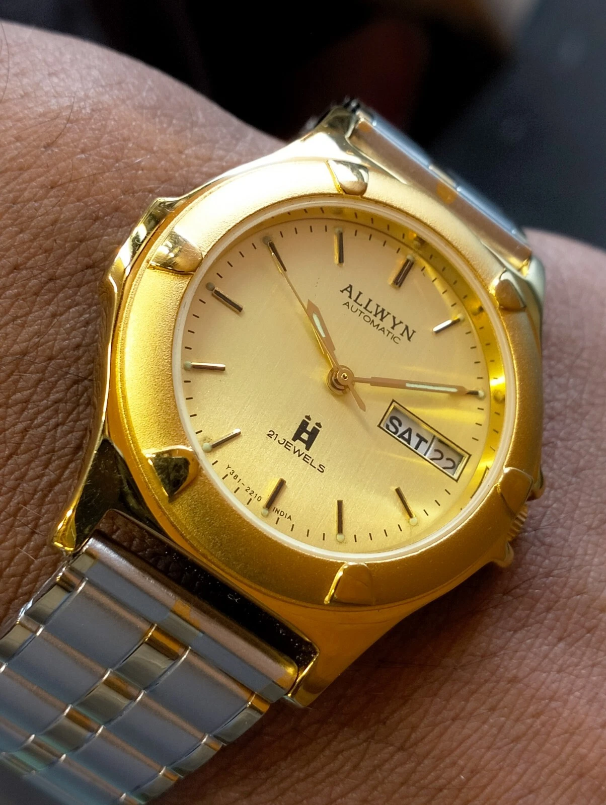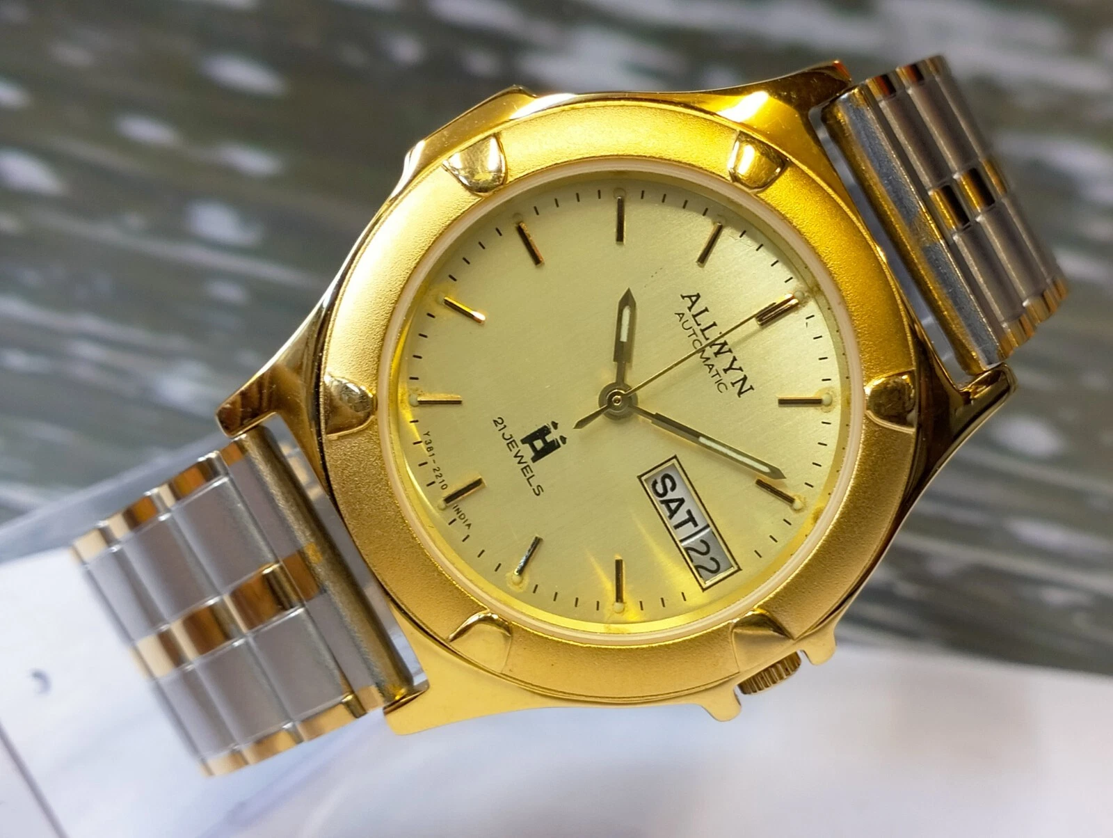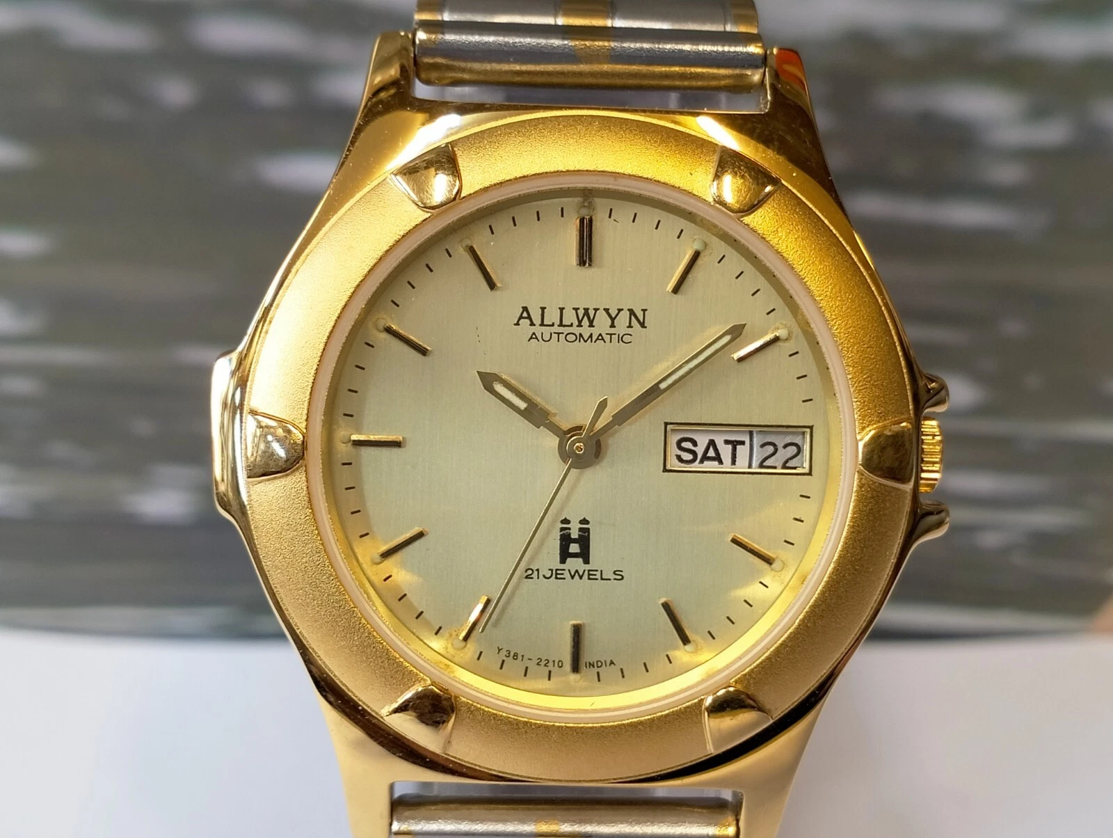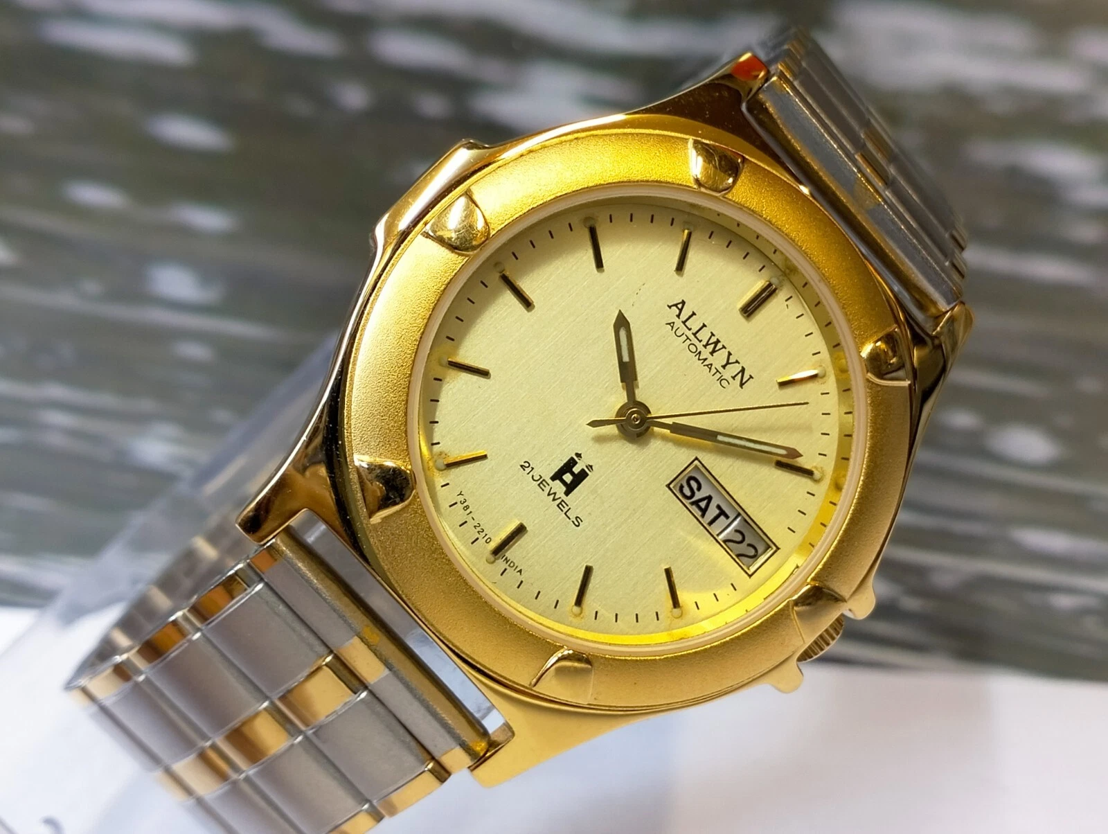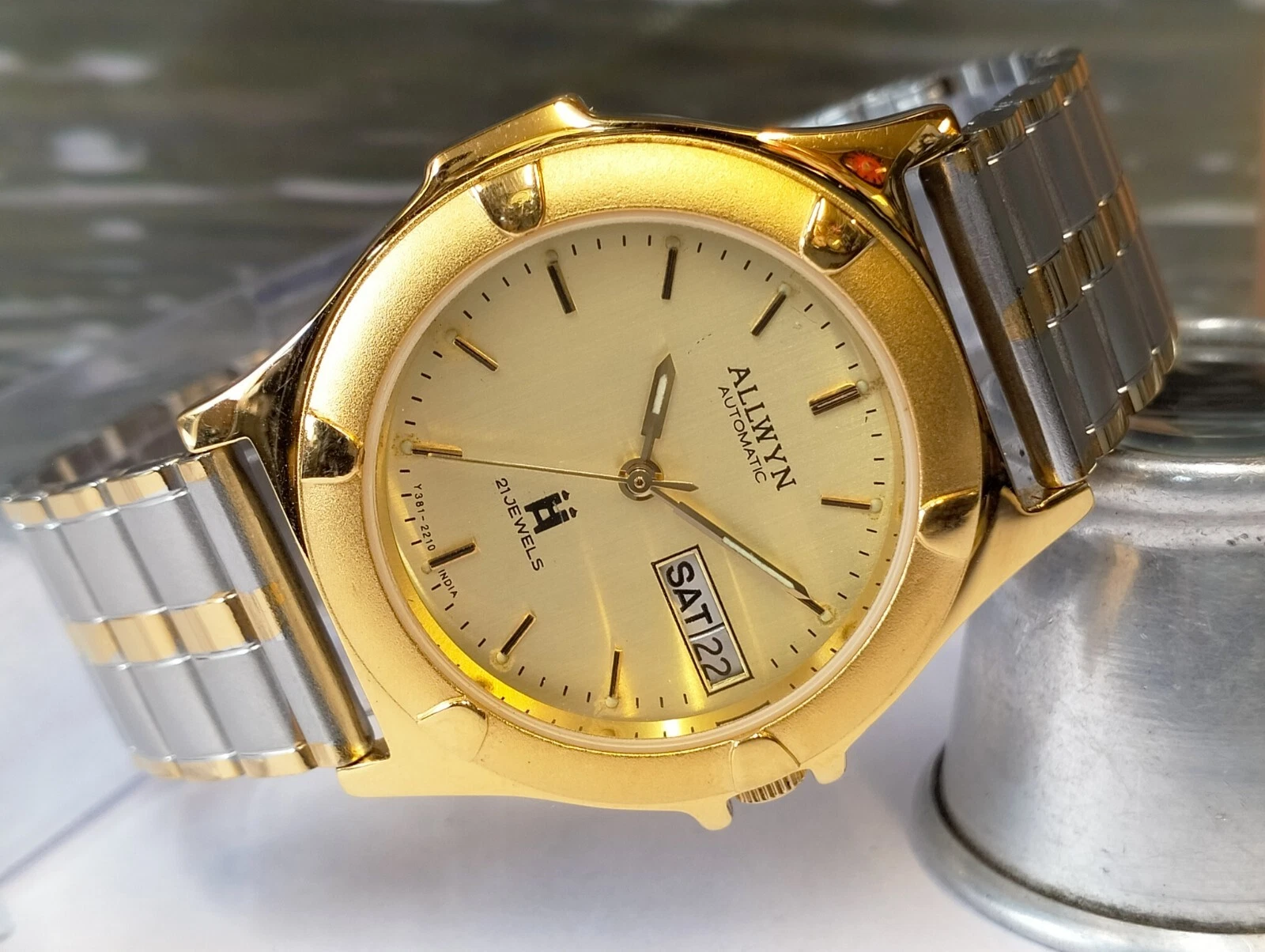 ALLWYN 21 JEWELS AUTOMATIC NOS GOLD DIAL Y381-8460 INDIA MEN'S FULL WORKING VTG.