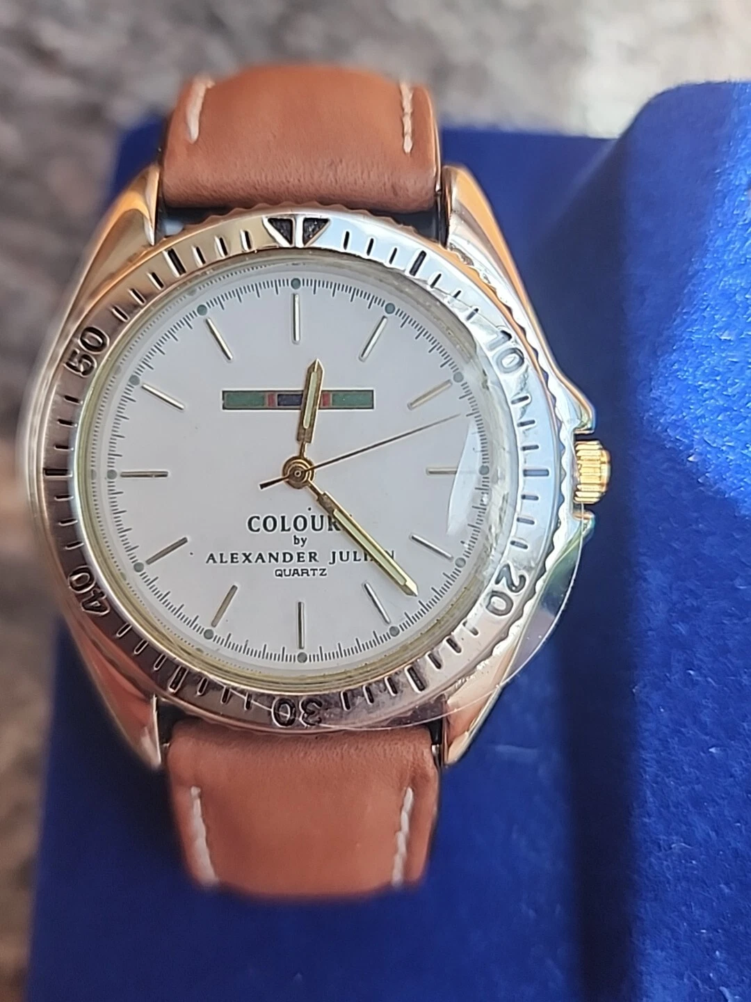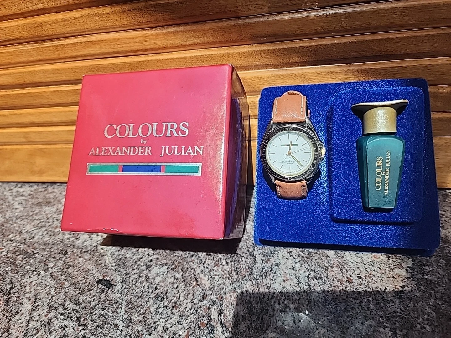 Vintage Alexander Julian Colours Quartz Watch W/ Leather Band & .25oz Cologne
