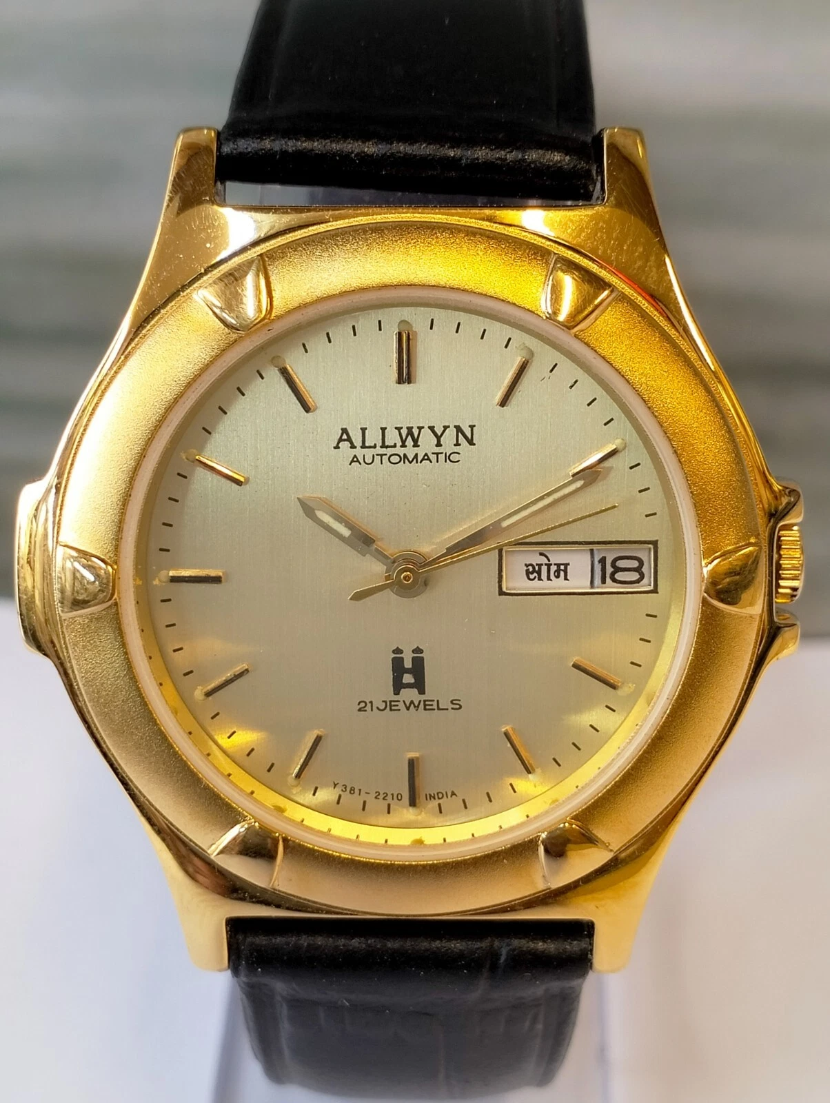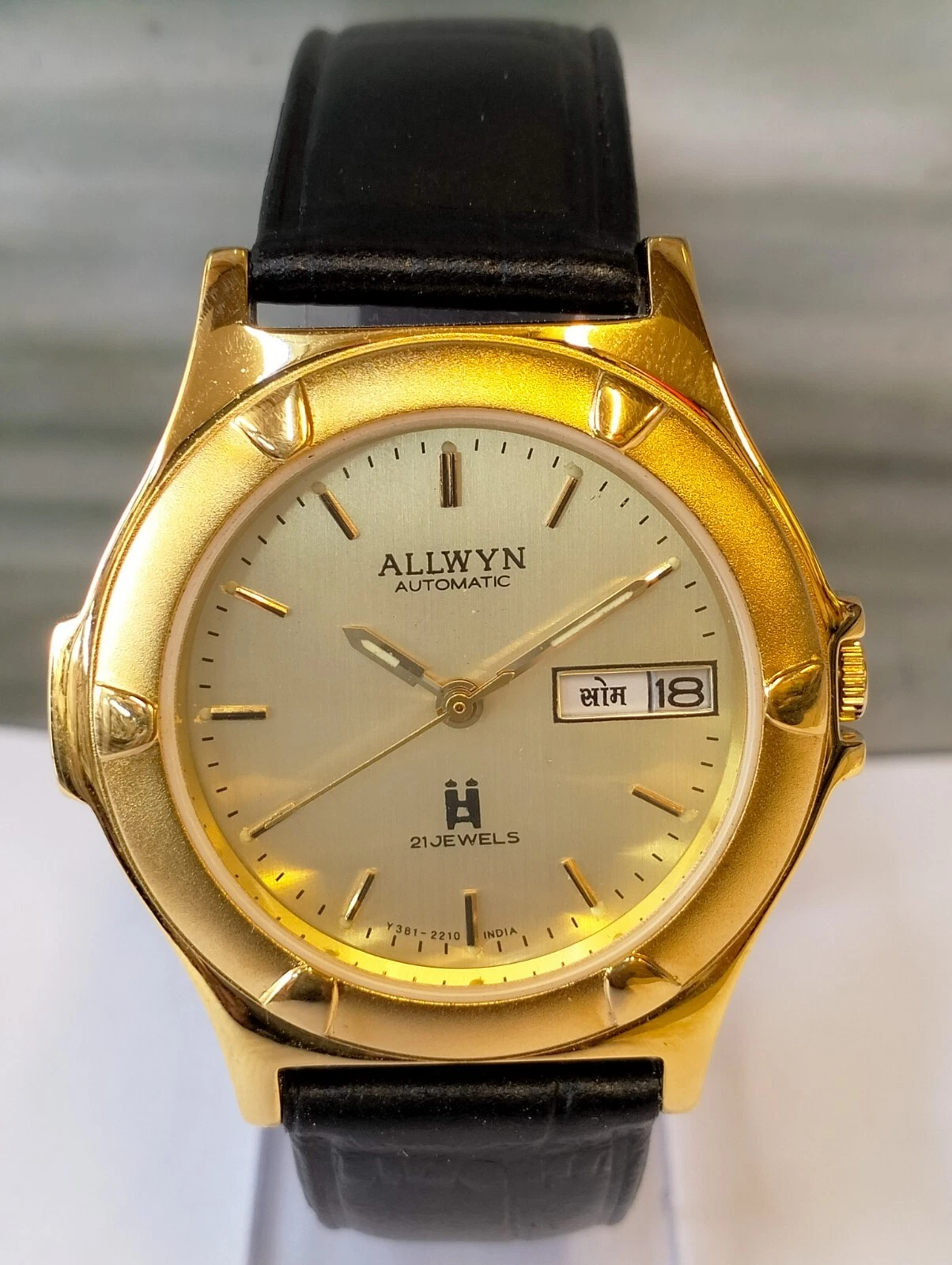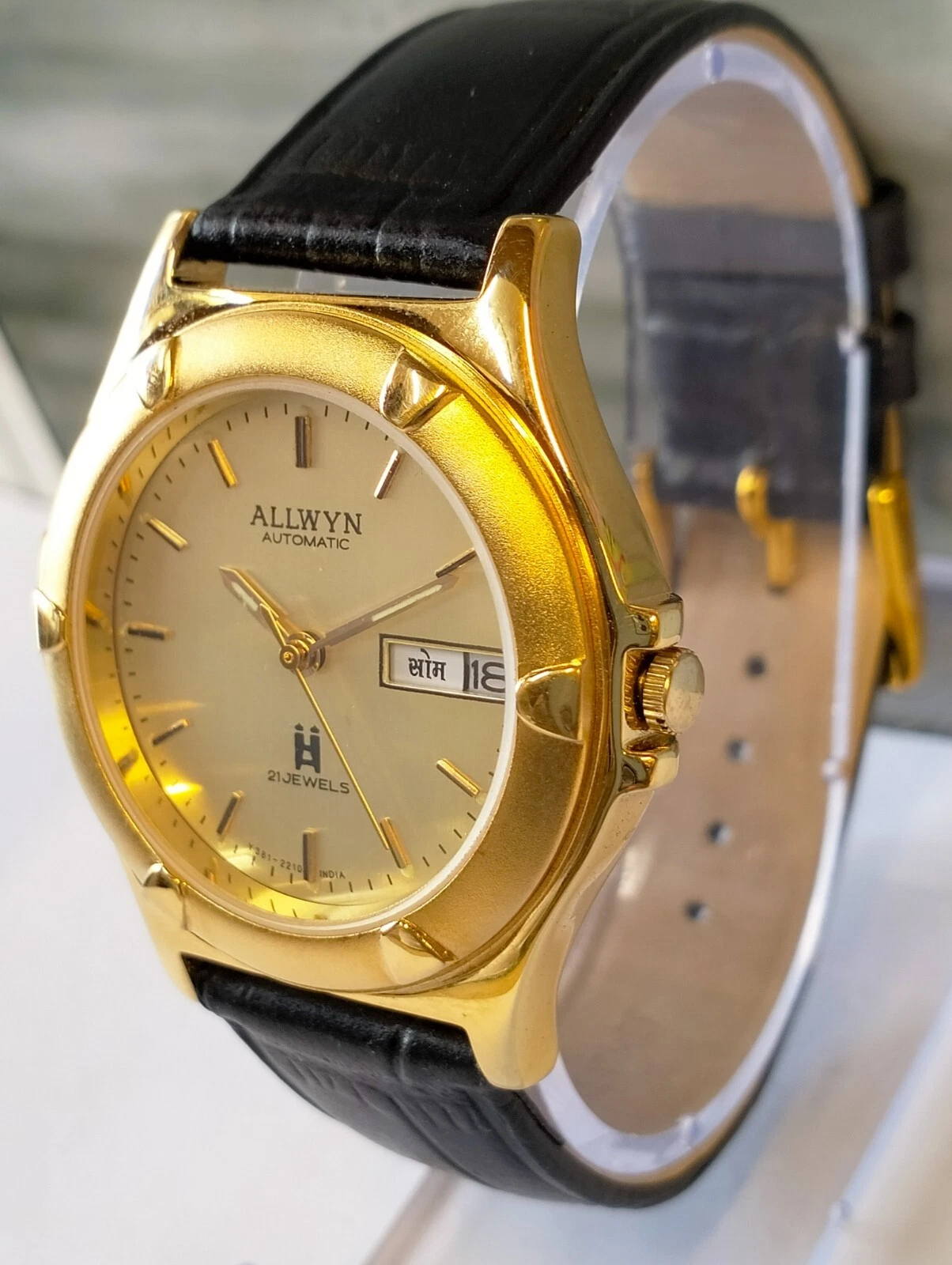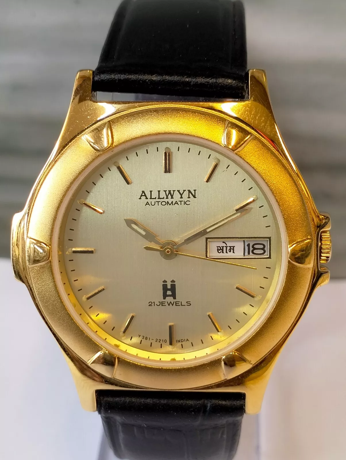 ORIGINAL ALLWYN AUTOMATIC 21J NOS GOLD DIAL Y381-8460 INDIA MEN'S FULL WORKING
