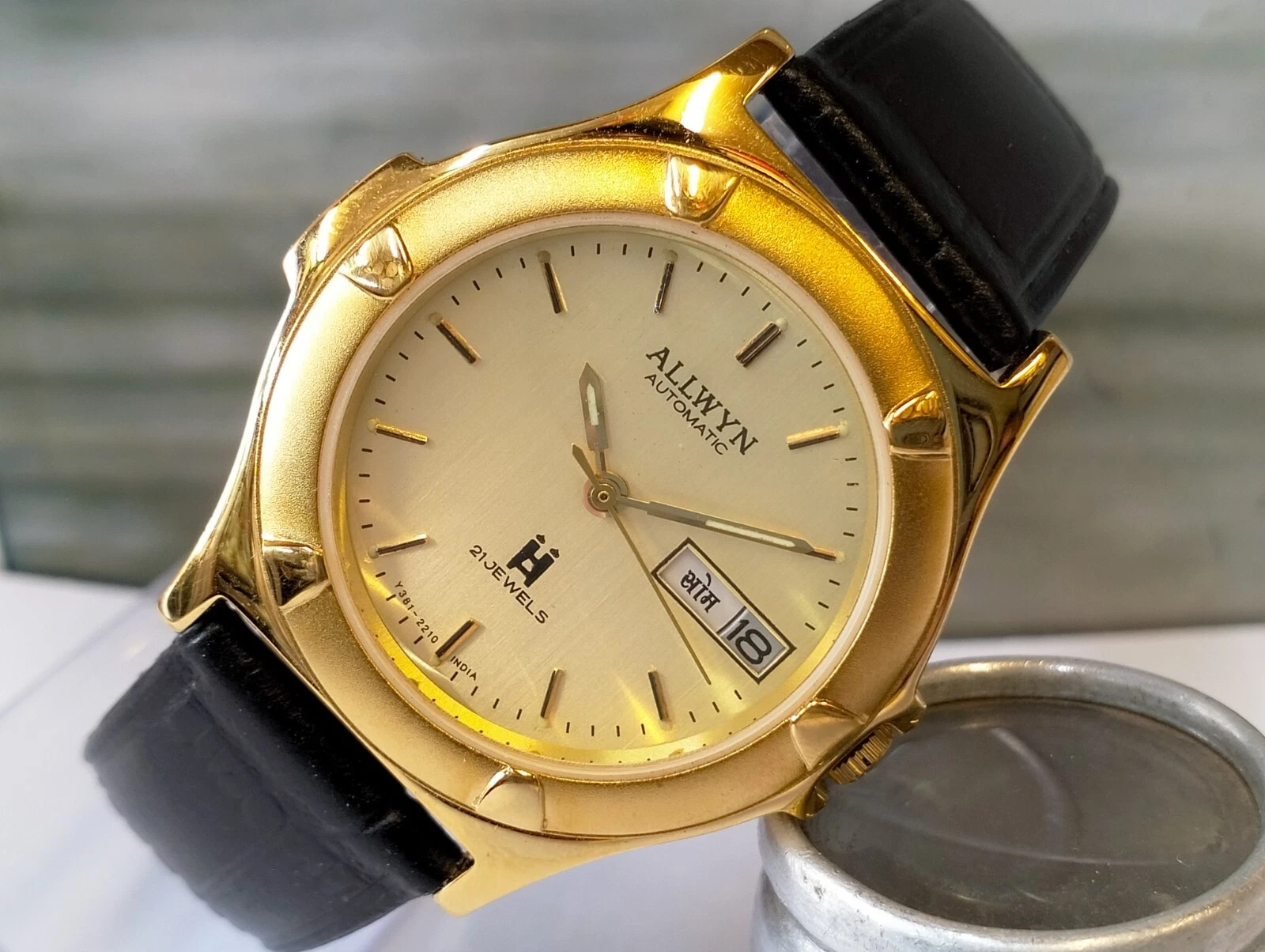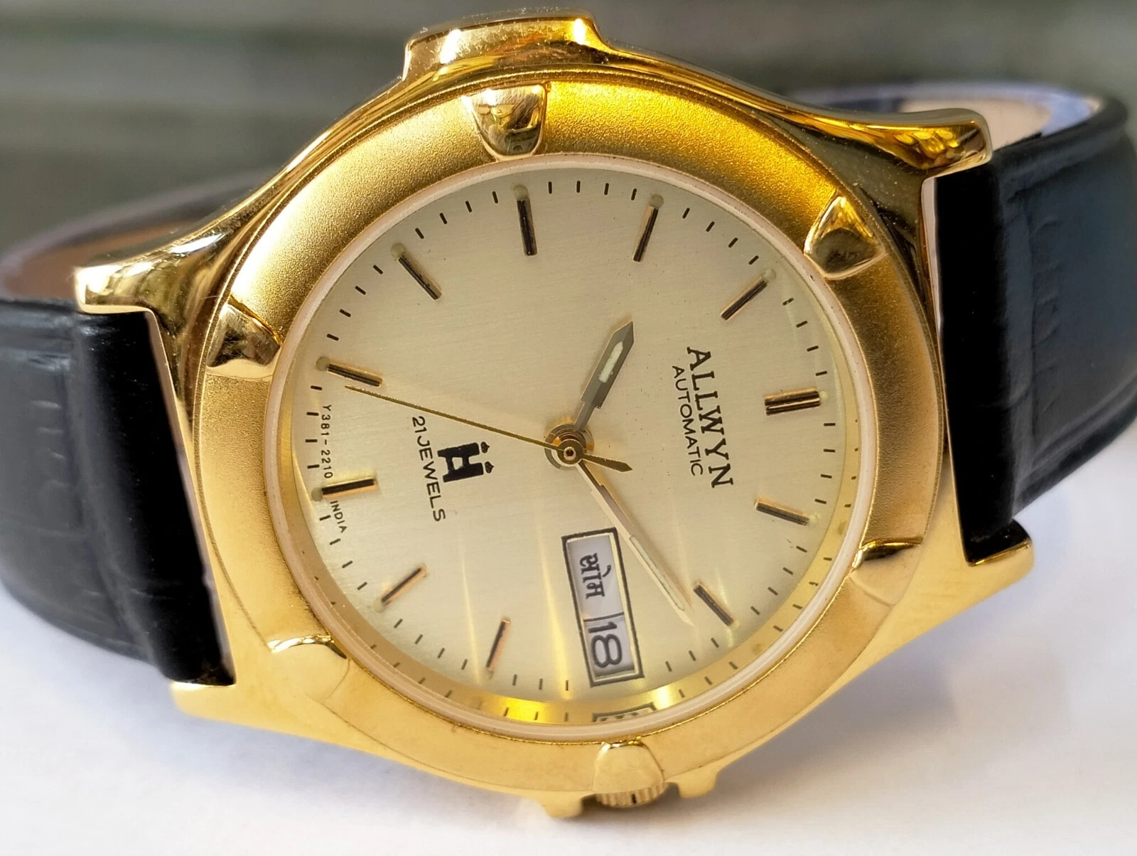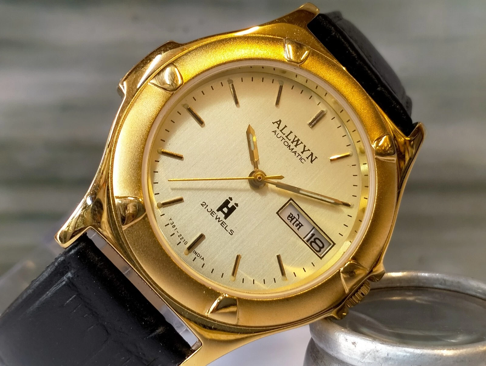 ORIGINAL ALLWYN AUTOMATIC 21J NOS GOLD DIAL Y381-8460 INDIA MEN'S FULL WORKING