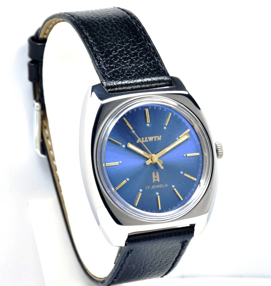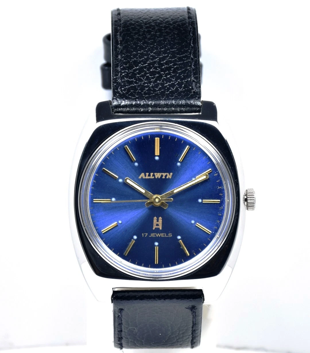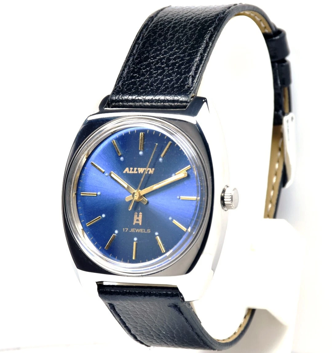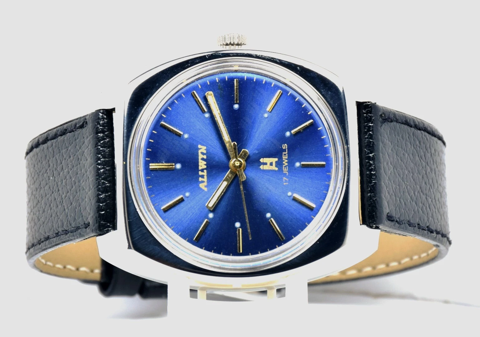 Rare Allwyn Blue Face 17 Jewels Men's Hand Winding Wrist Watch Case 37 mm