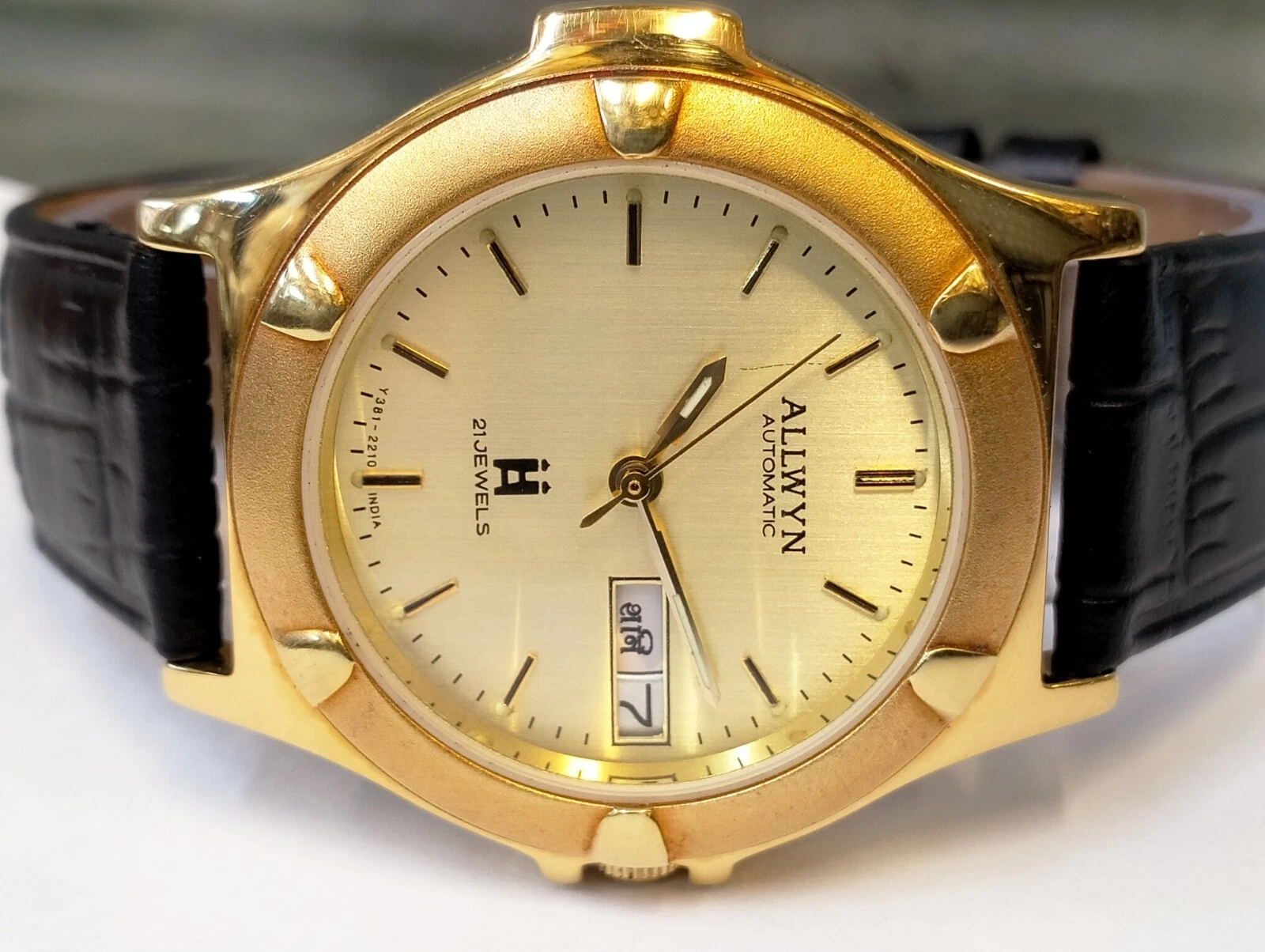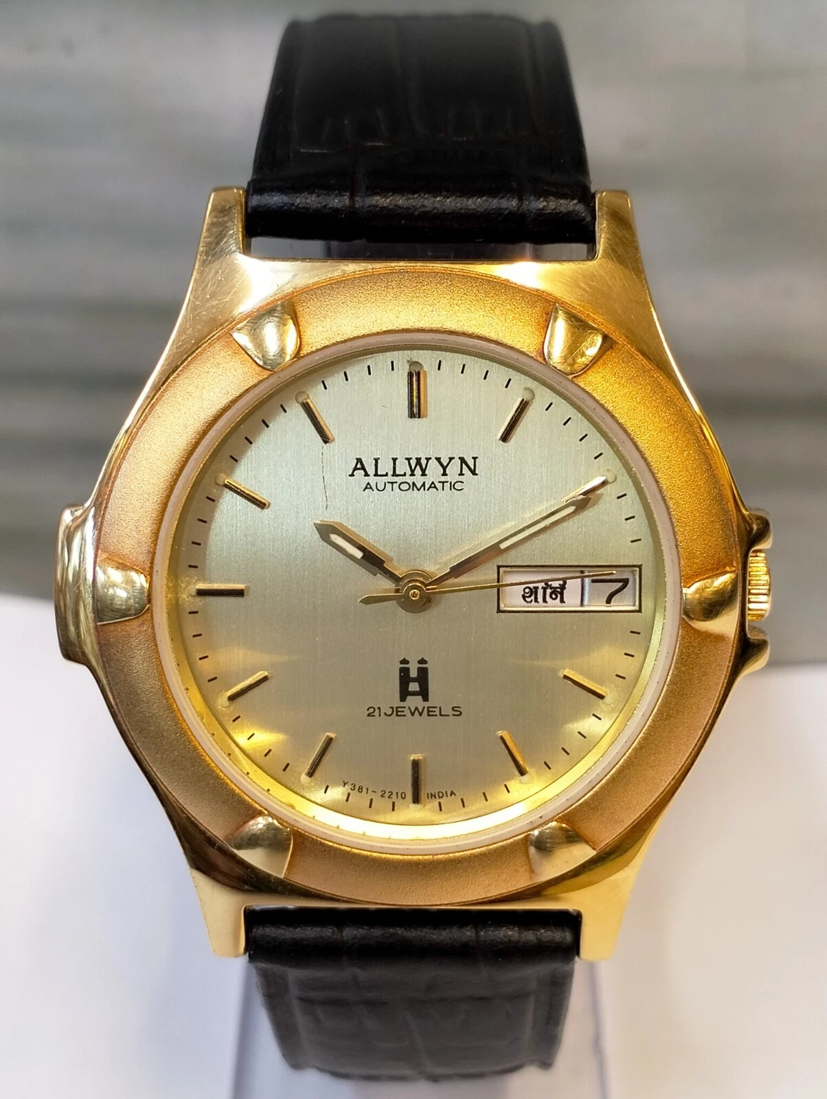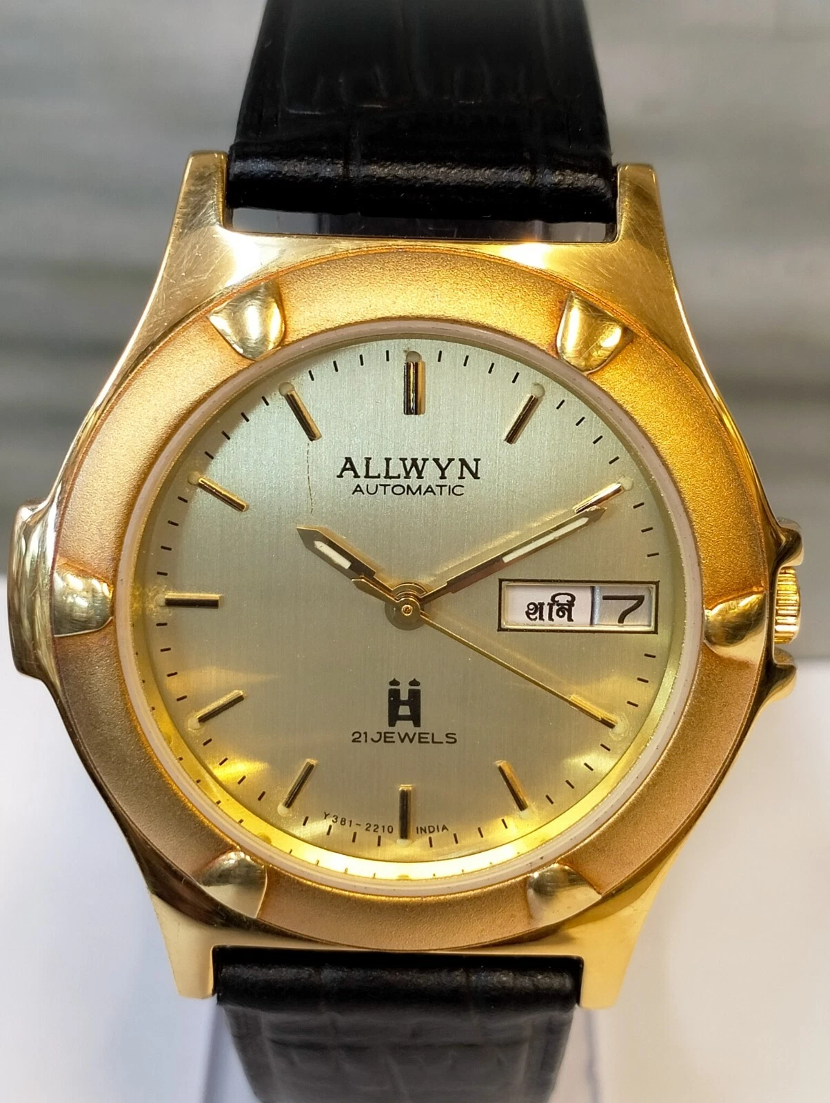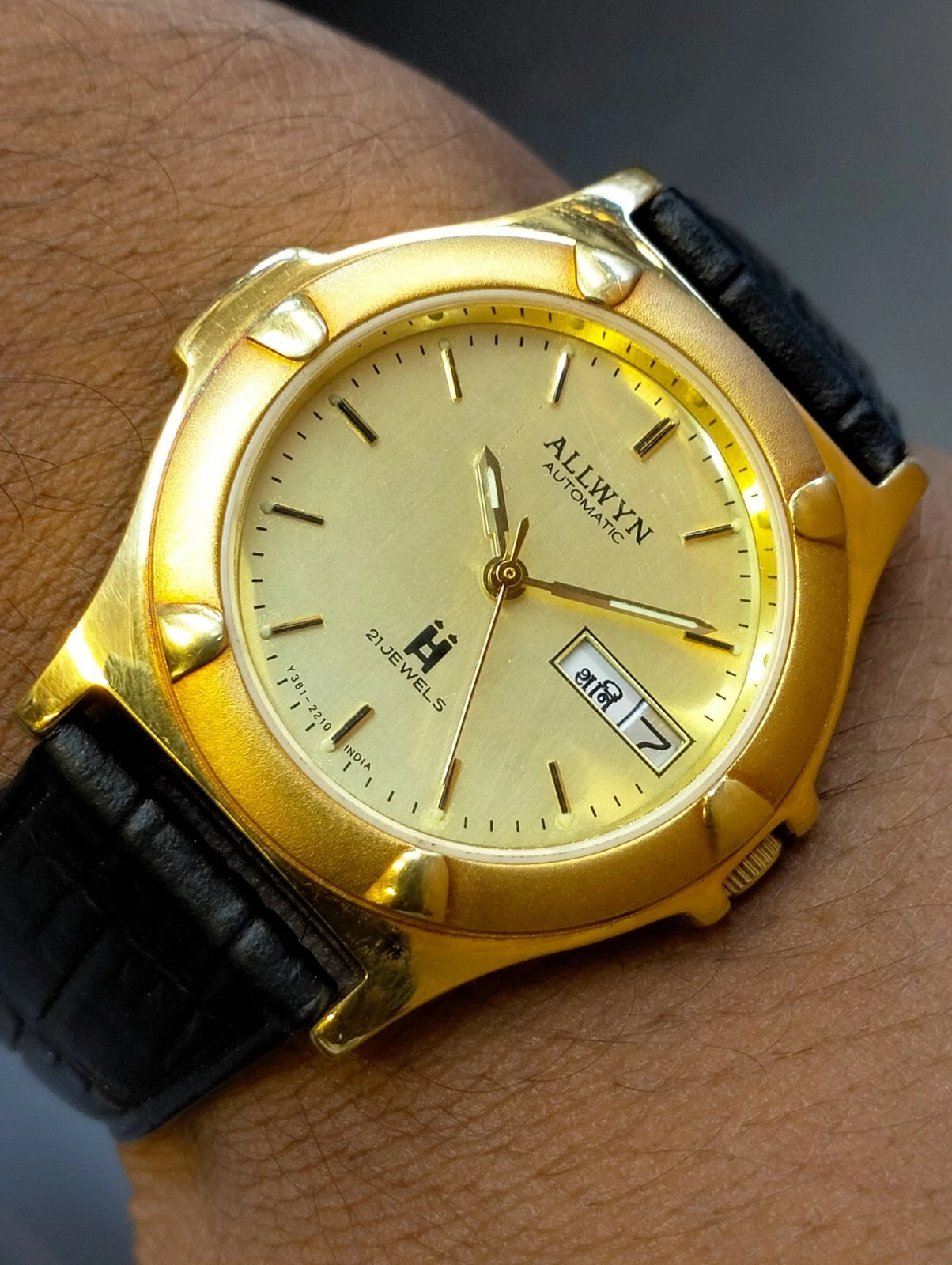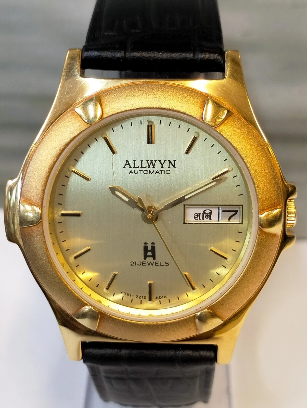 ORIGINAL ALLWYN AUTOMATIC NOS 21J GOLD DIAL Y381-8460 INDIA MEN'S FULL WORKING