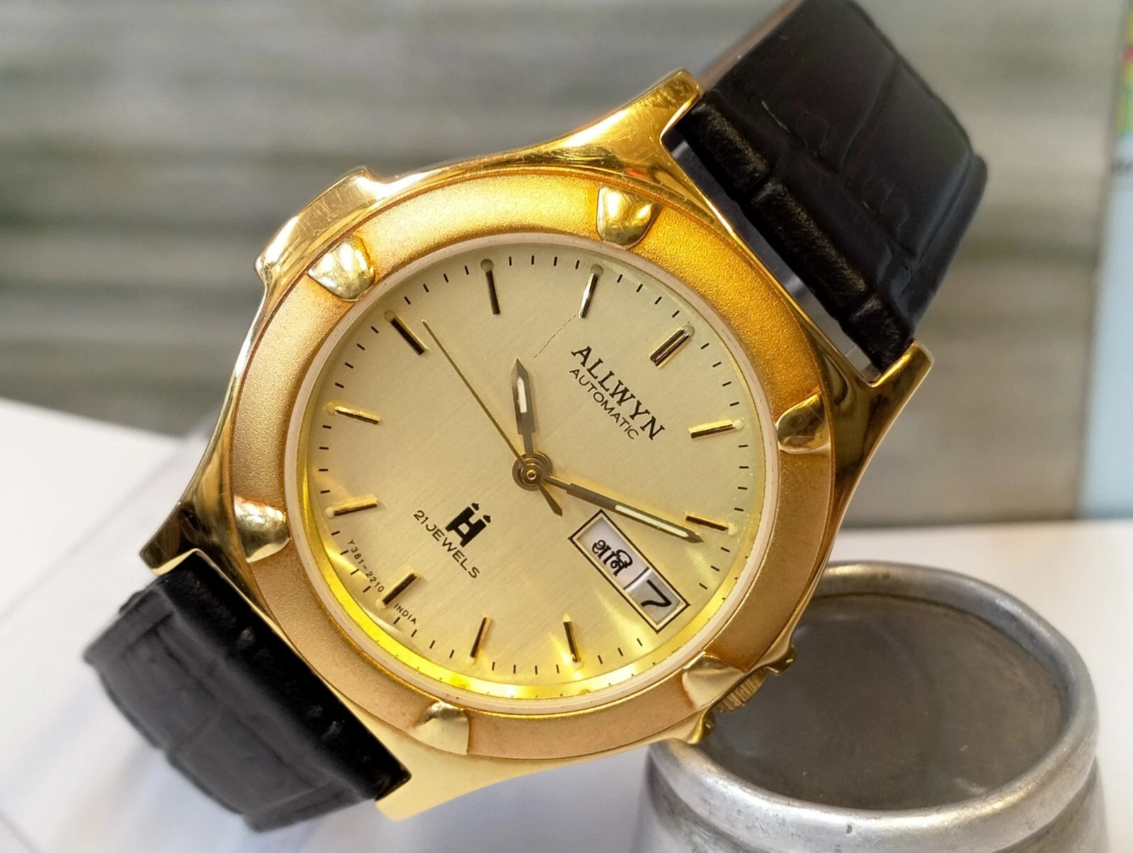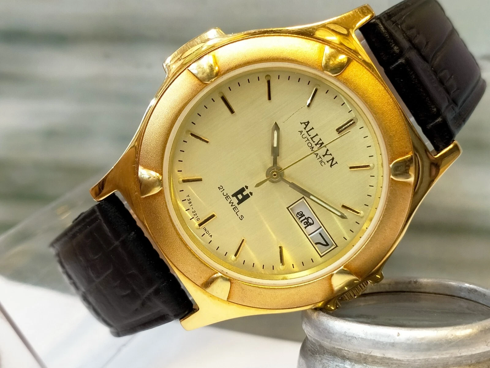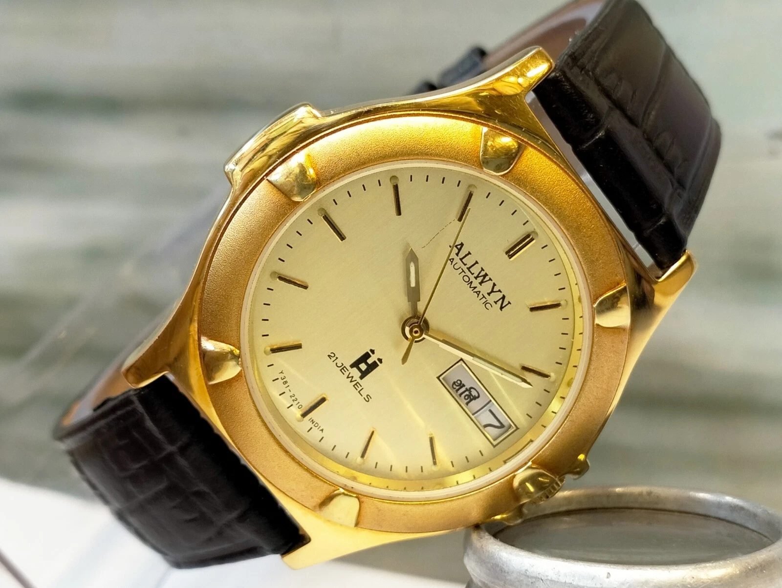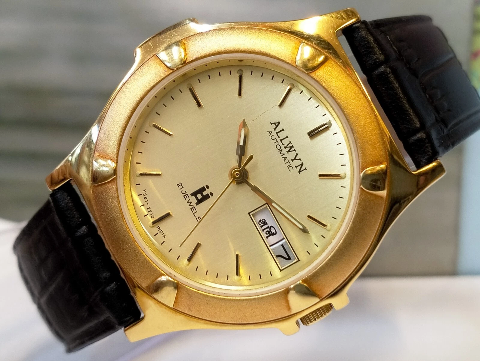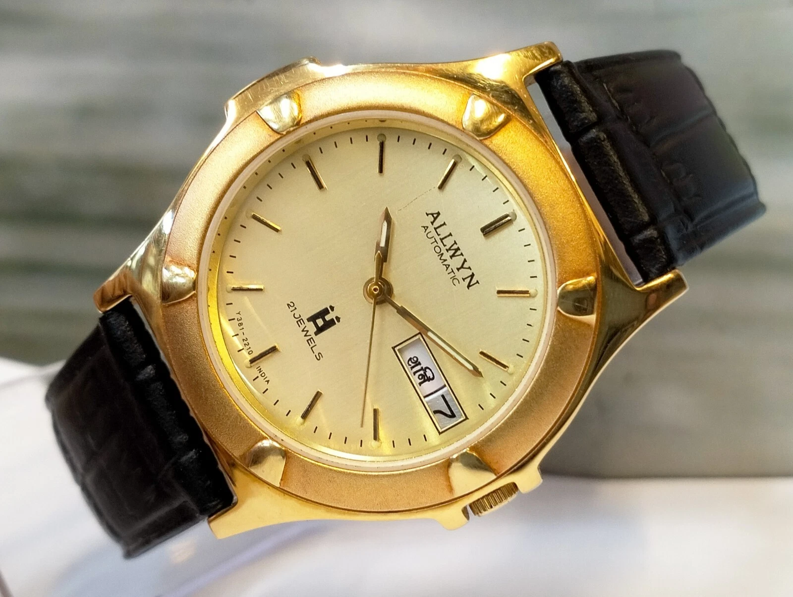 ORIGINAL ALLWYN AUTOMATIC NOS 21J GOLD DIAL Y381-8460 INDIA MEN'S FULL WORKING