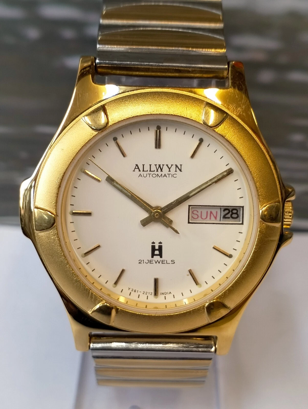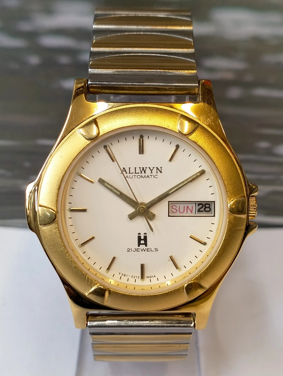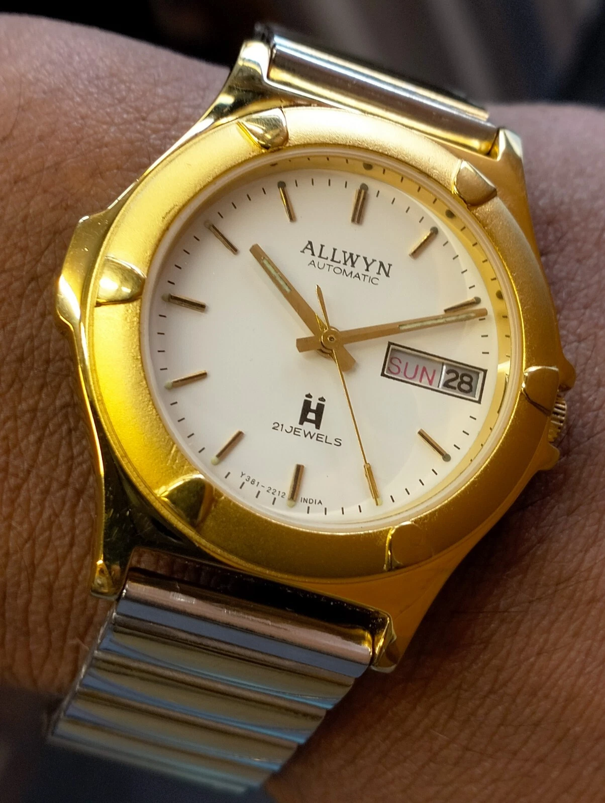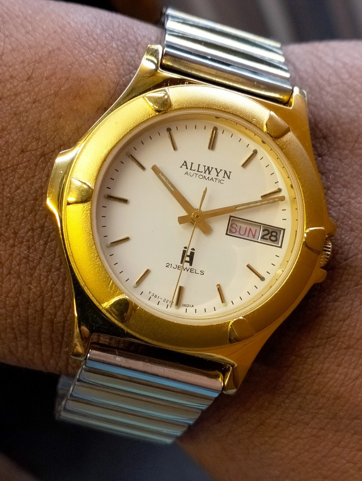 ALLWYN 21 JEWELS AUTOMATIC NOS WHITE DIAL Y381-8460 INDIA MEN'S FULL WORKING VTG