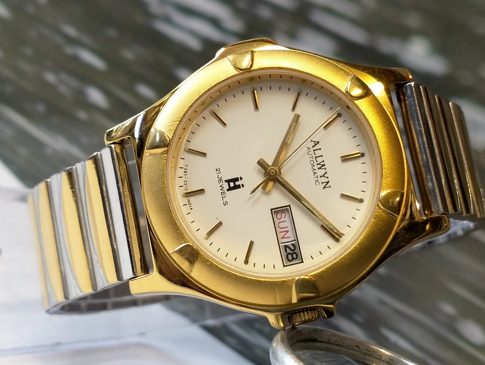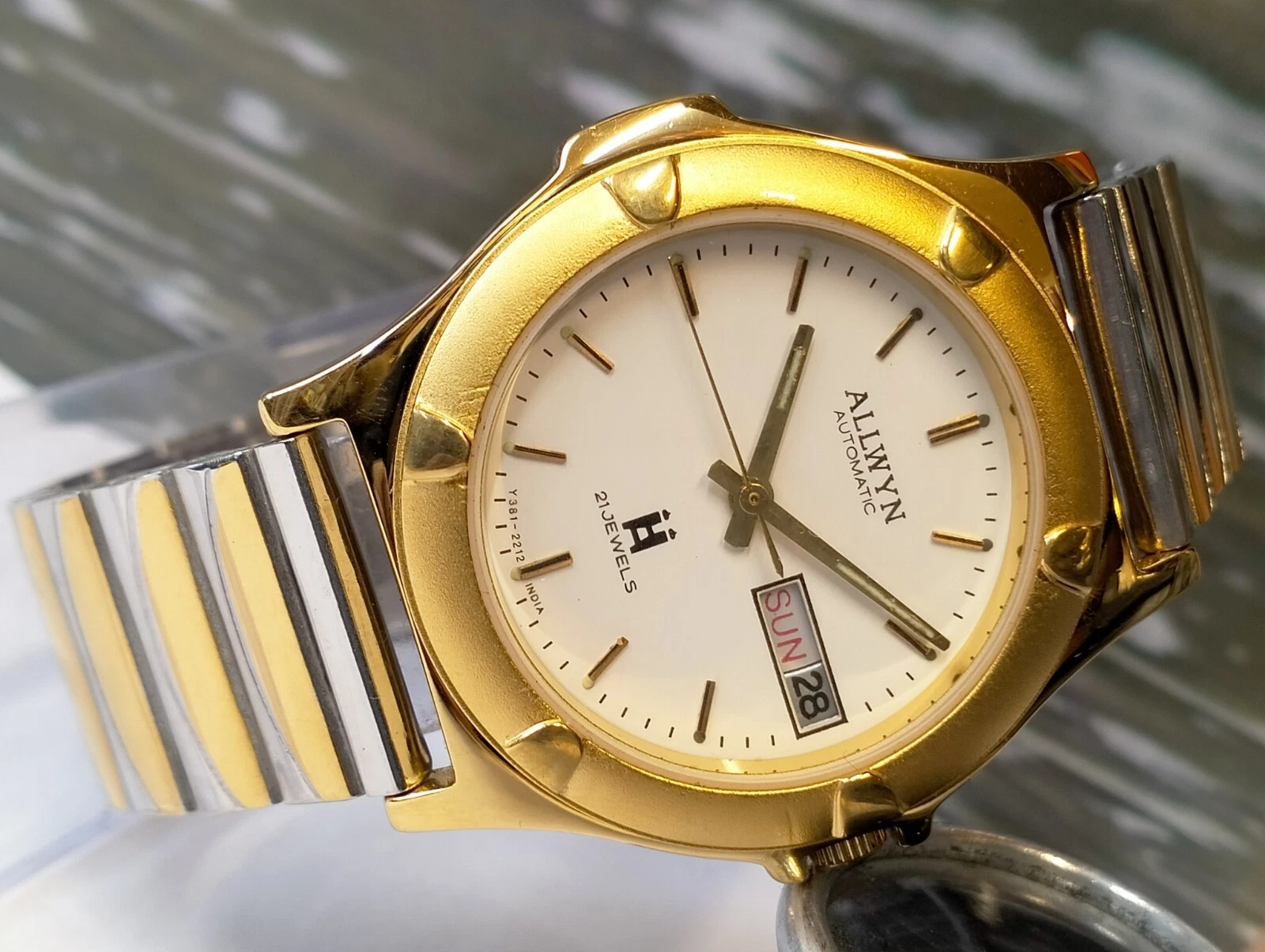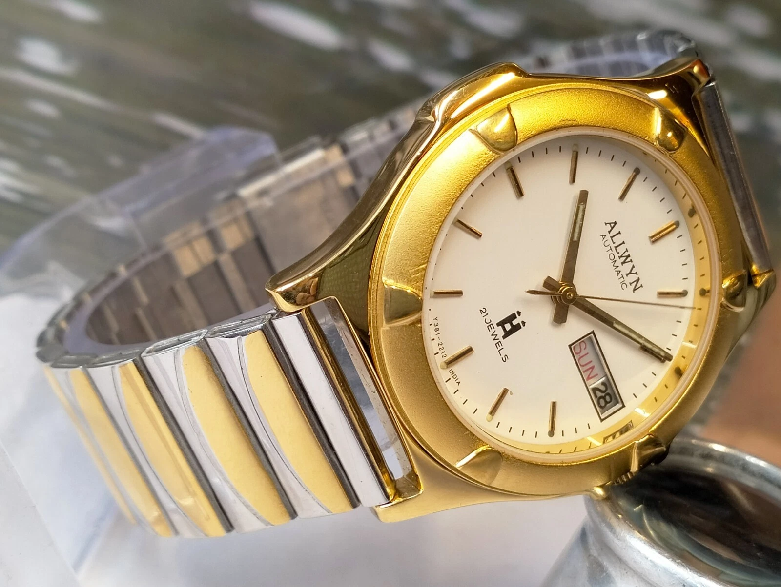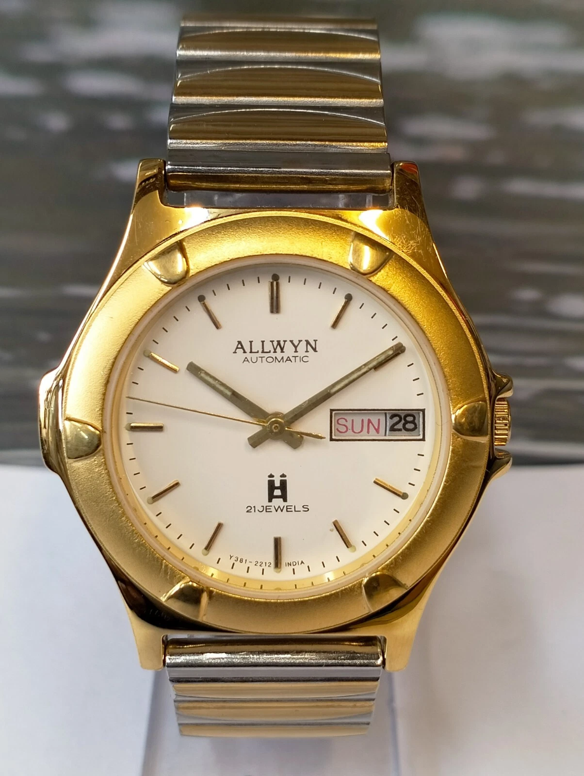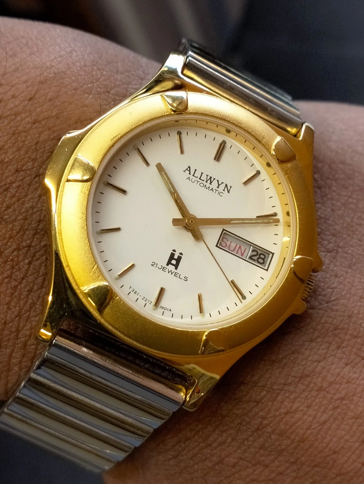 ALLWYN 21 JEWELS AUTOMATIC NOS WHITE DIAL Y381-8460 INDIA MEN'S FULL WORKING VTG