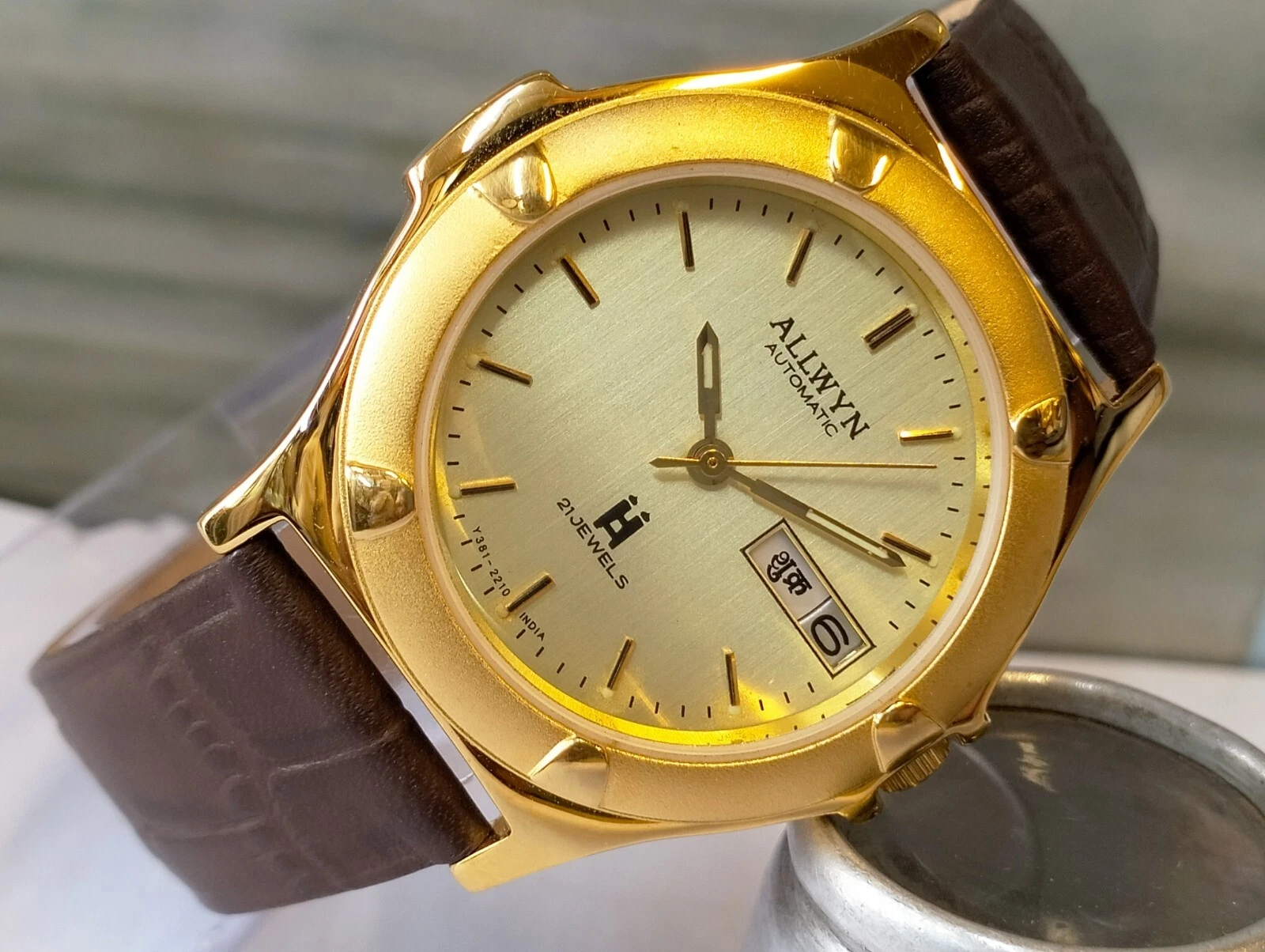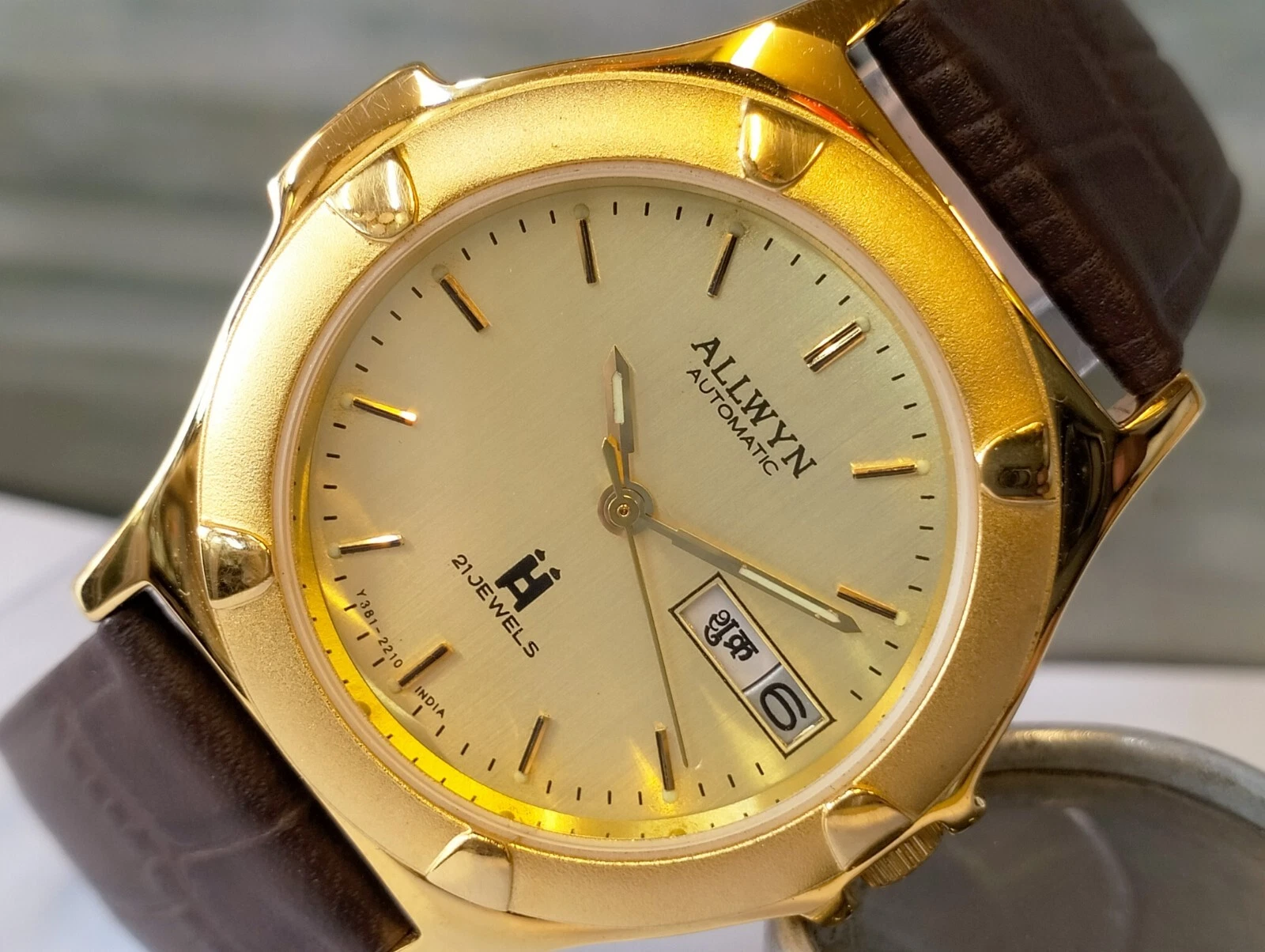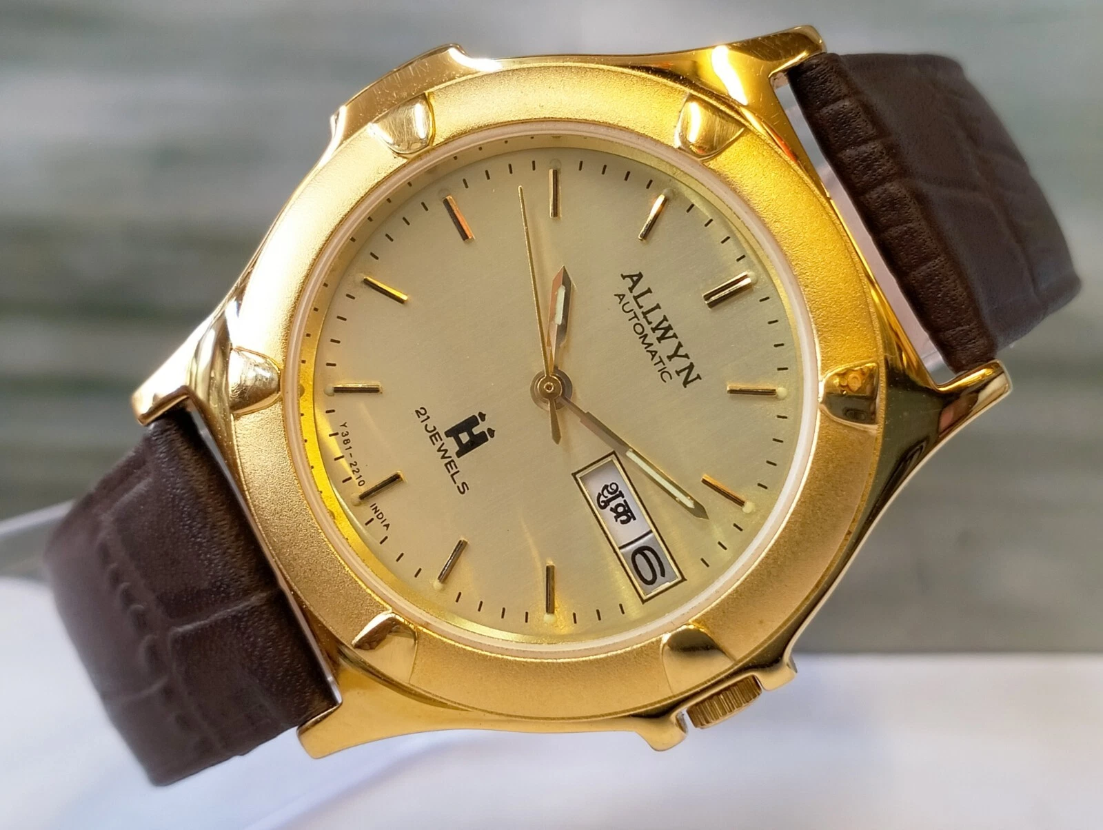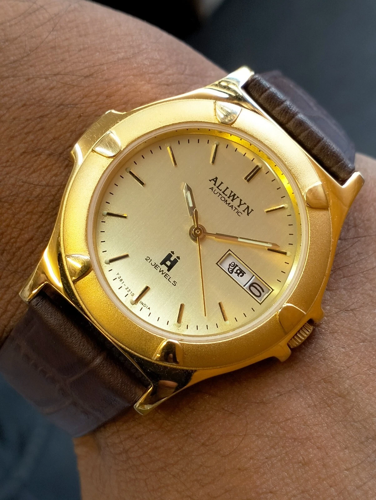 ORIGINAL ALLWYN AUTOMATIC NOS 21J GOLD DIAL Y381-8460 INDIA MEN'S FULL WORKING