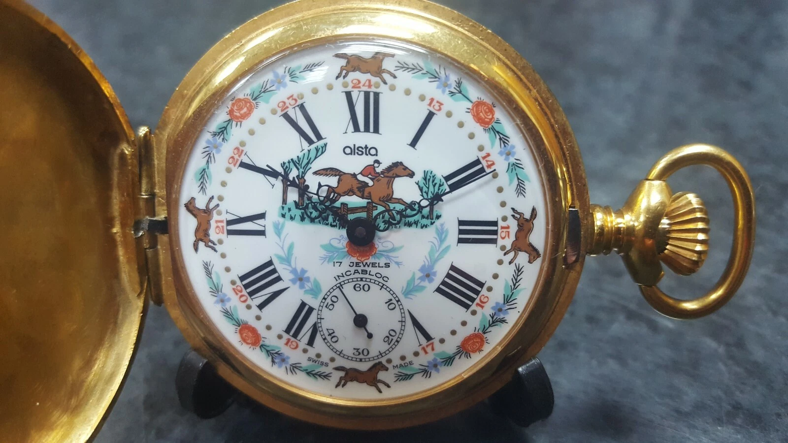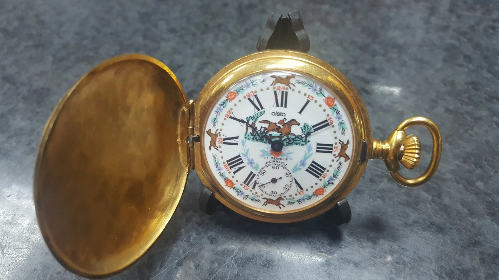 ALSTA VINTAGE Electro Plated Gold Case Unitas 6497 Equestrian Pocket Watch