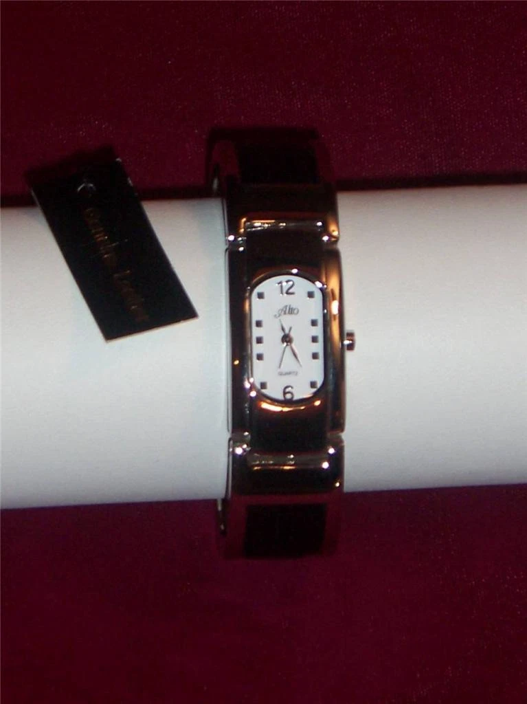 Alto Oval Rectangular Case Silvertone with Black Leather Cuff and Link Band NEW