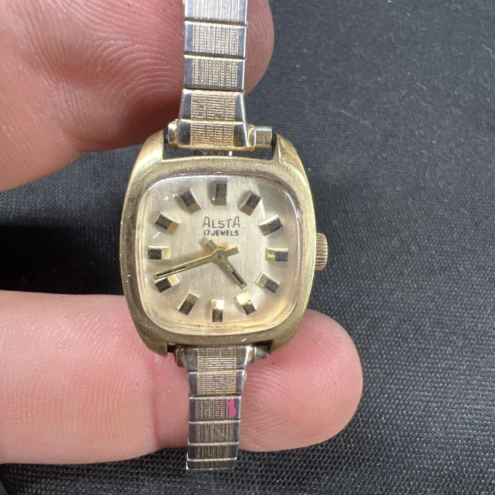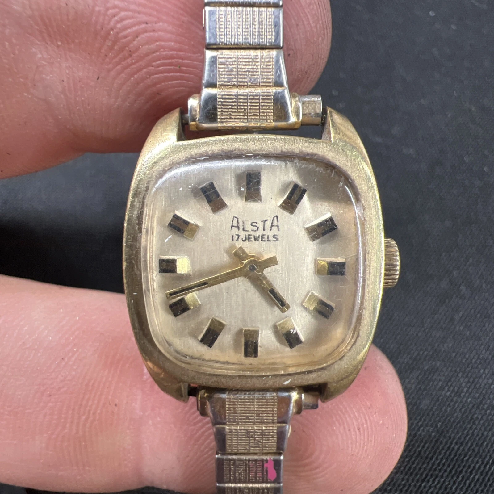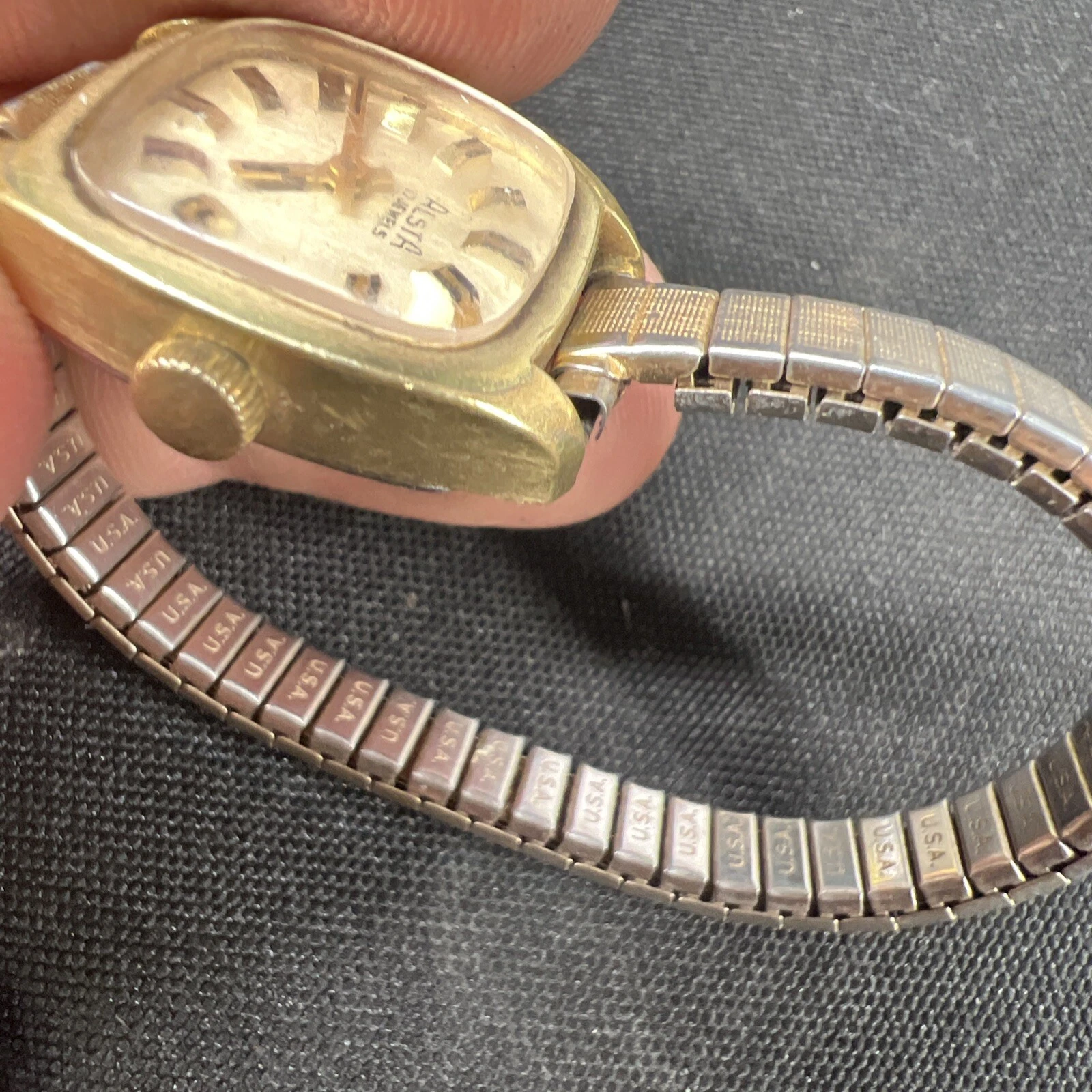 Vtg ALSTA 17 Jewel Gold Women’s Watch Manual Wind 20mm USA Stretch Band