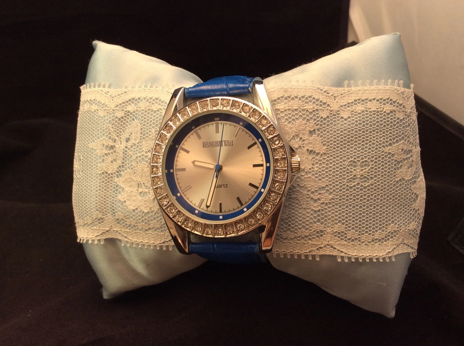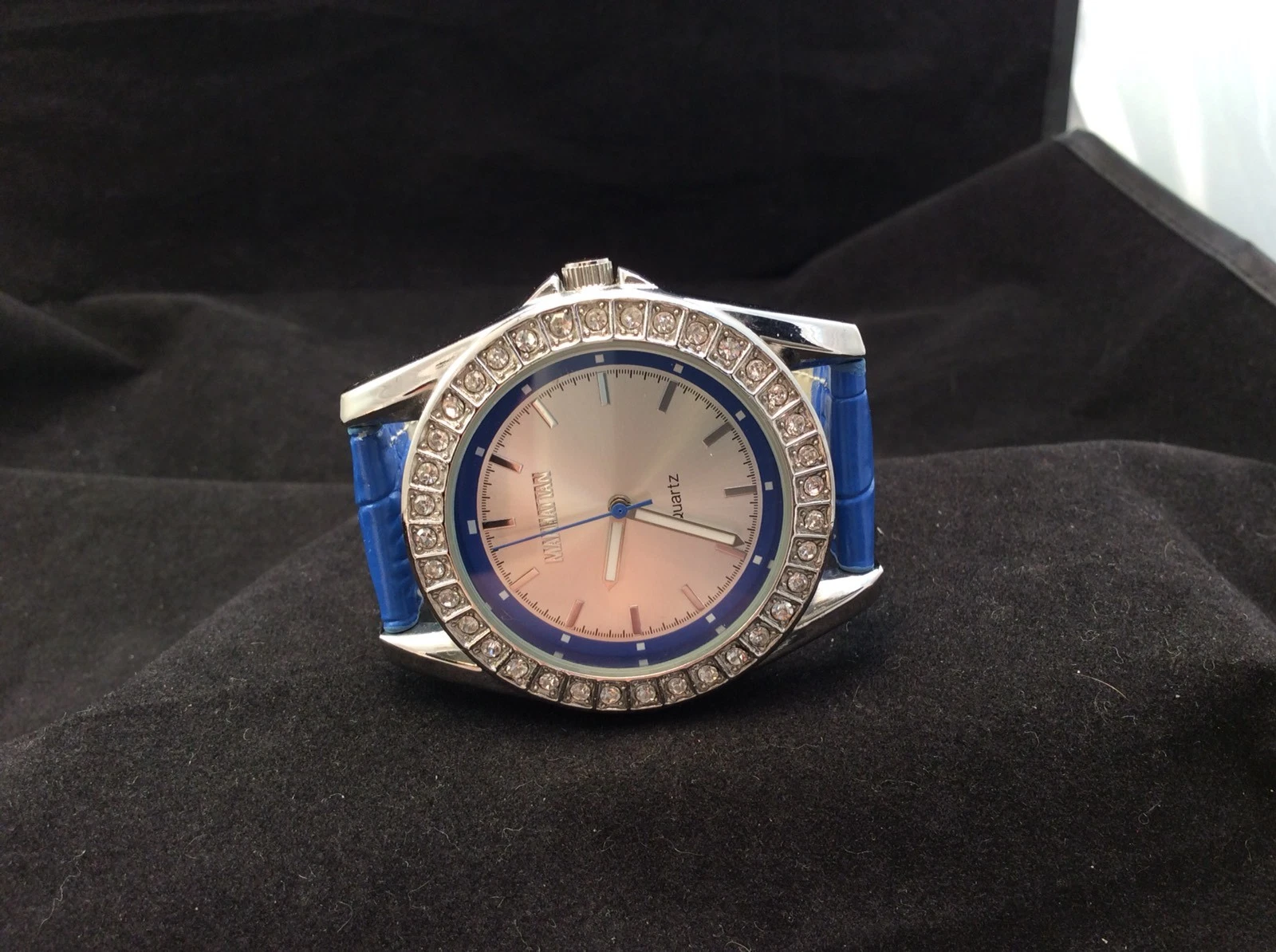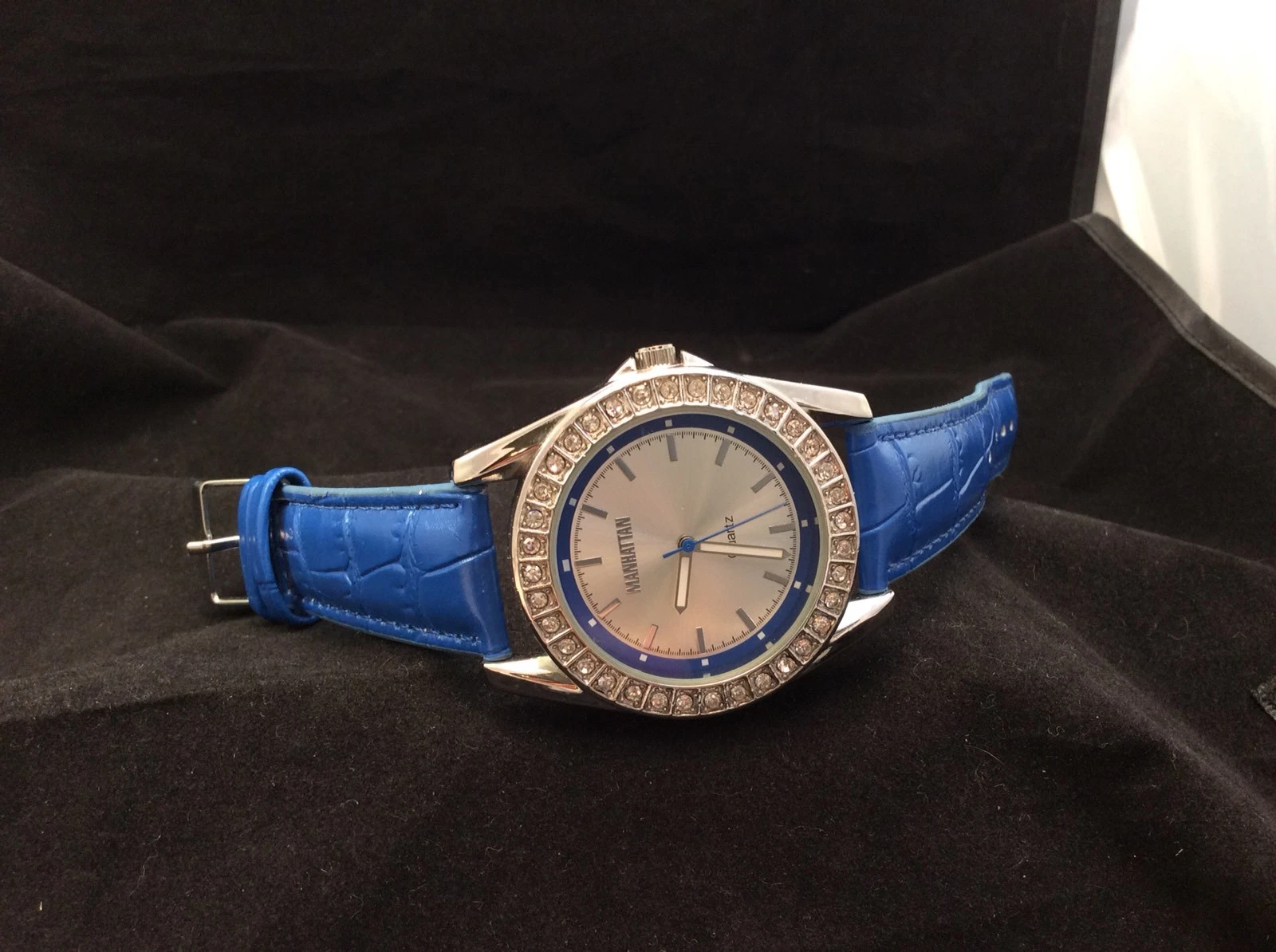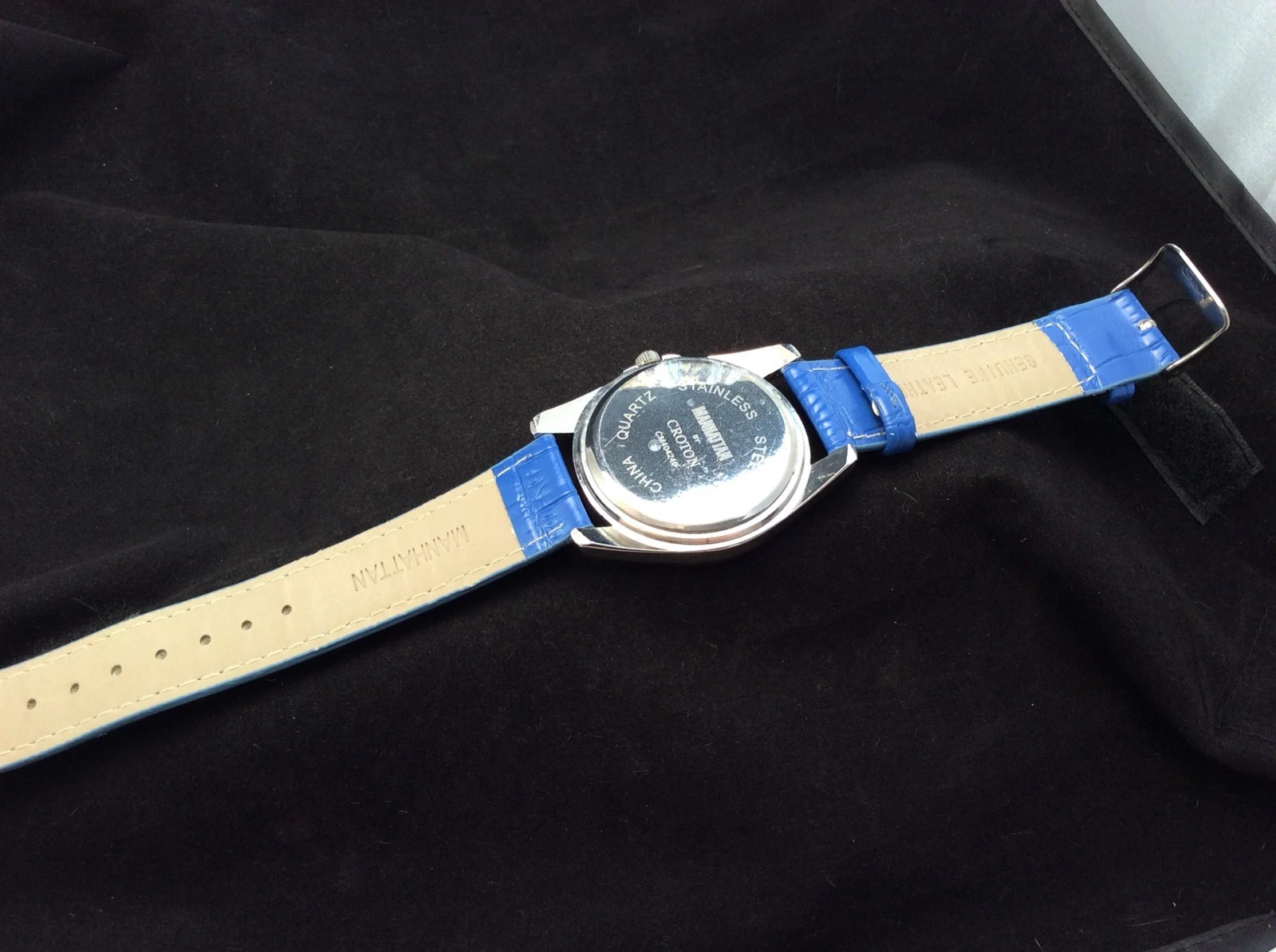 Manhattan By Croton Crystal Bezel Blue Leather Rhinestone Ladies Quartz Watch