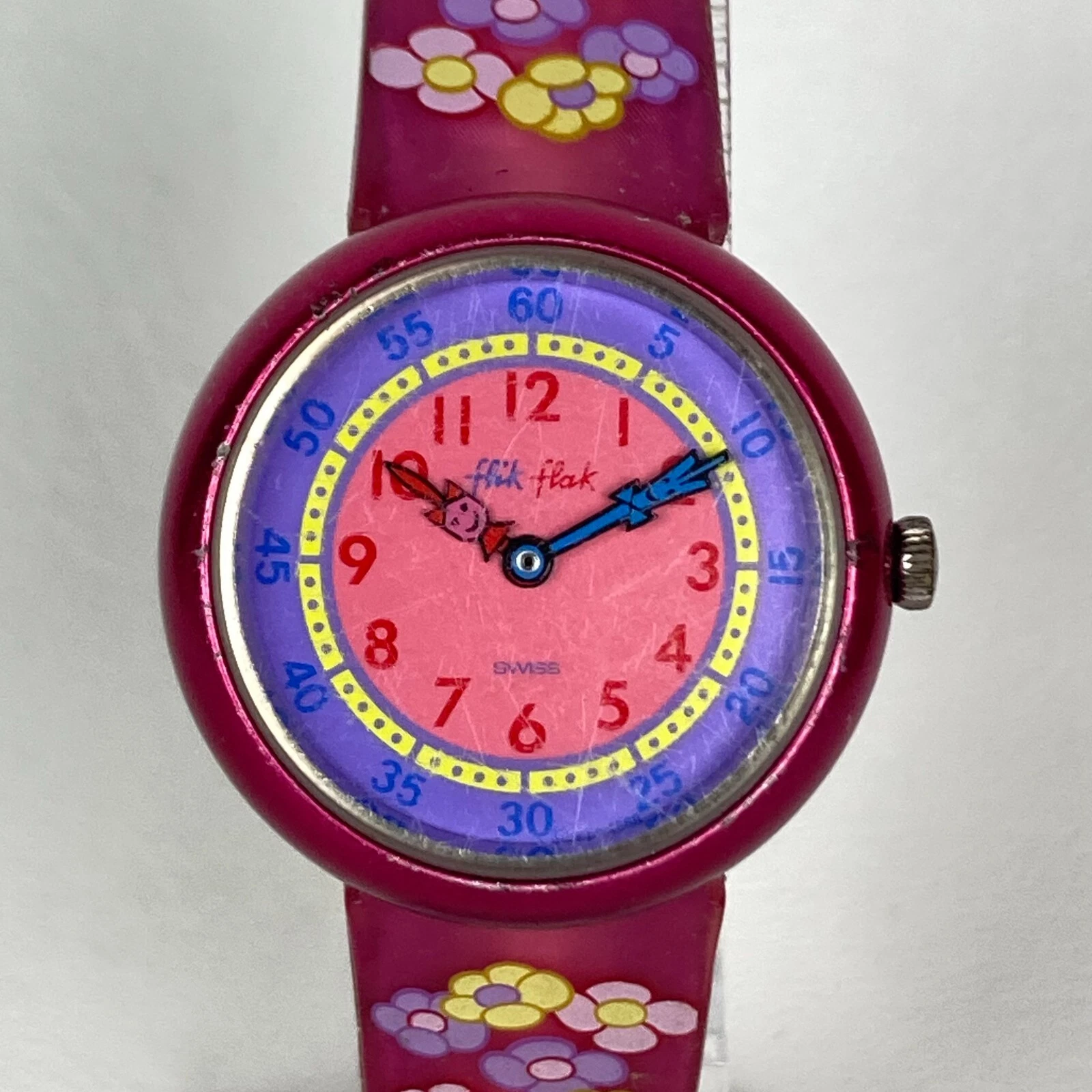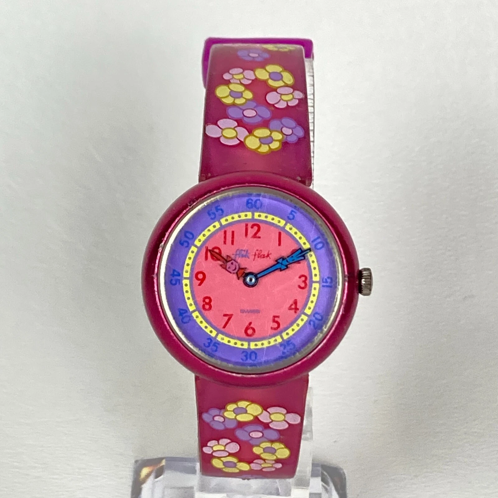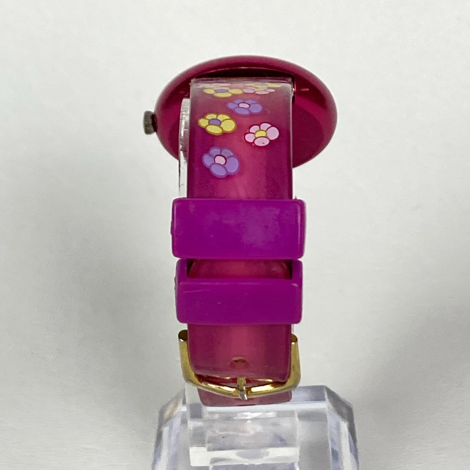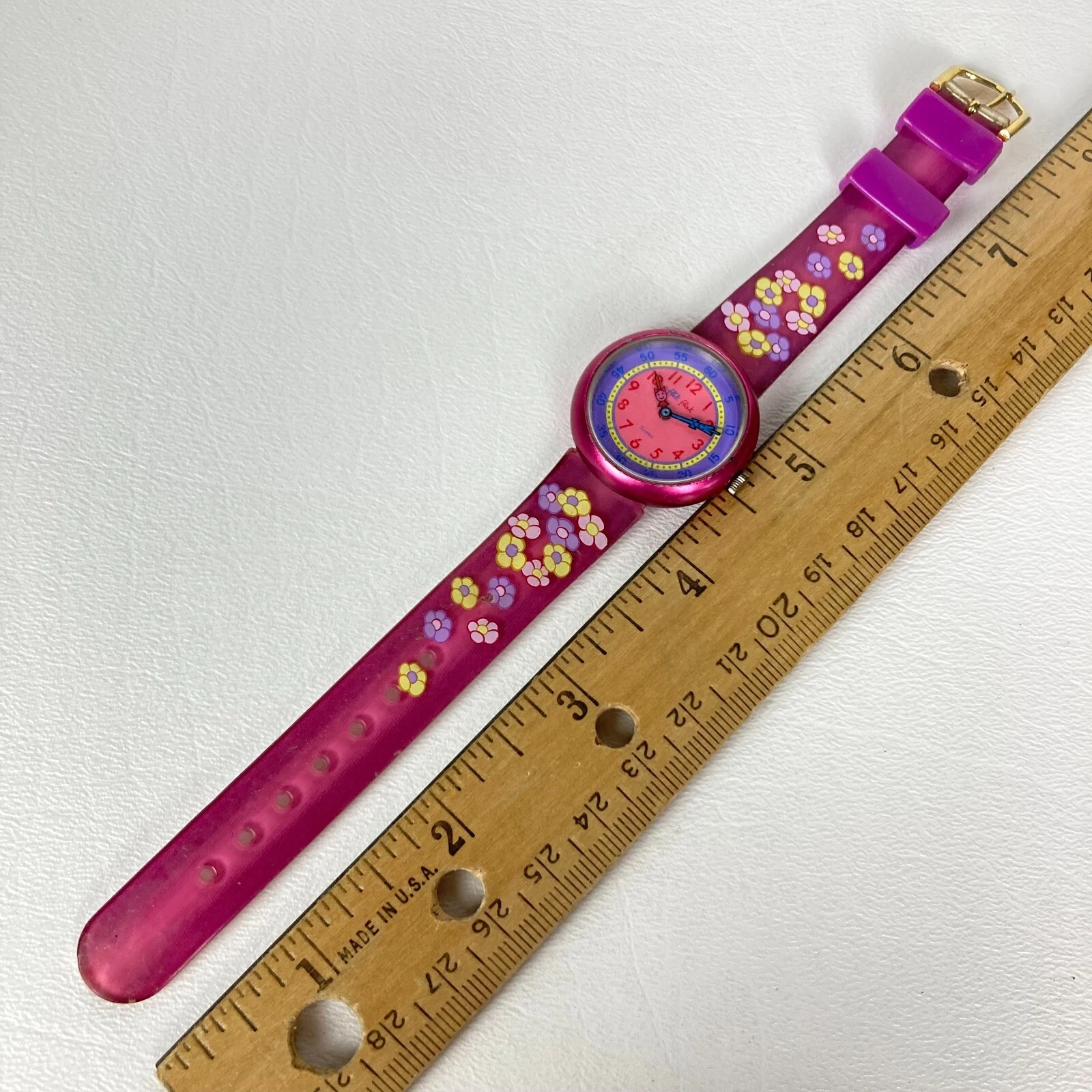 Vtg Flik Flak Swatch Watch Kids Youth Pink Purple Flowers New Battery 7.5" 1988