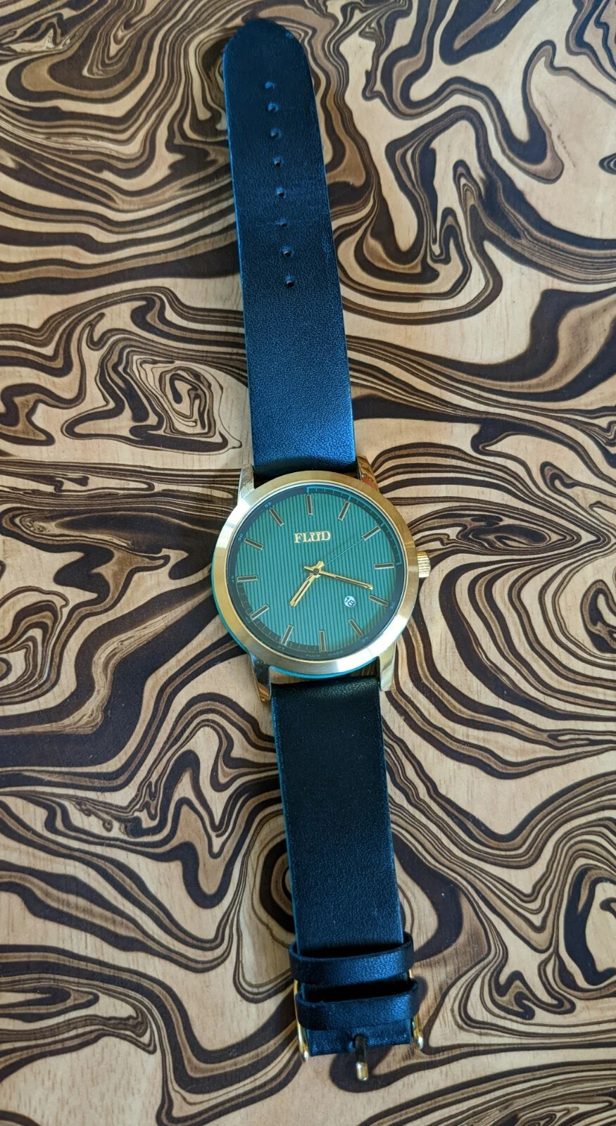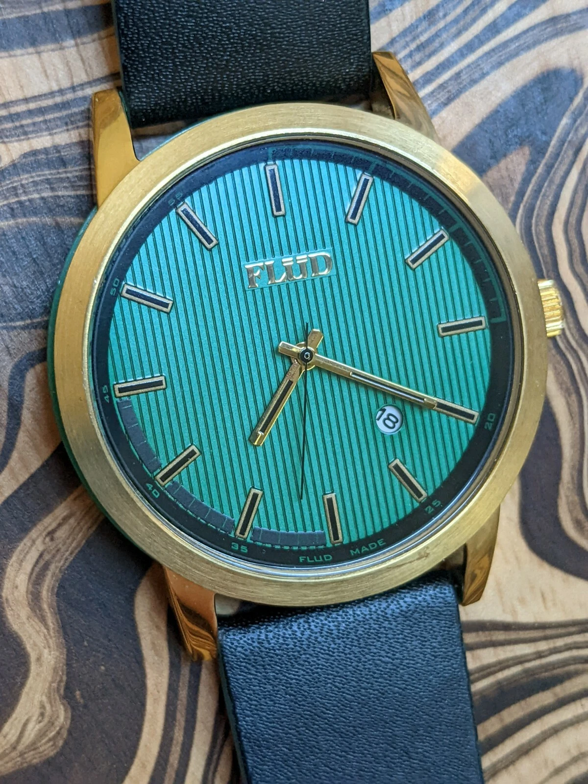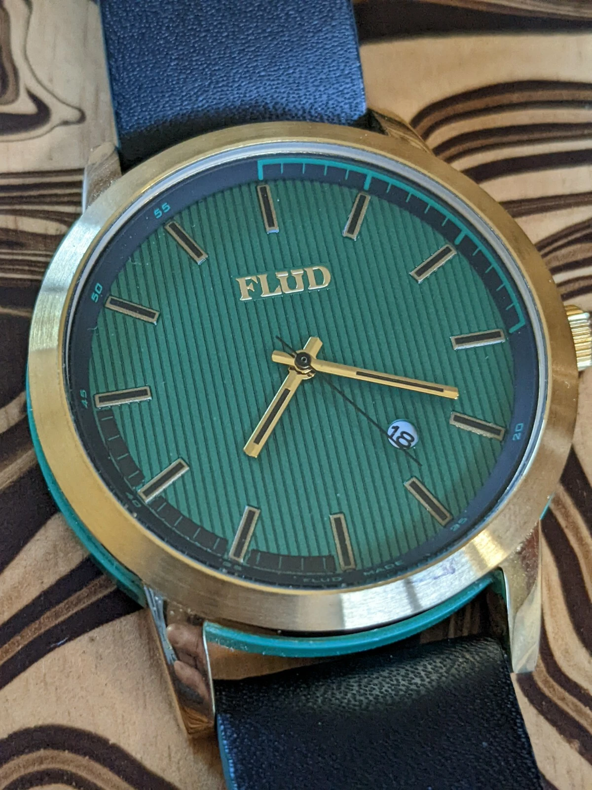 FLUD Green Face Watch, second hand, date window, stainless steel, japan mvmt