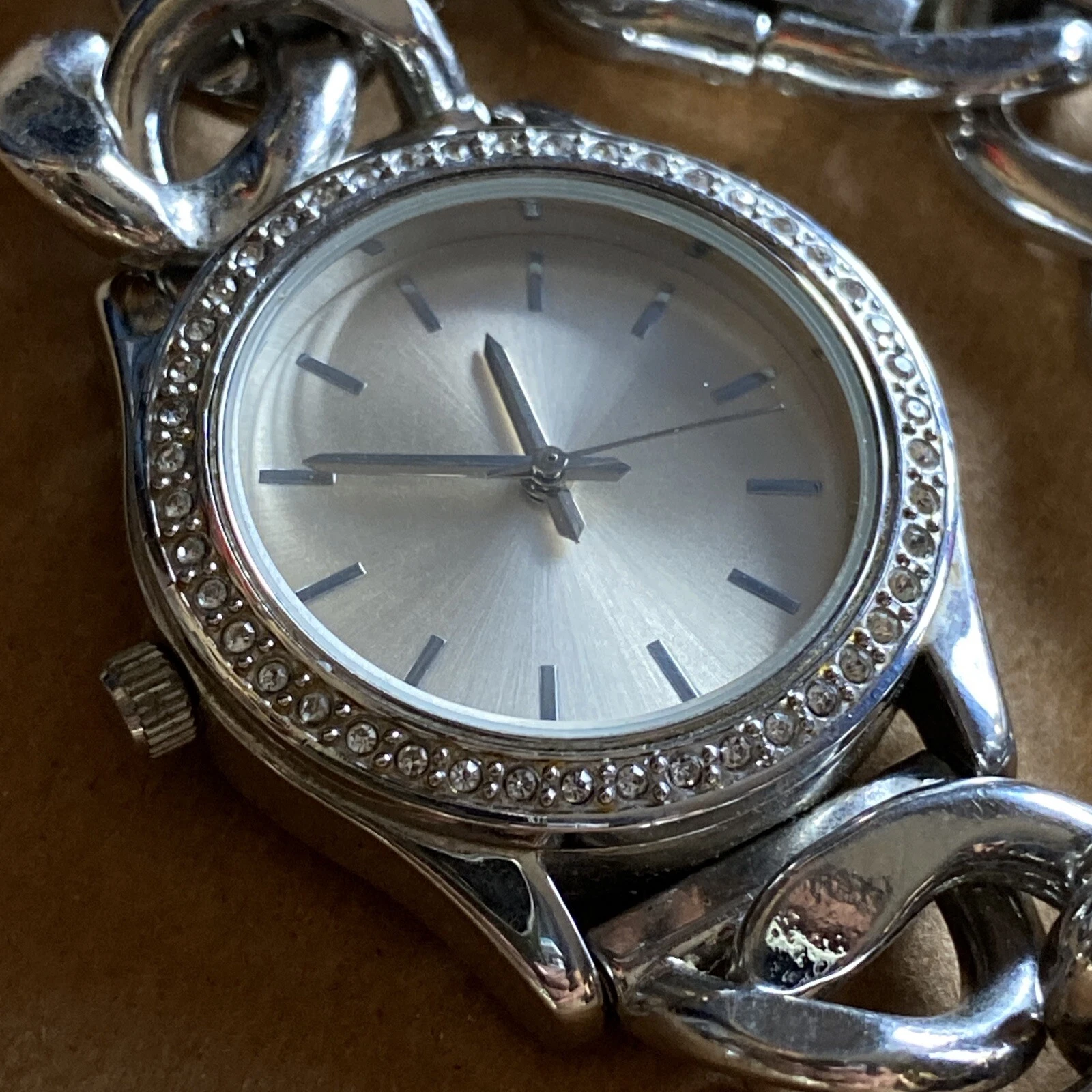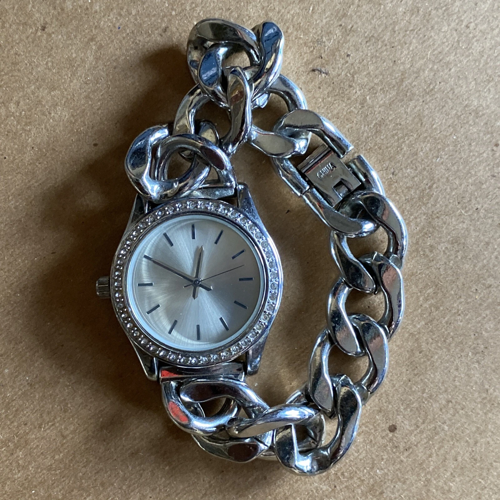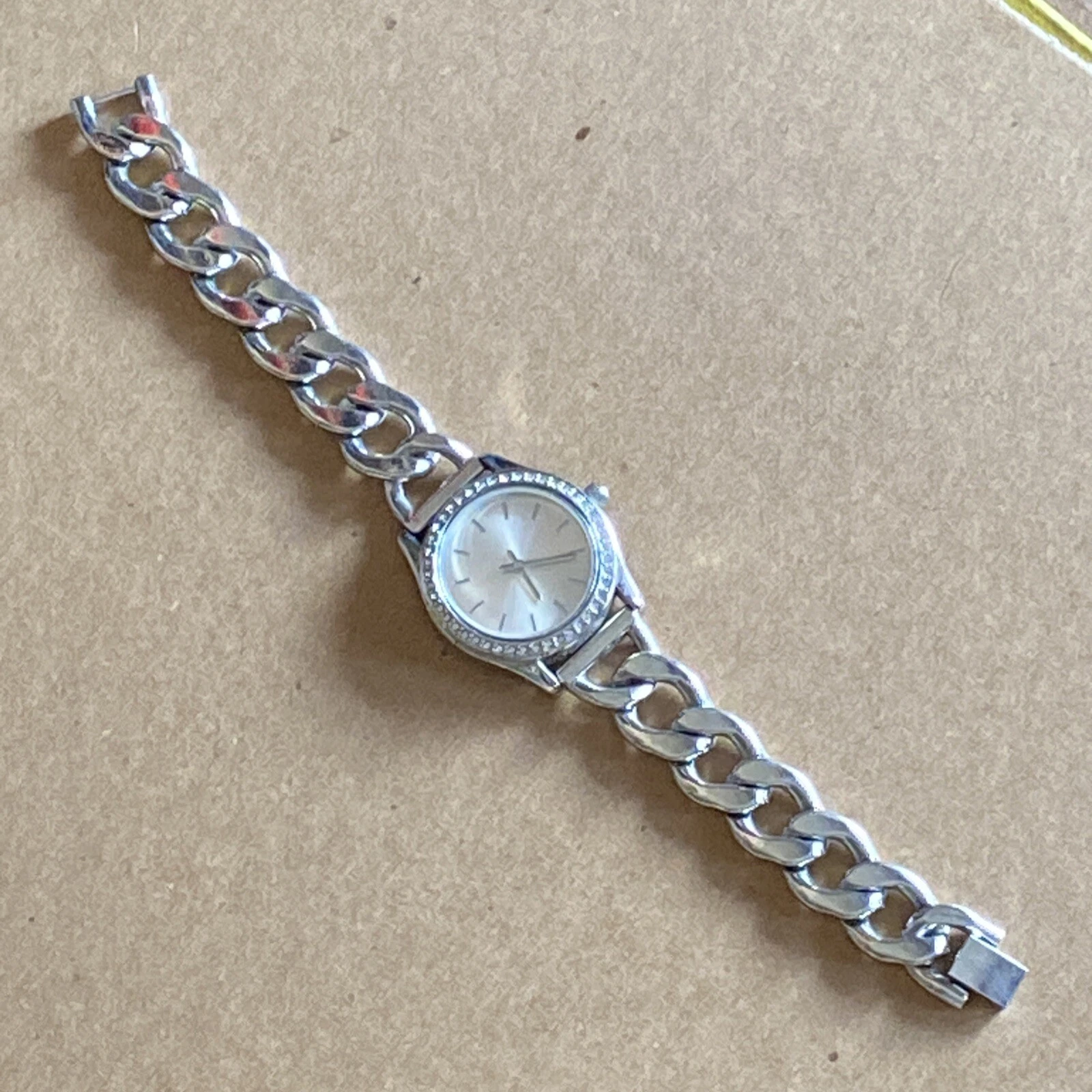 FMD Silver Tone Rhinestone Bezel Cuban Link Bracelet Women’s Quartz Watch