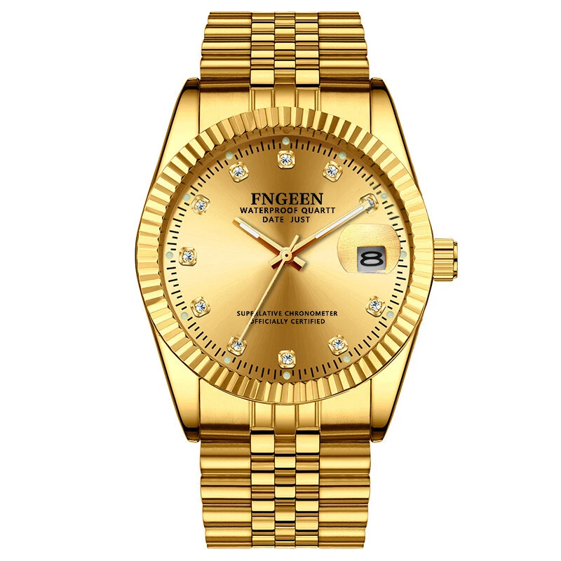 FNGEEN MEN GENTS Gold Analogue Quartz Classic Stainless Steel Diamond Wristwatch