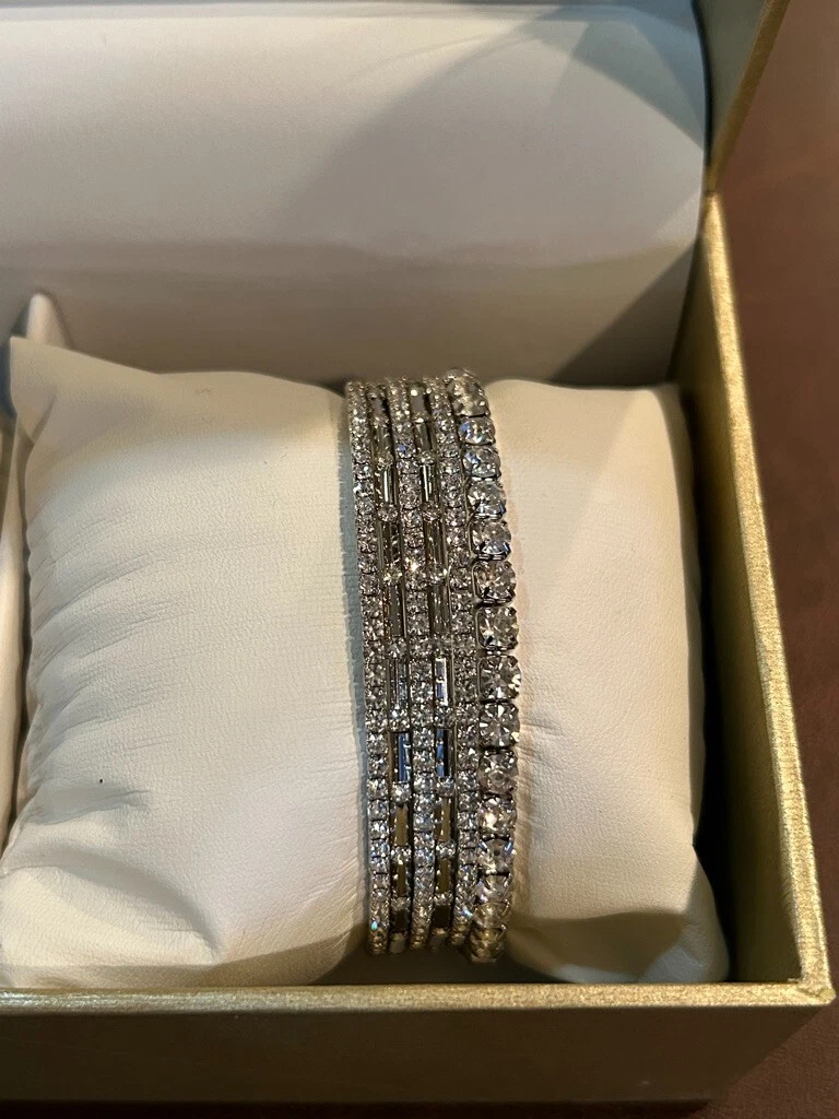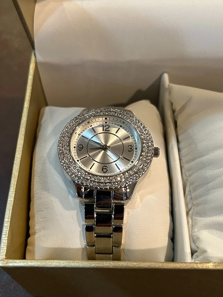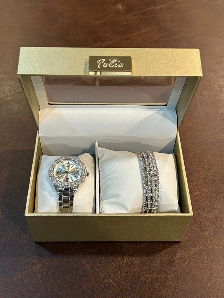 New! Silver Folio Women's Link Wrist Watch and Bracelet Set Rhinestones
