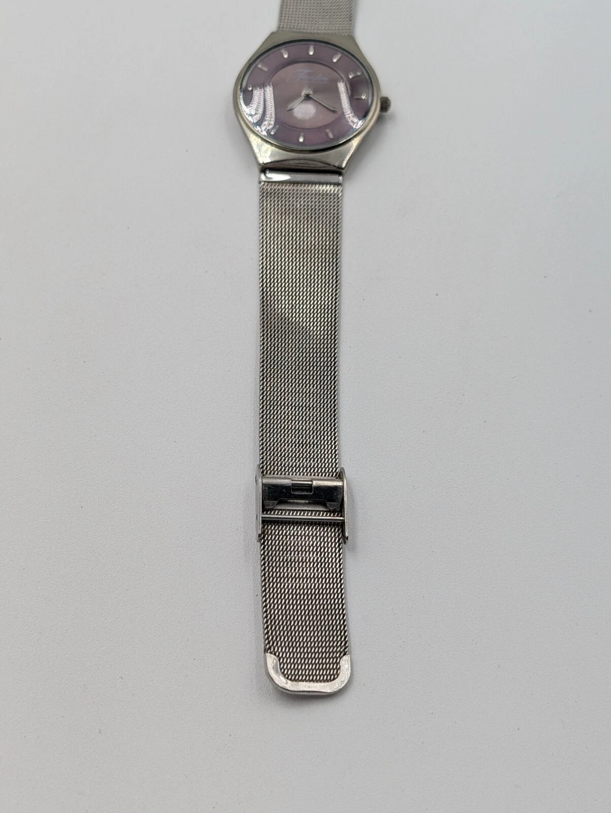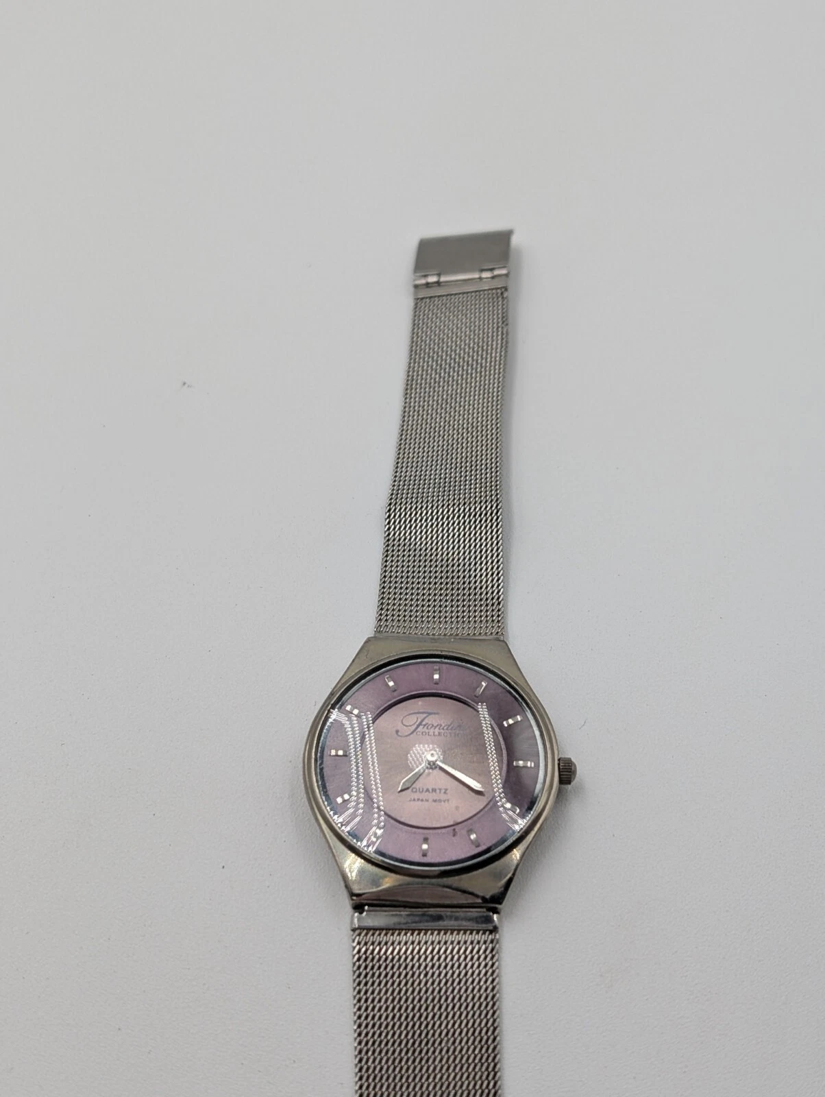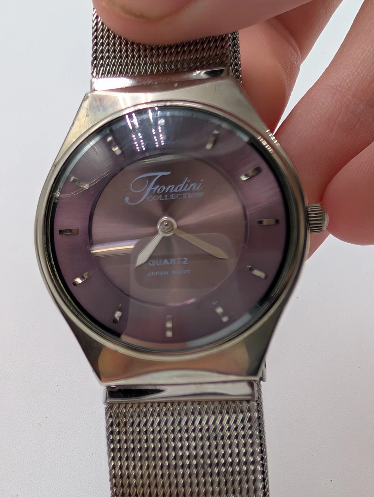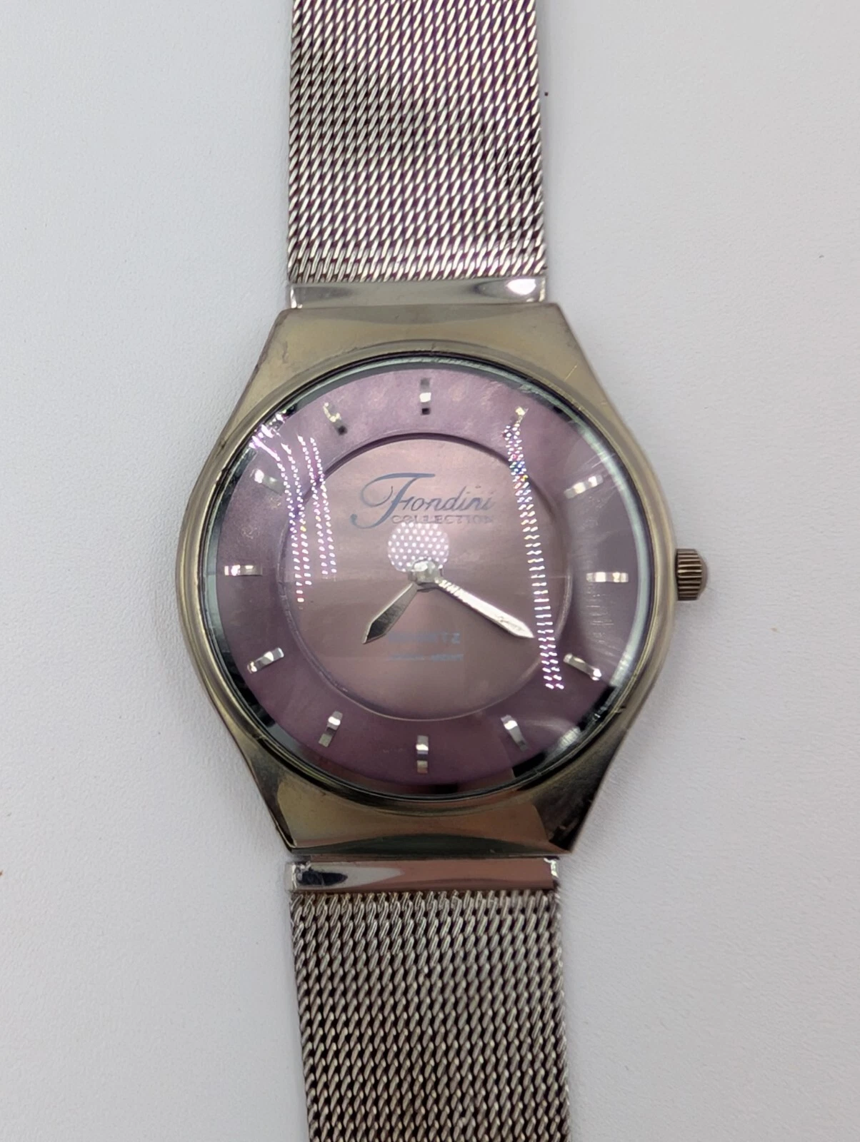 Vtg. Fondini Watch Quartz Silver Band/Case, Purple Face - Dead Battery/Untested!