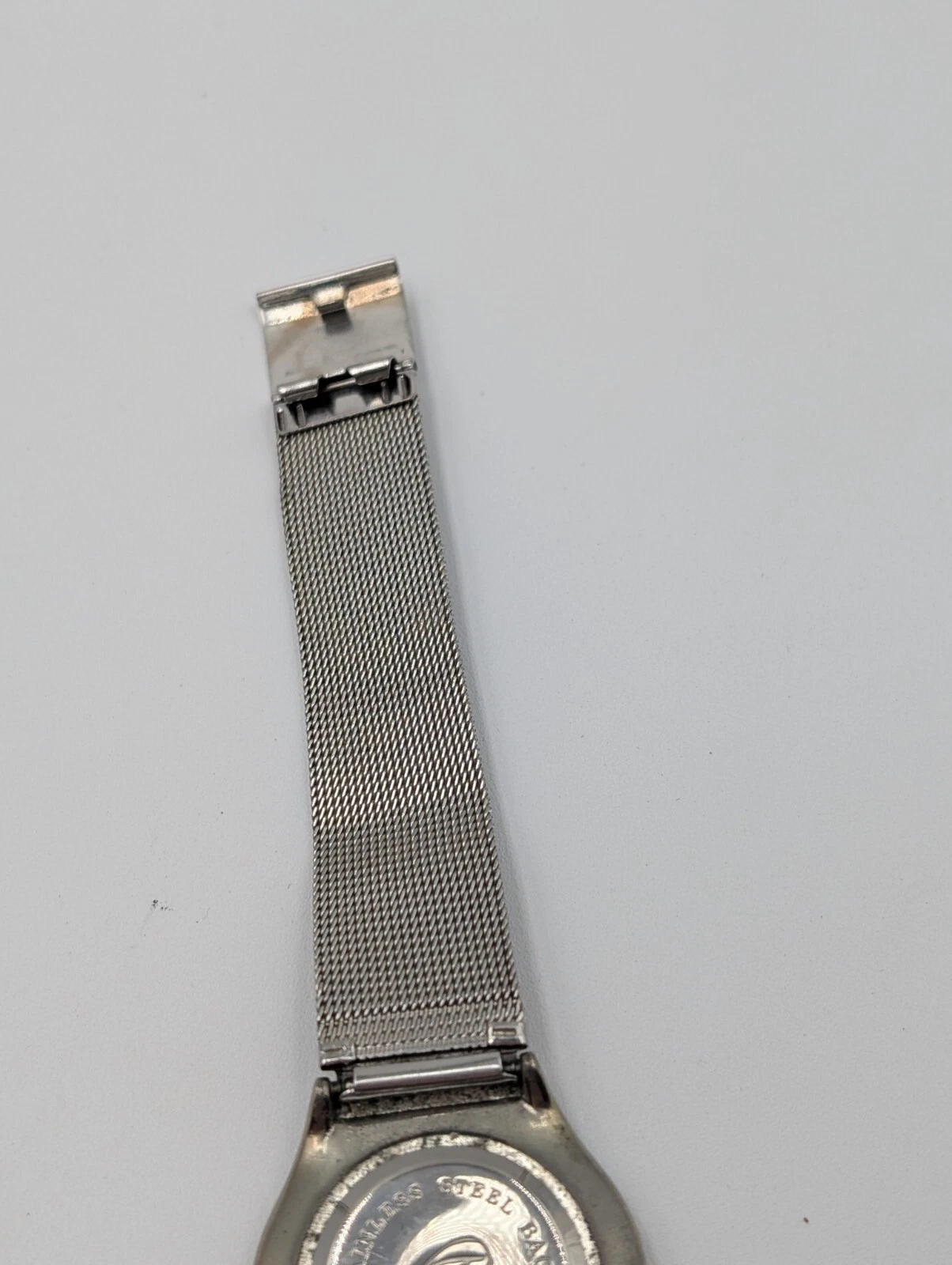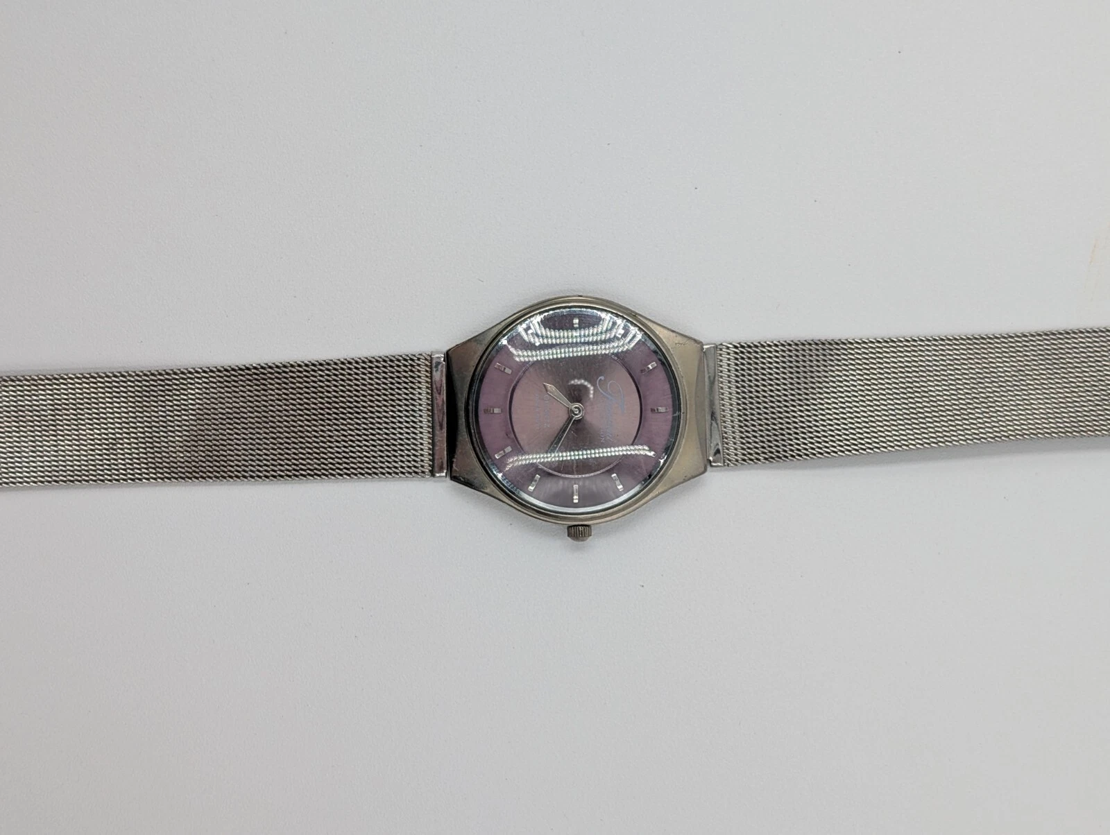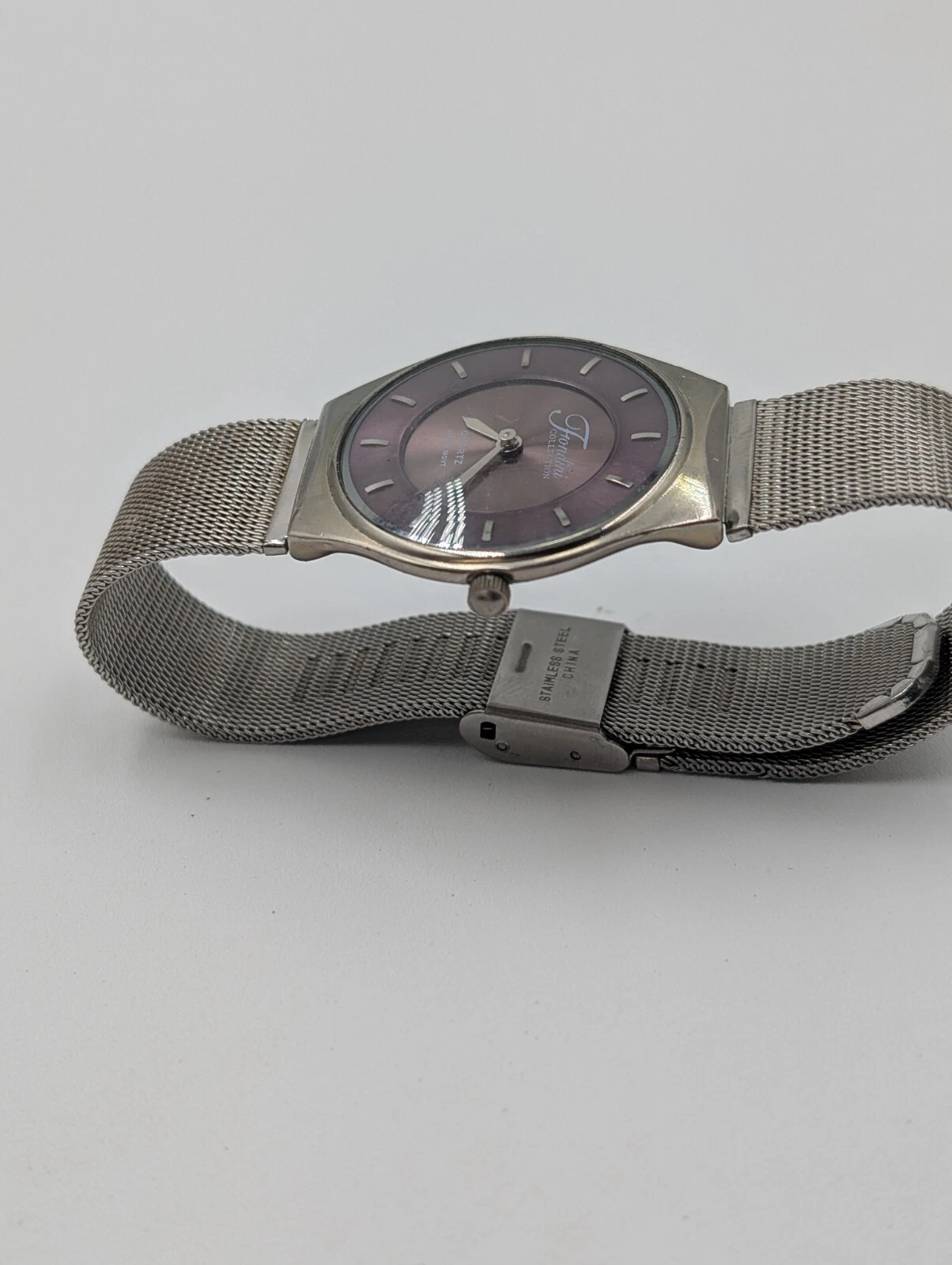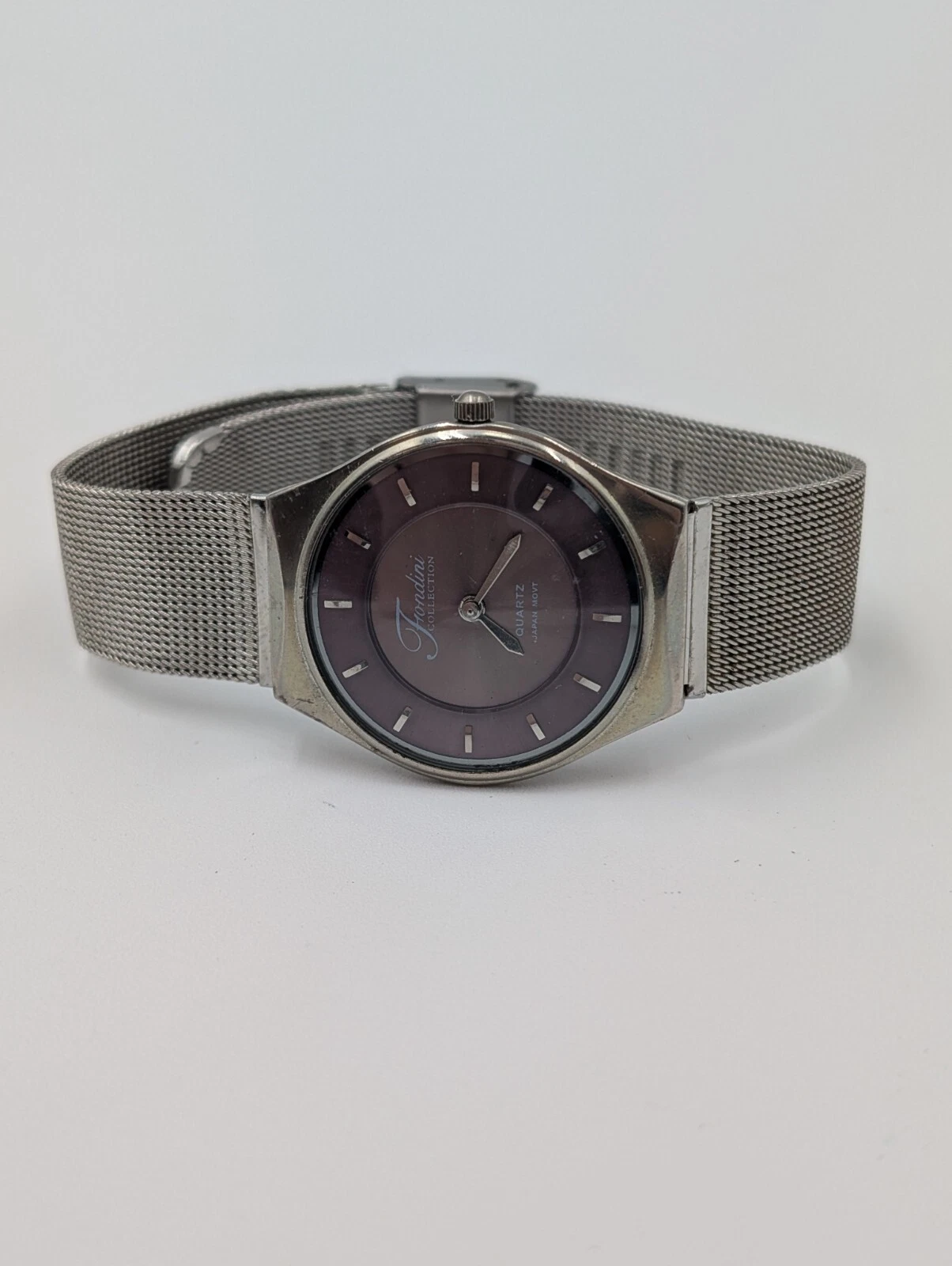 Vtg. Fondini Watch Quartz Silver Band/Case, Purple Face - Dead Battery/Untested!