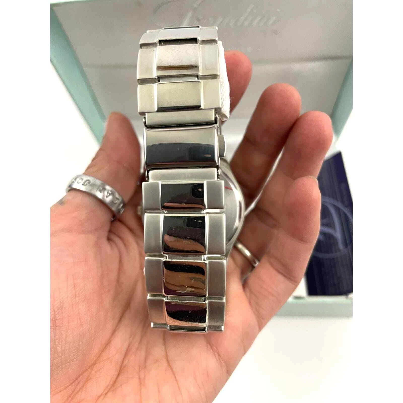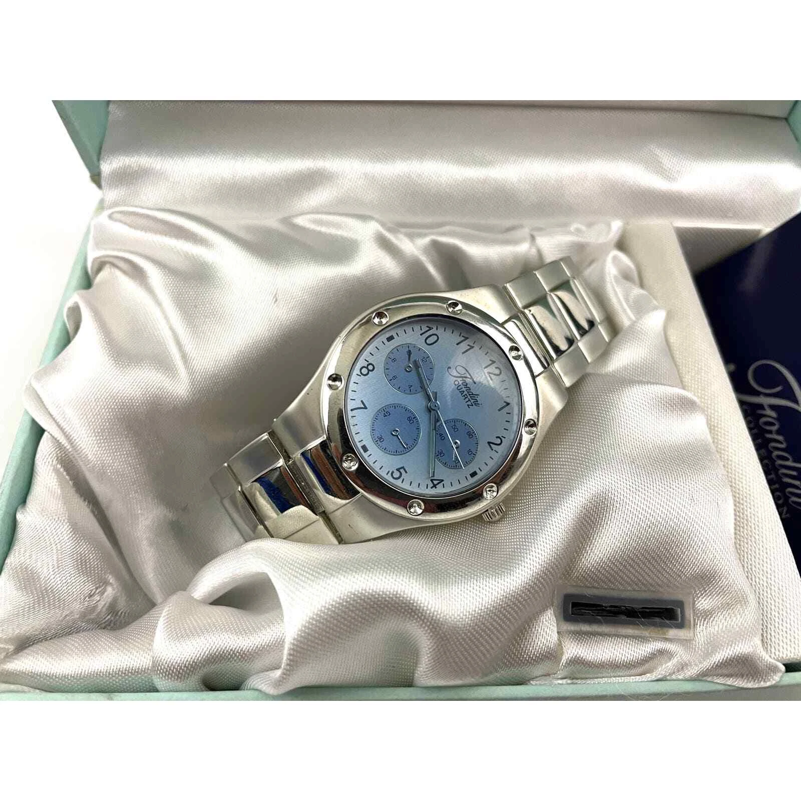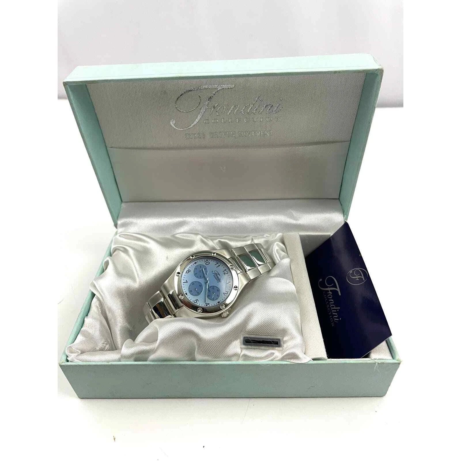 Fondini Watch Silver Blue Face Quartz Womens Original Box Swiss Driven Movement