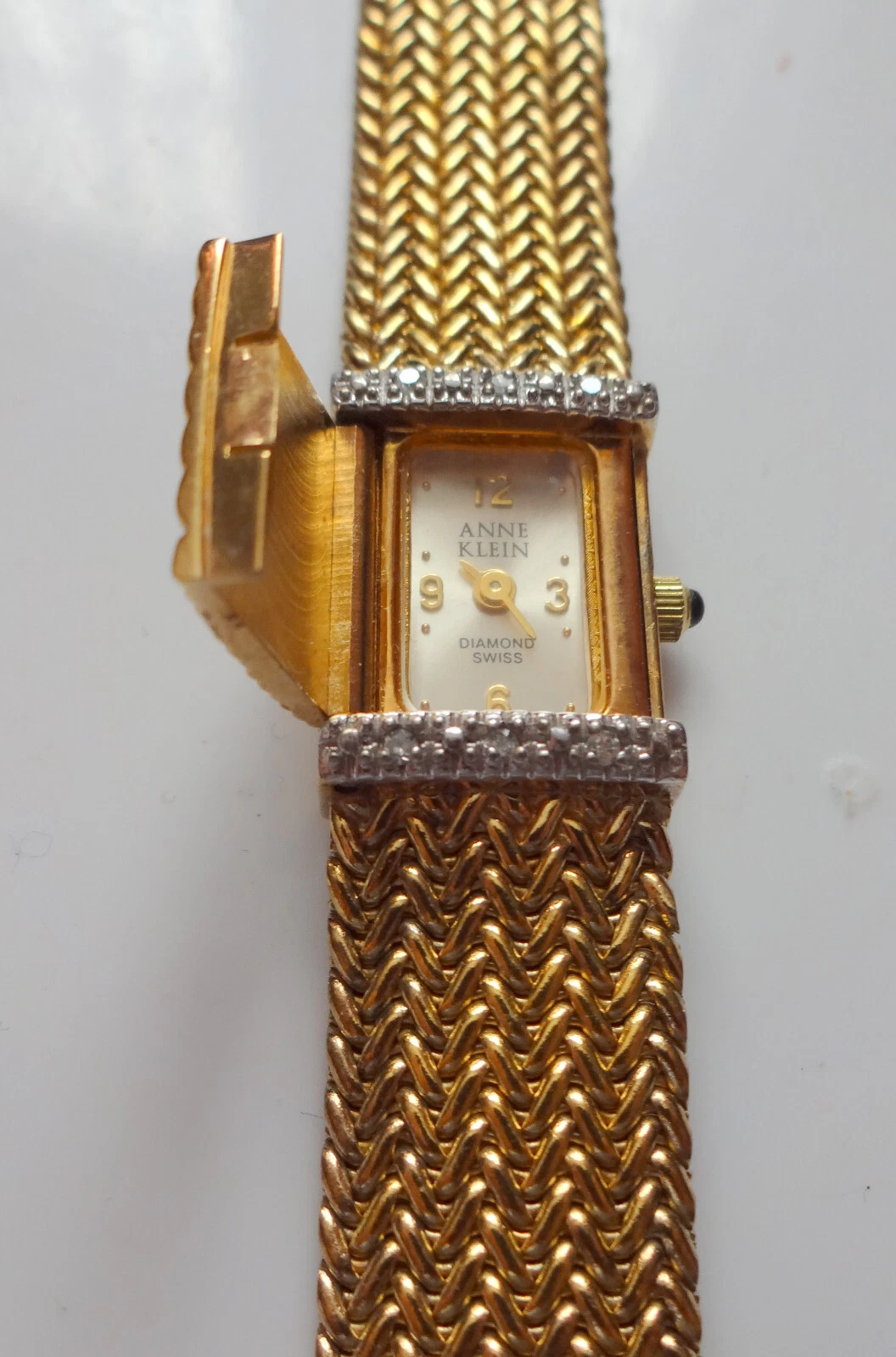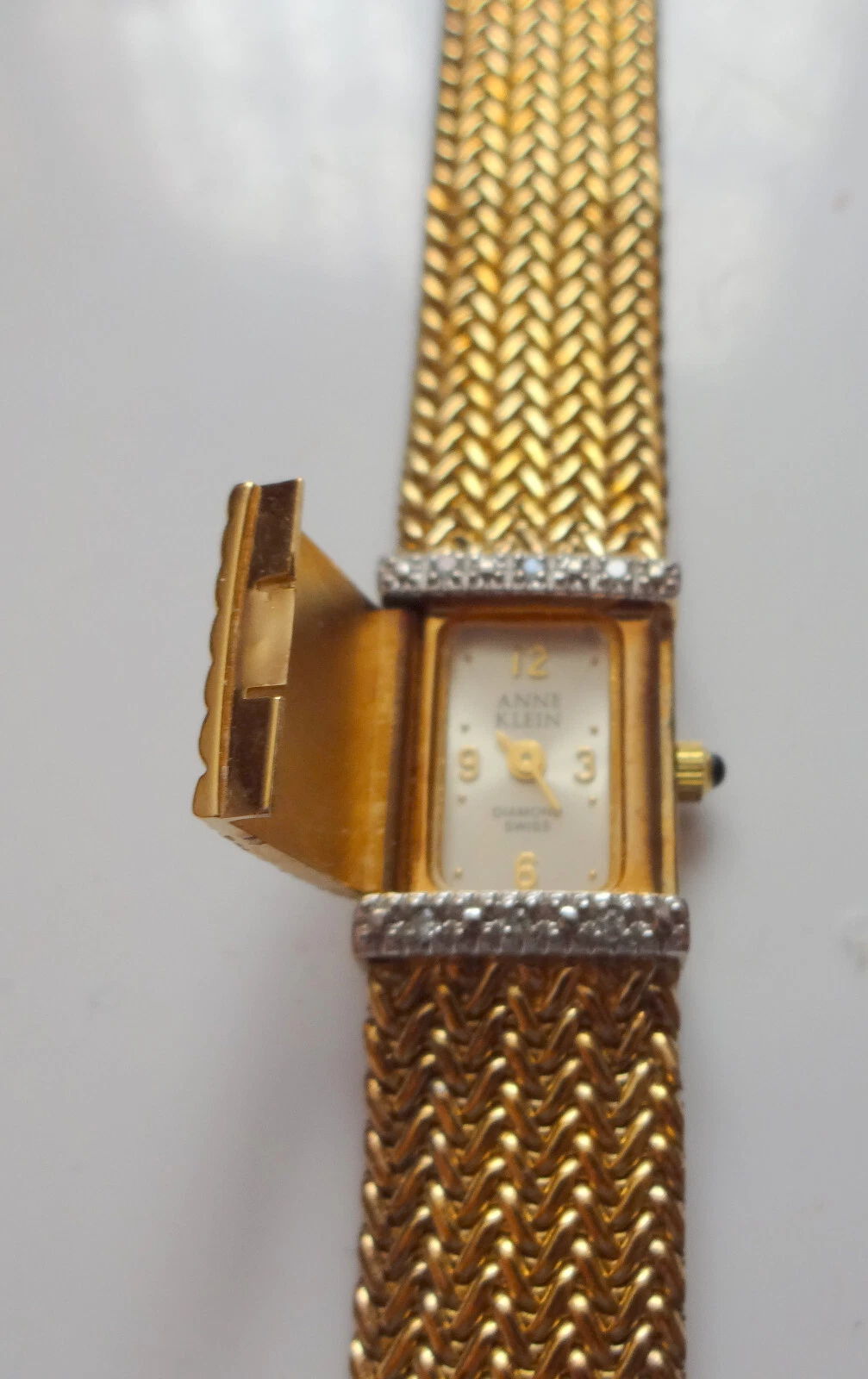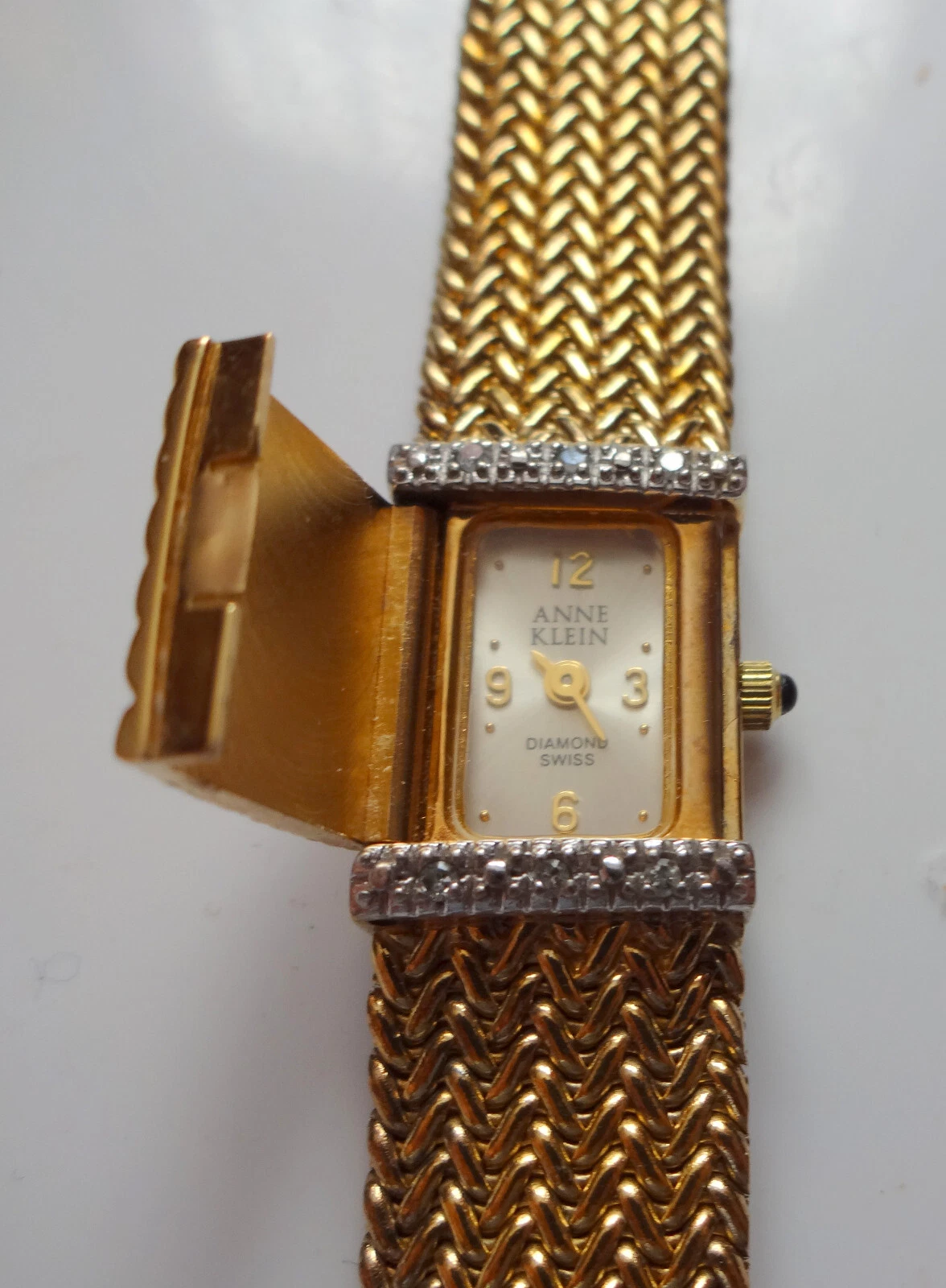 Anne Klein Diamond Swiss Watch Gold Plated Mesh Bracelet Hiden Face