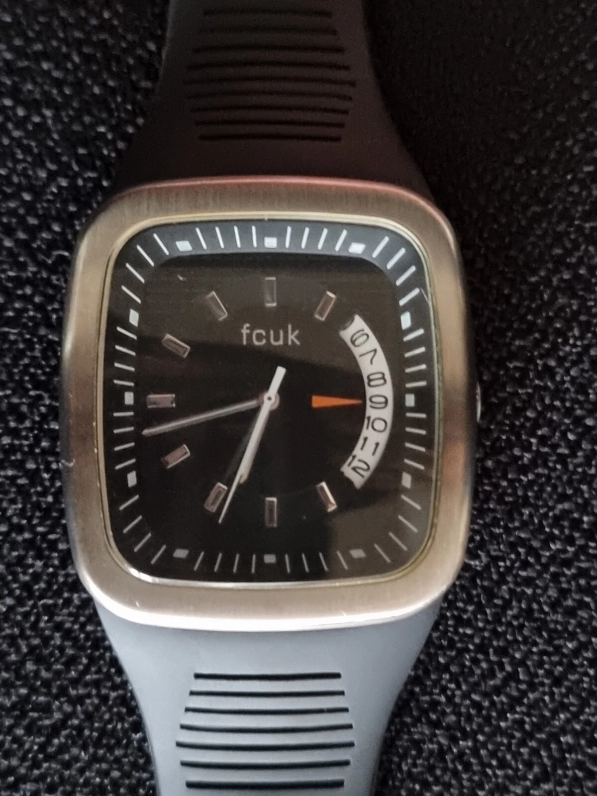 FRENCH CONNECTION FCUK TIME WATCH SAMPLE BLACK & CHROME DATE DIAL SILICONE STRAP