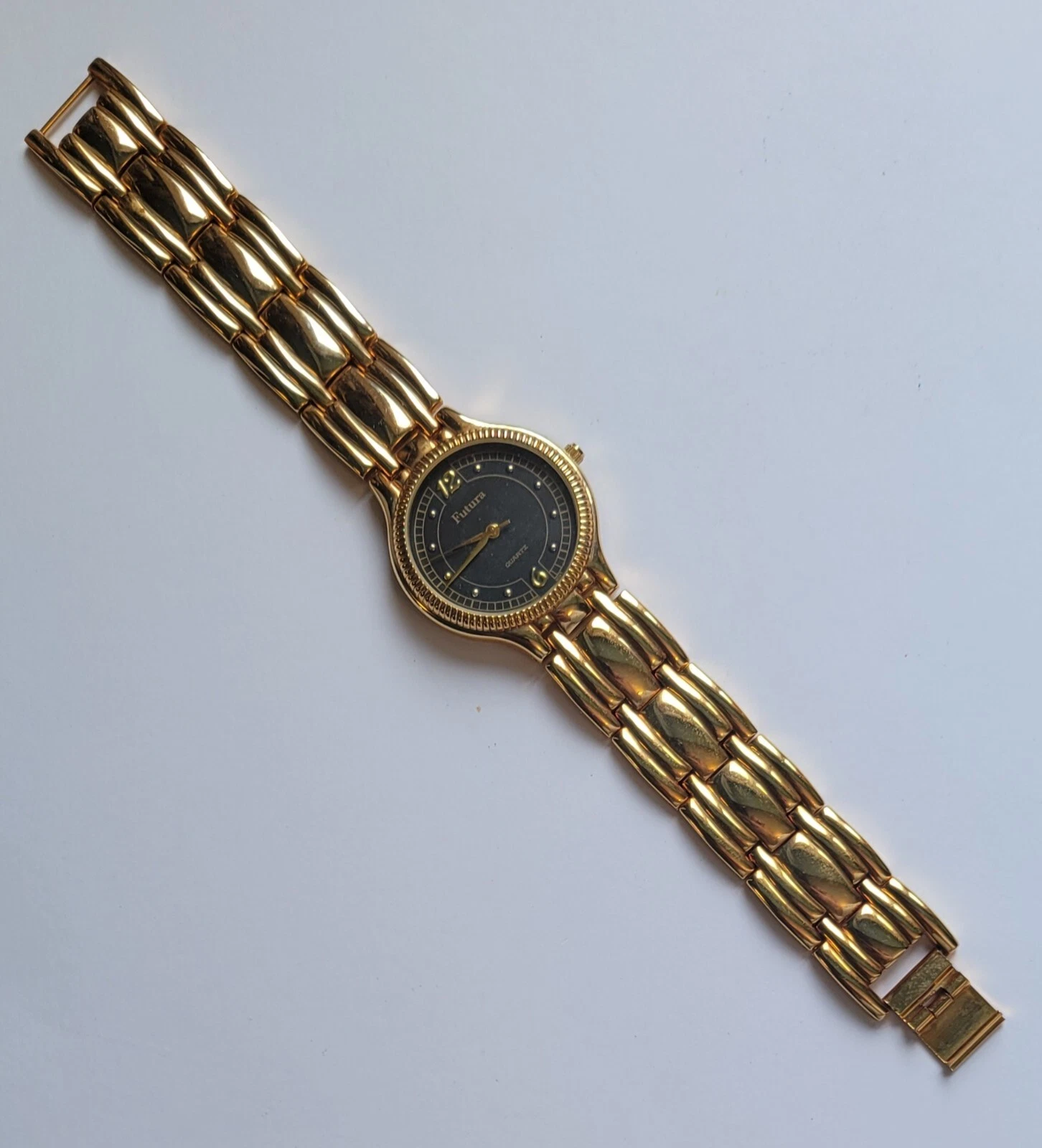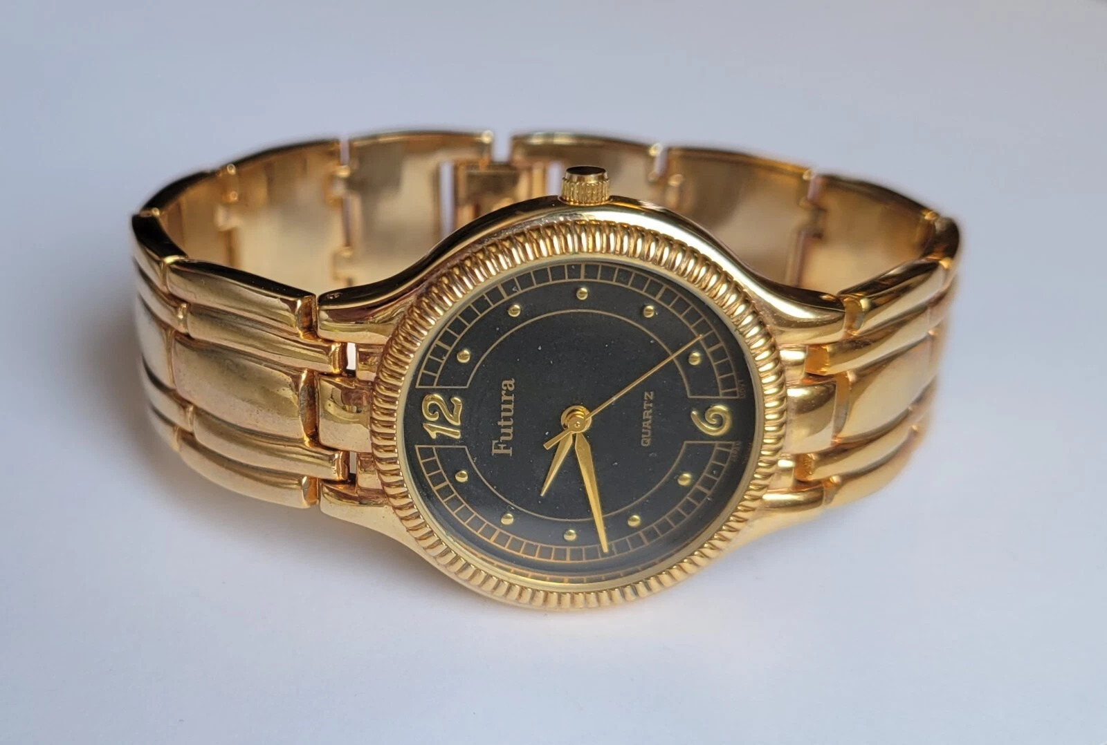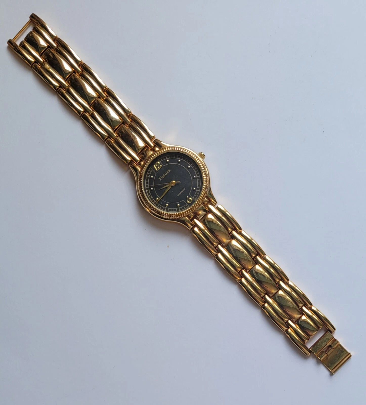Vintage Futura Gold Tone Black Dial Heavy Band Mens Watch New Battery Runs Great