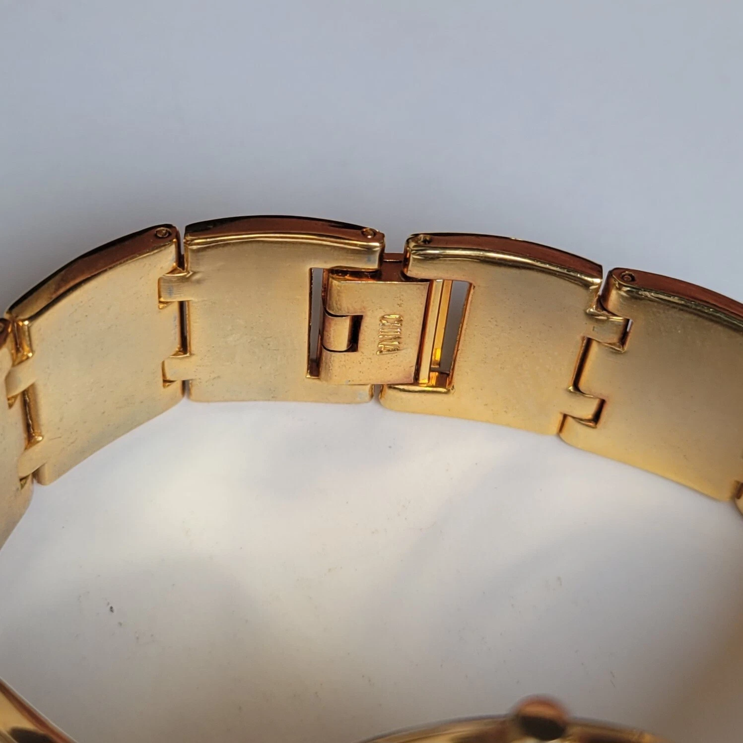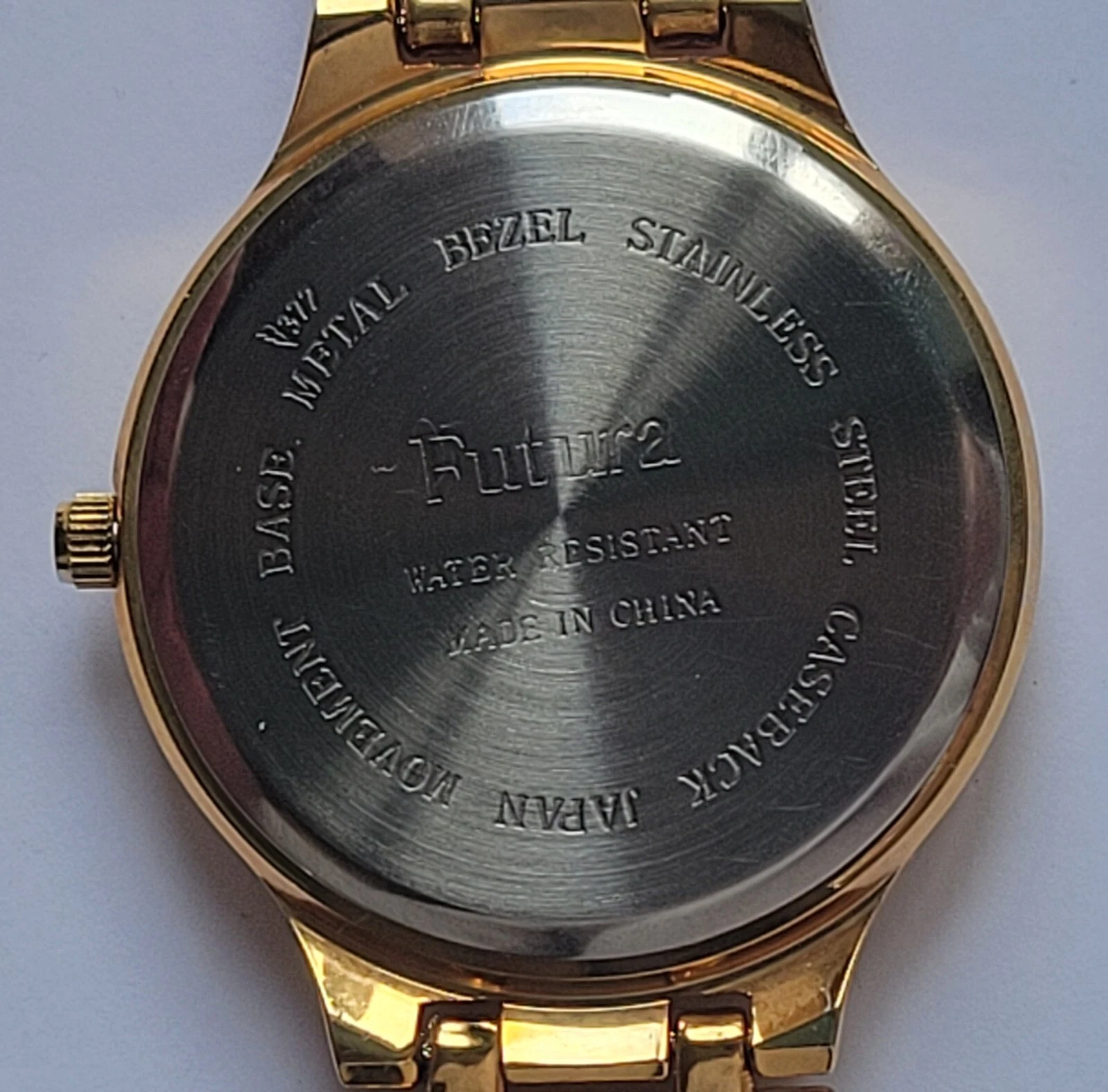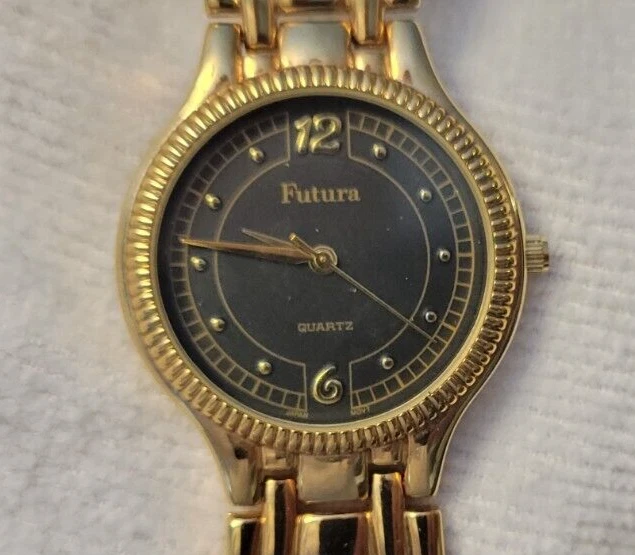 Vintage Futura Gold Tone Black Dial Heavy Band Mens Watch New Battery Runs Great