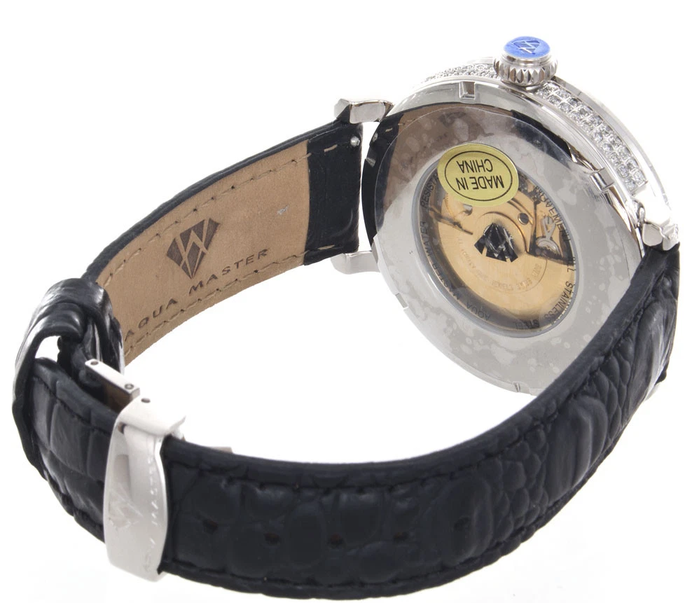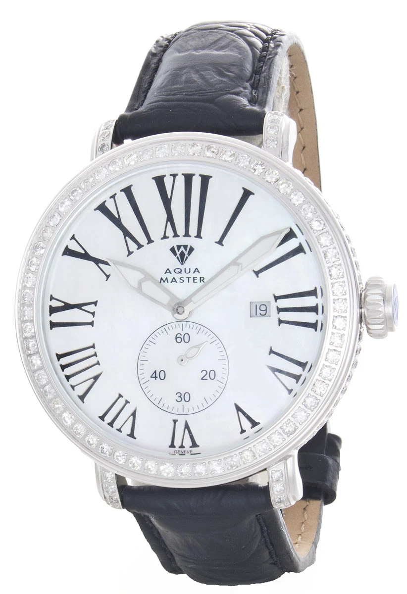 Aqua Master Men's White Mop Dial Diamond Bezel Black Leather Band Watch W#203