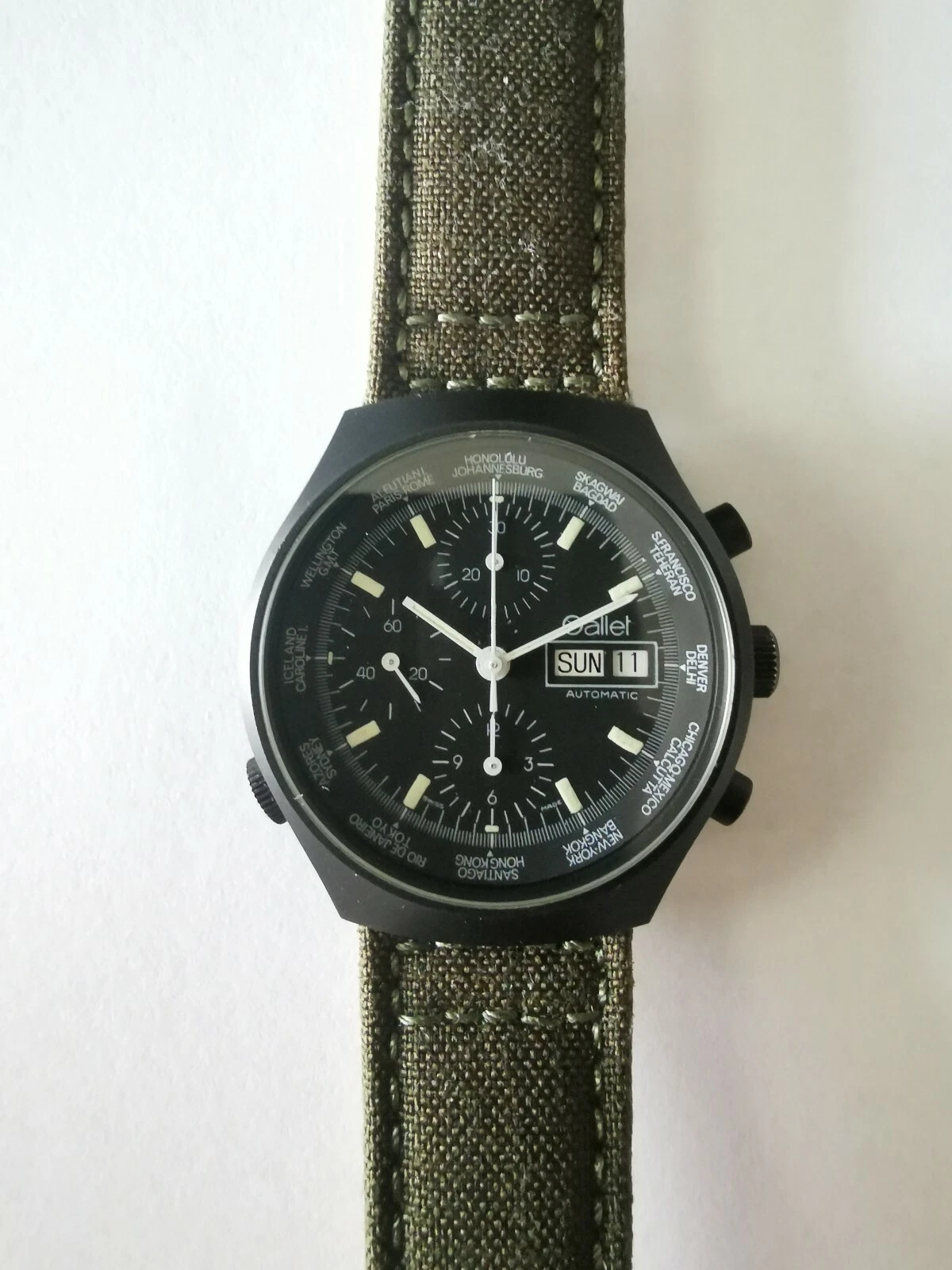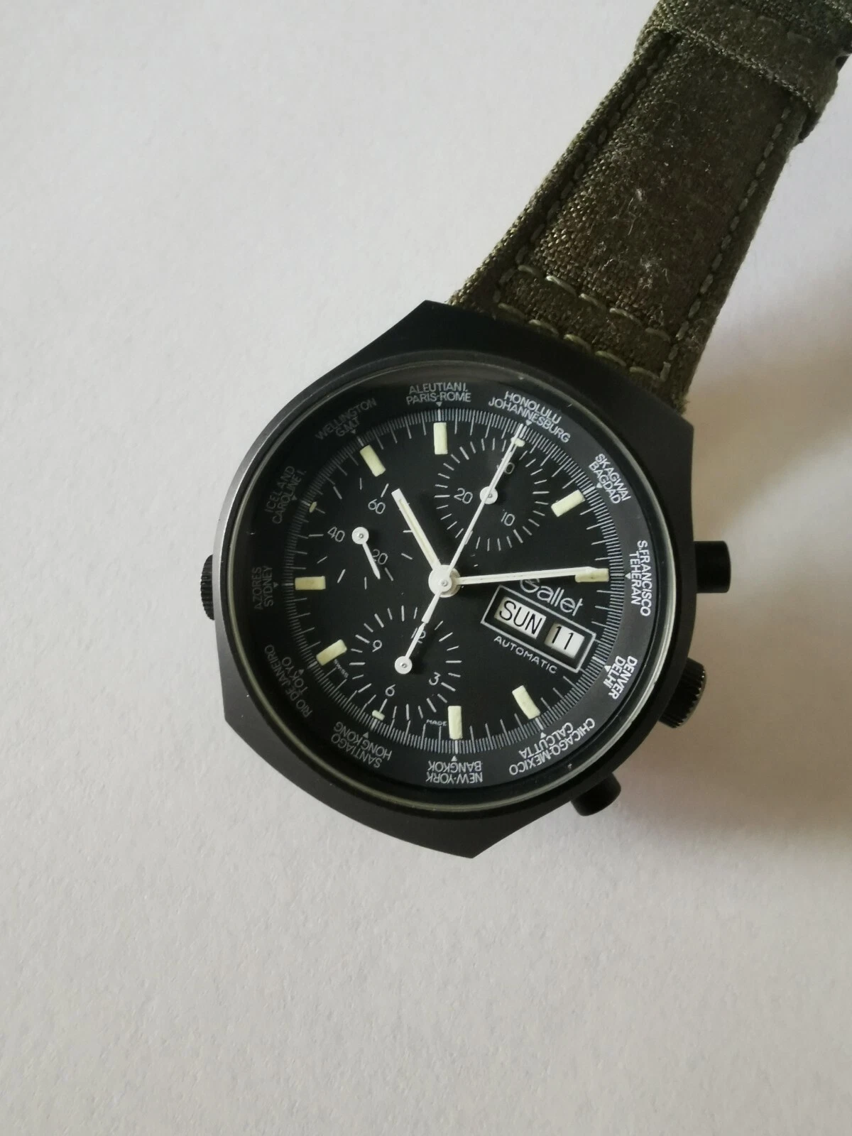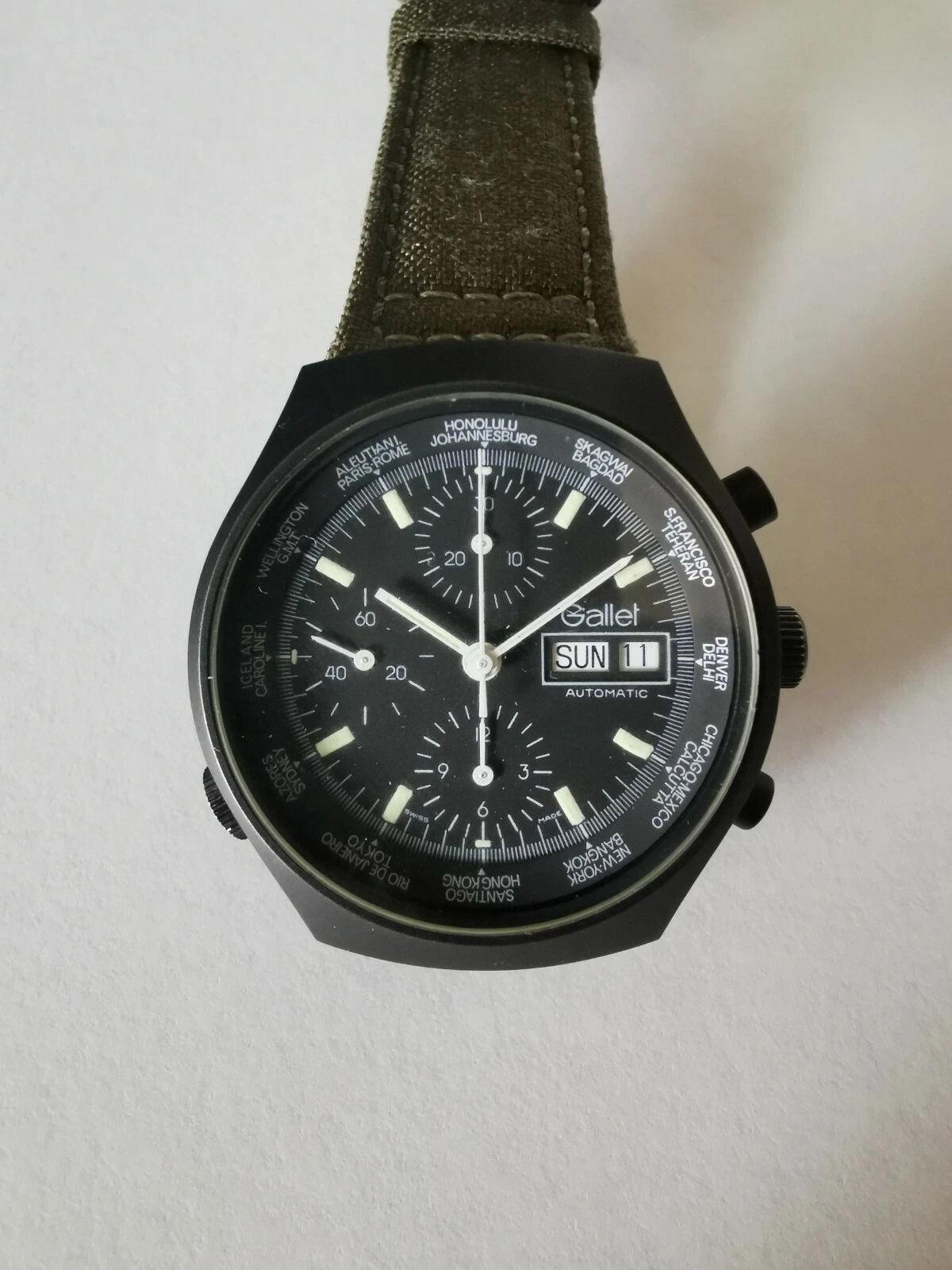 Vintage Gallet Valjoux 7750 World-Time GMT chronograph automatic Black PVD