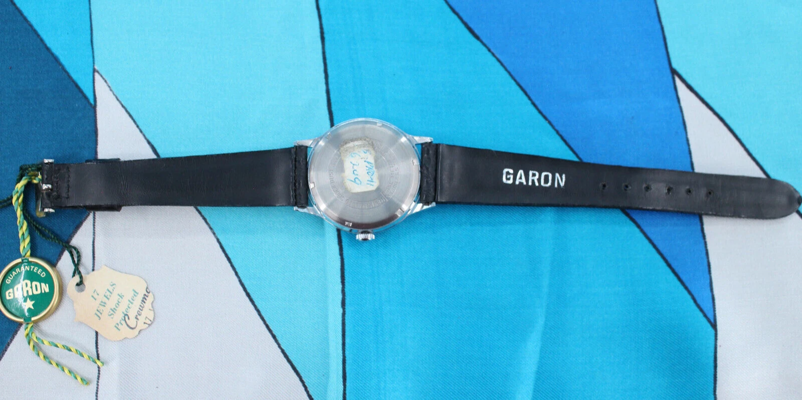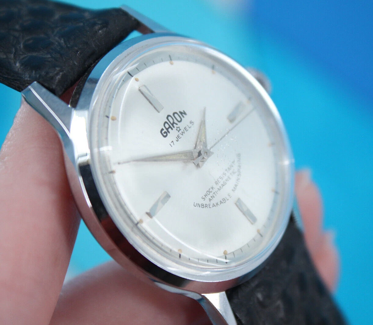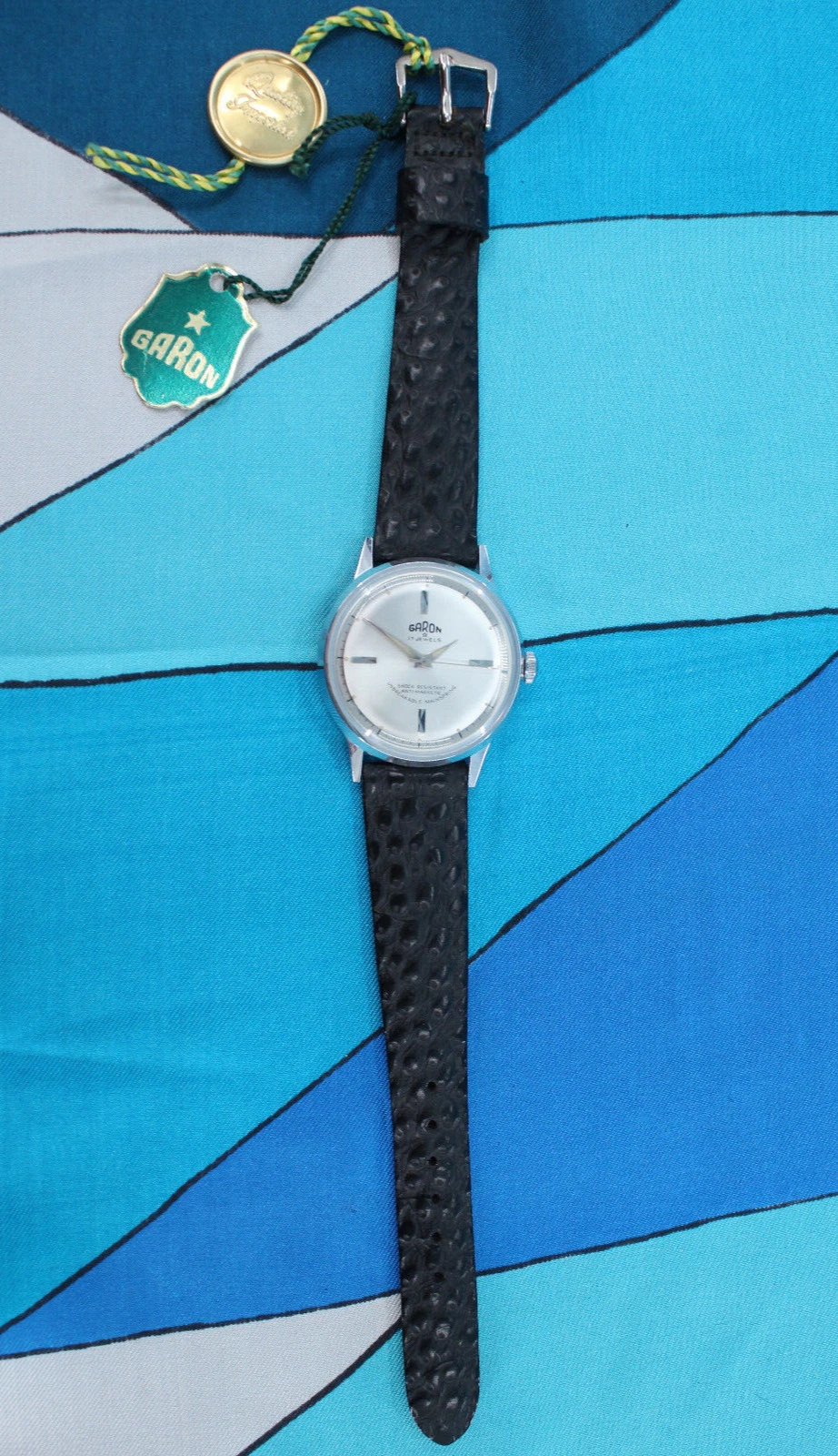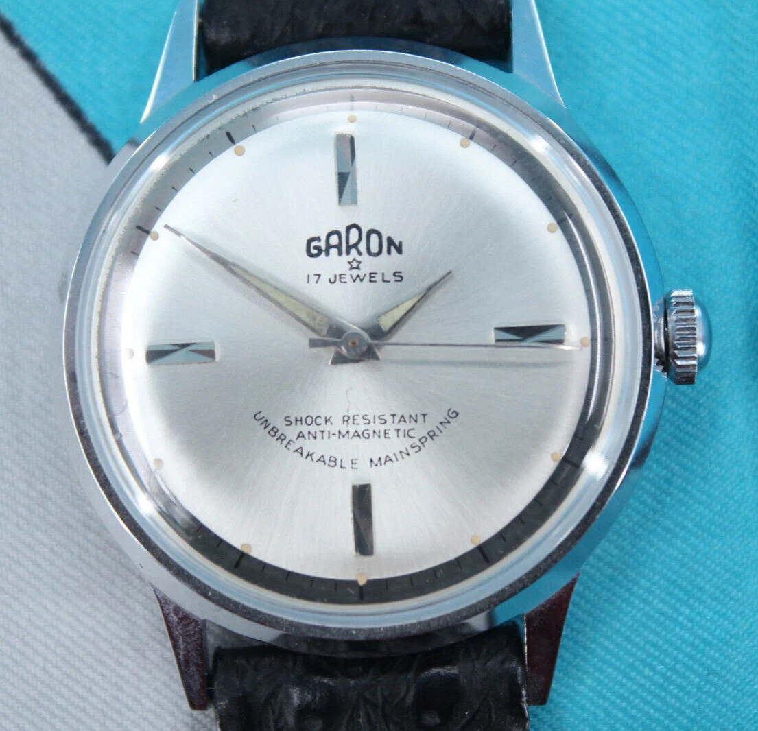 Vtg Men's 60s NOS Silver Tone & Black Band Garon Watch W/ Box 1960s 17 Jewels