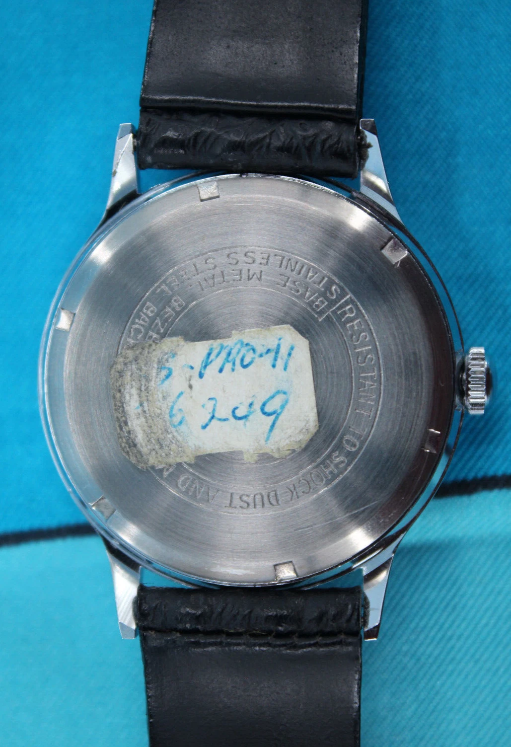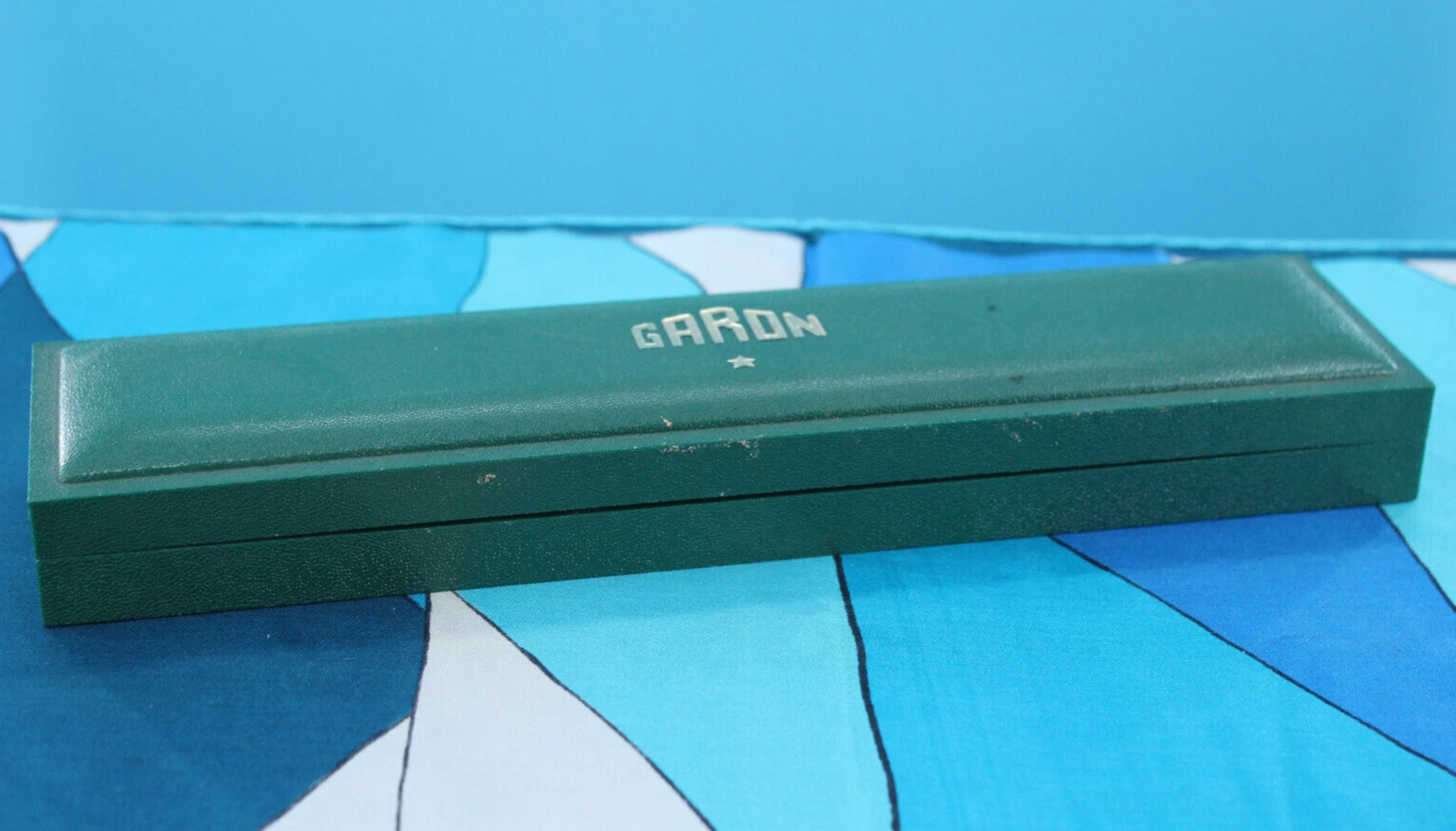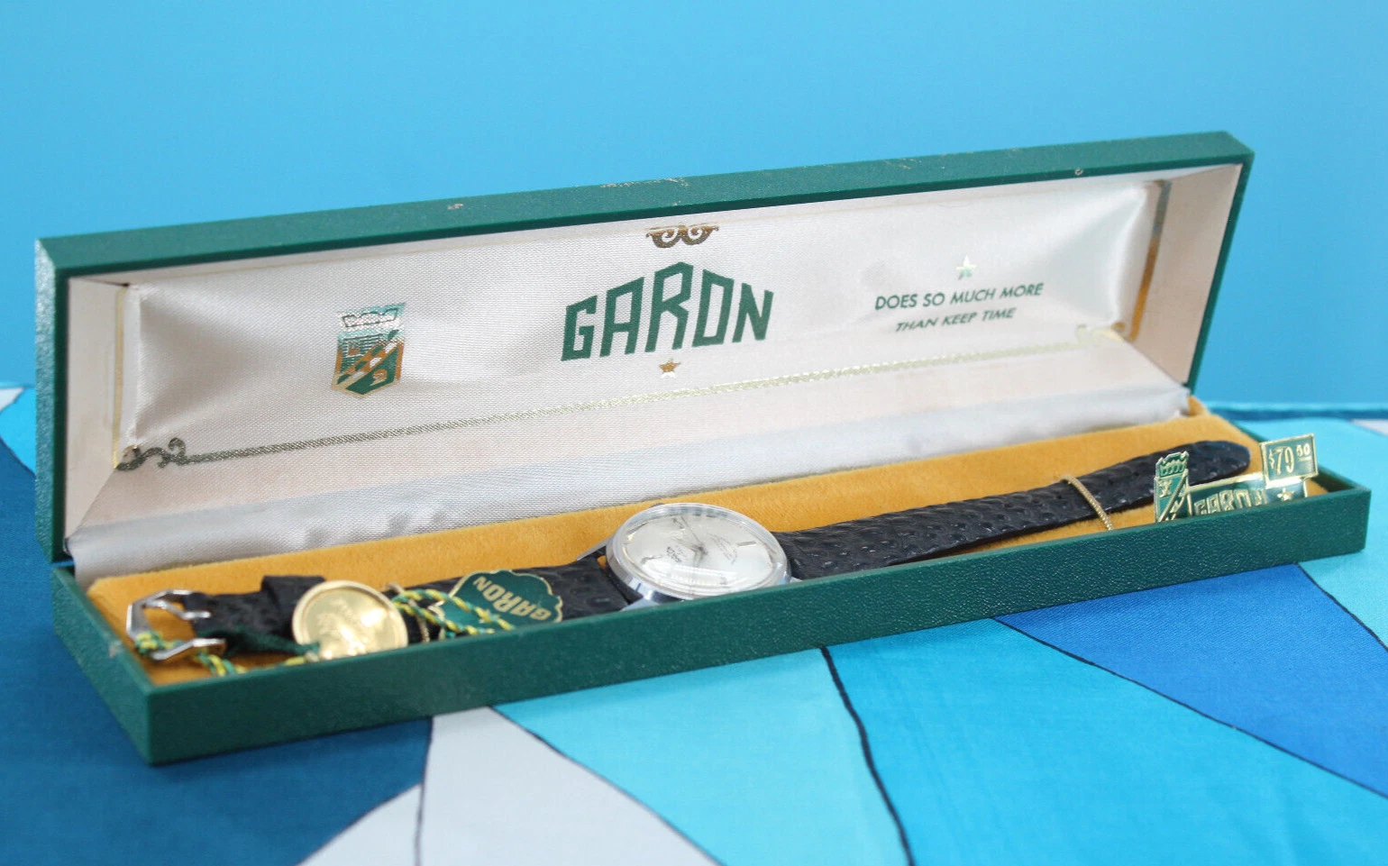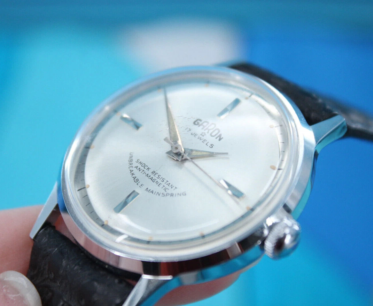 Vtg Men's 60s NOS Silver Tone & Black Band Garon Watch W/ Box 1960s 17 Jewels