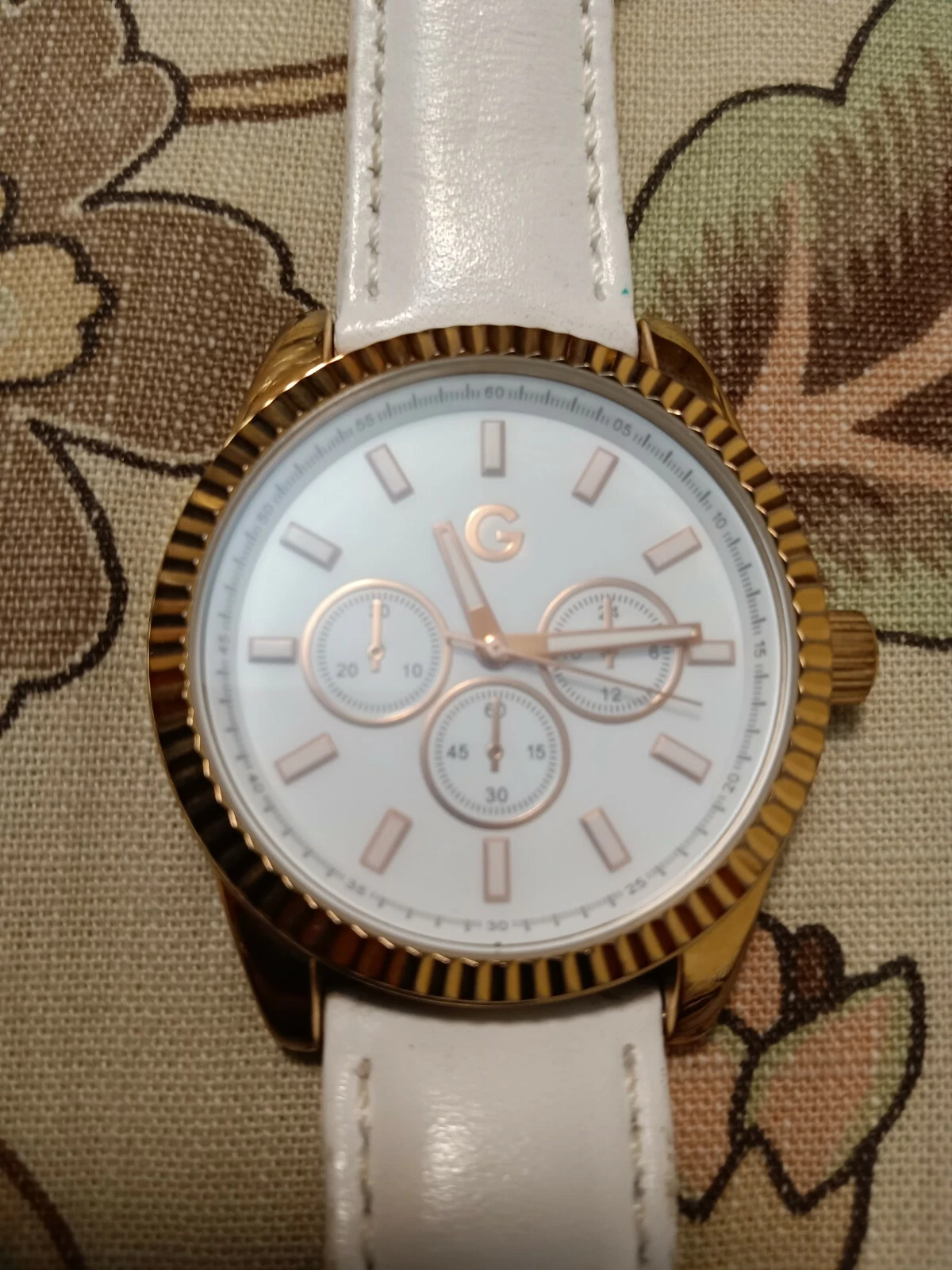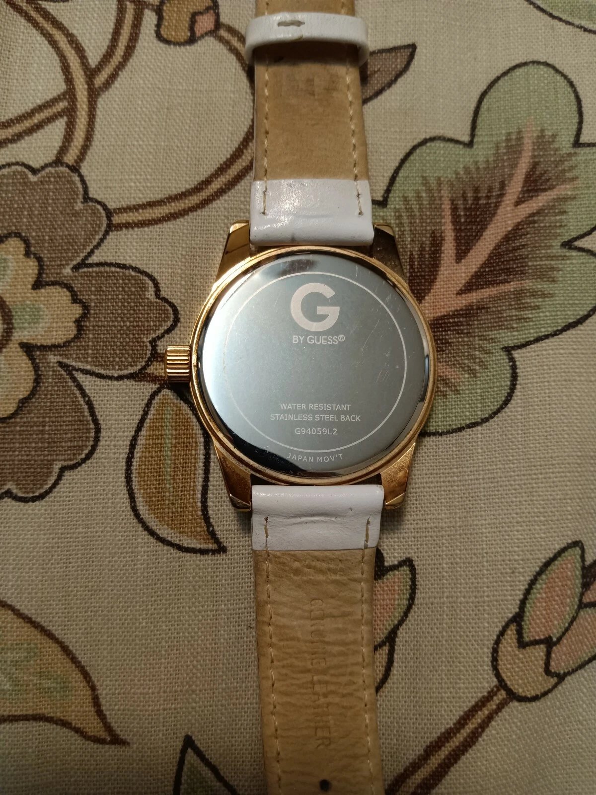G-BY GUESS GOLD TONE,WHITE LEATHER BAND,MULTI DIAL WATCH G94059L2 USED
