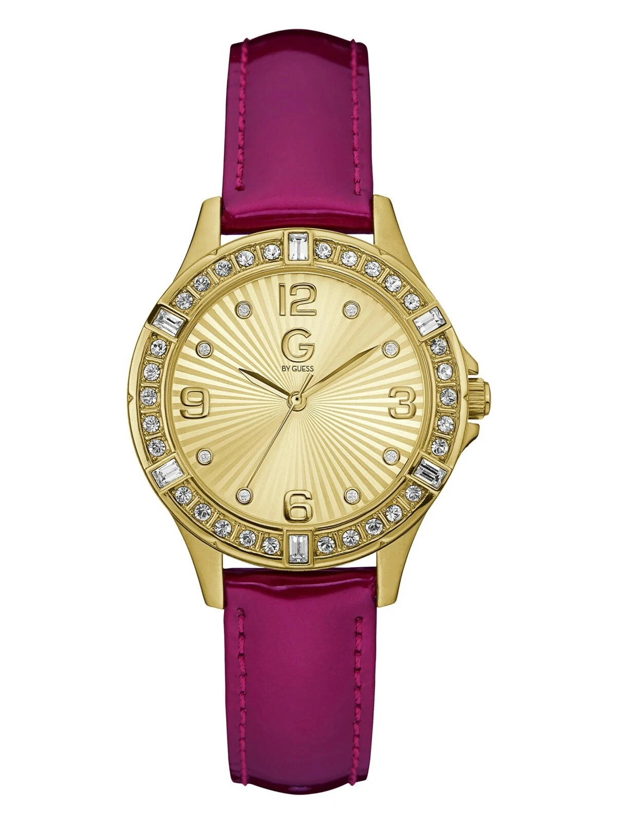 G by Guess Gold Tone Crystals Magenta Wine Patent Leather Band Watch G74050L1