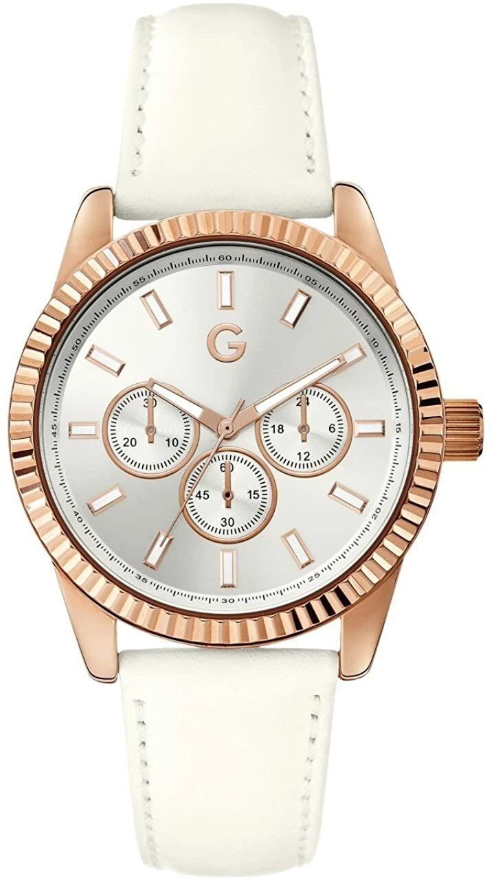 NEW G-BY GUESS ROSE GOLD TONE,WHITE LEATHER BAND,MULTI DIAL WATCH G94059L2