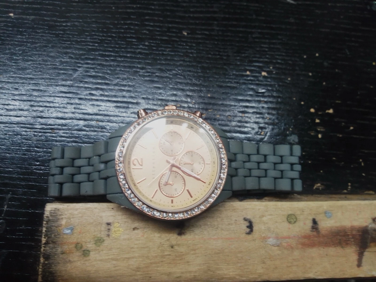 Attention Crystal Accent Round Gold Tone Case Stainless Steel Watch