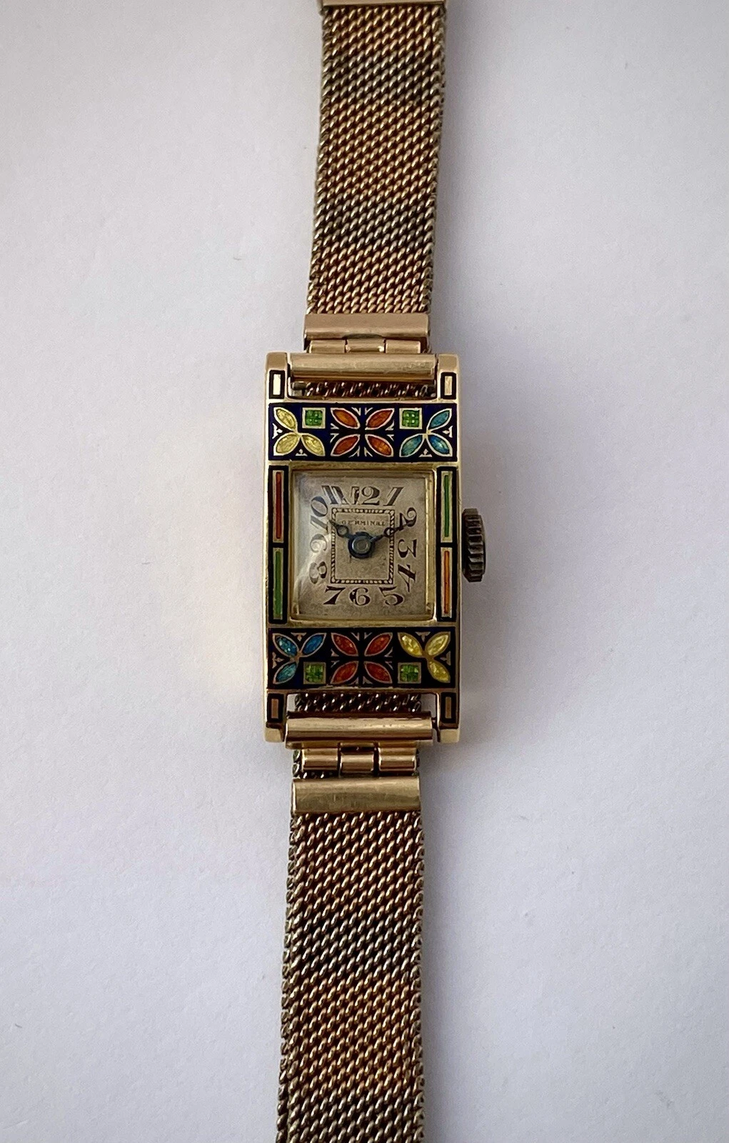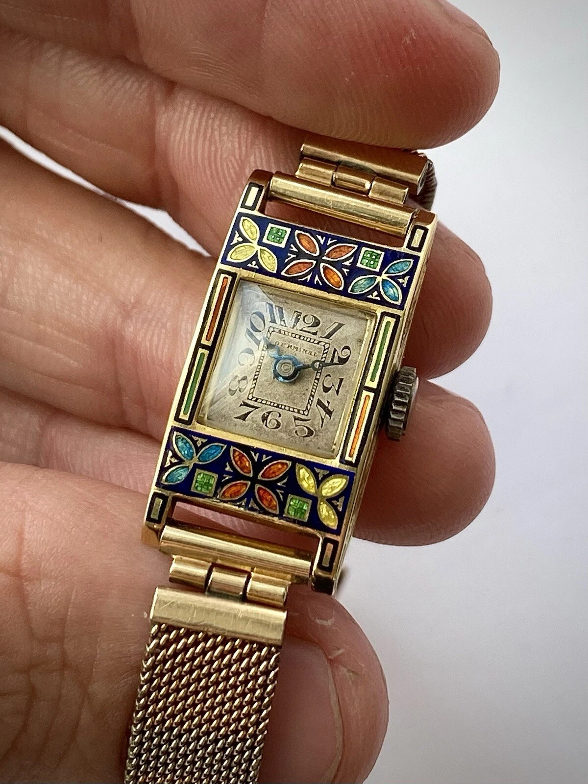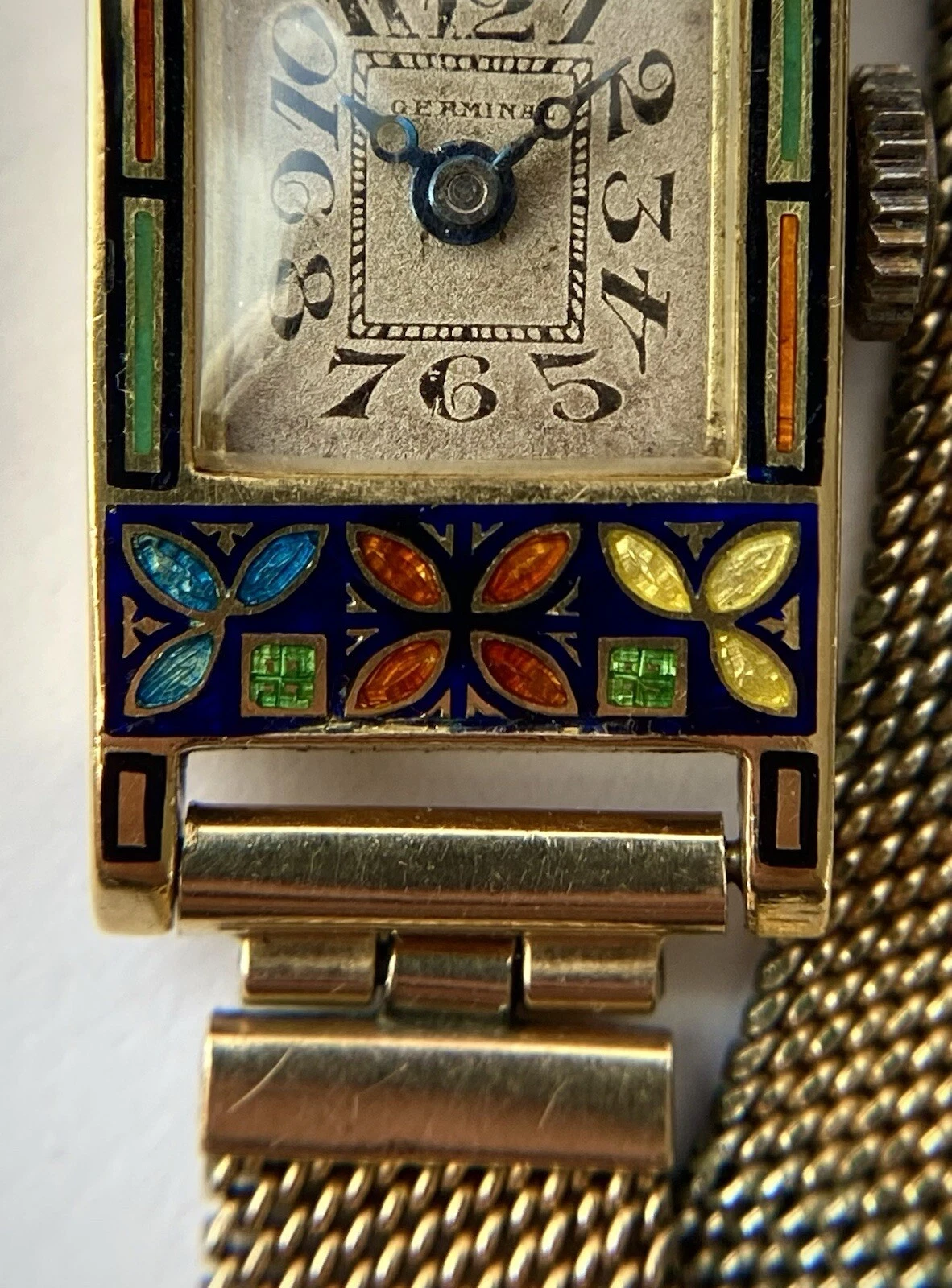 1920s/30s Germinal 18ct gold ladies watch with floral geometric enamel design
