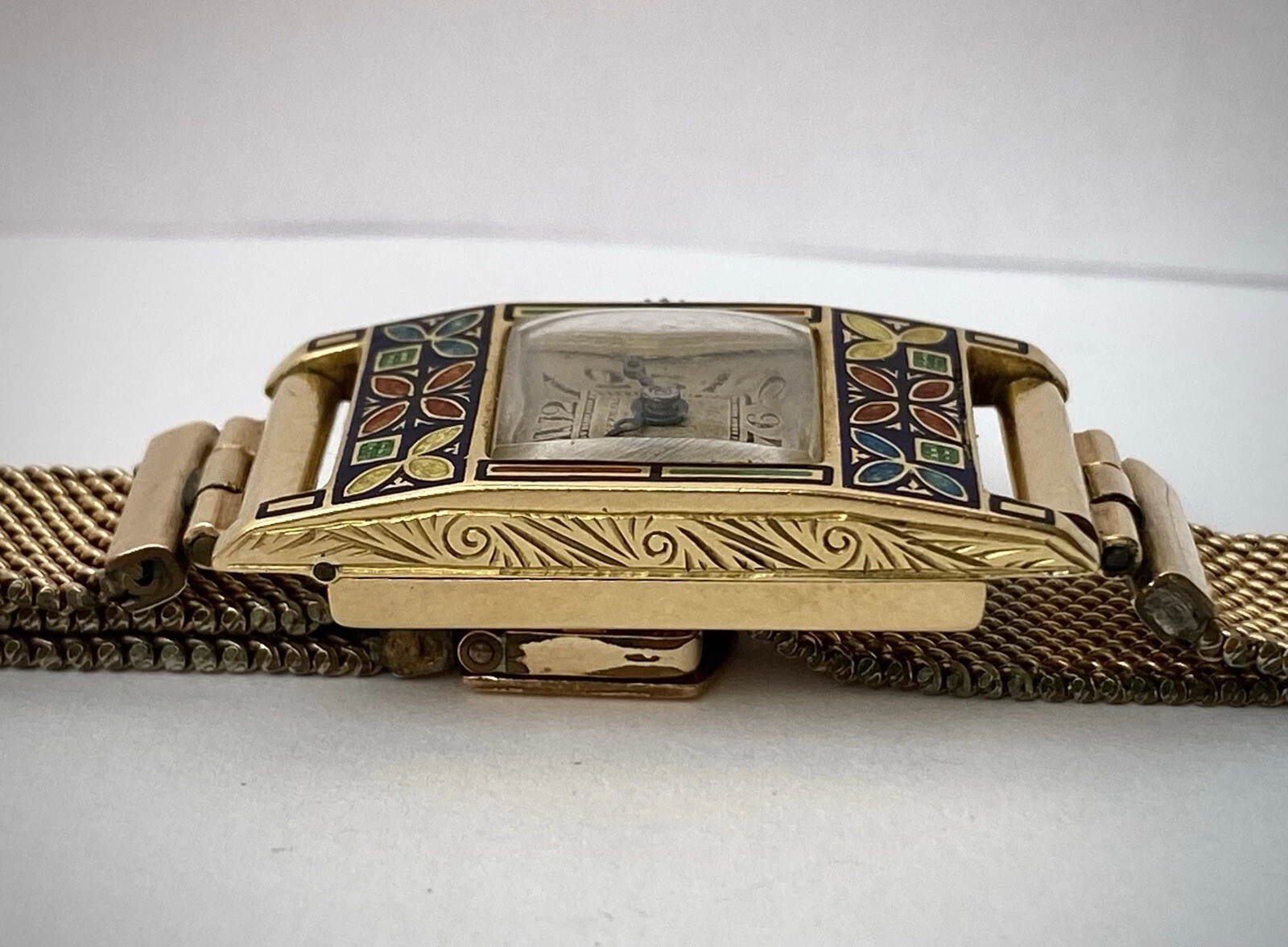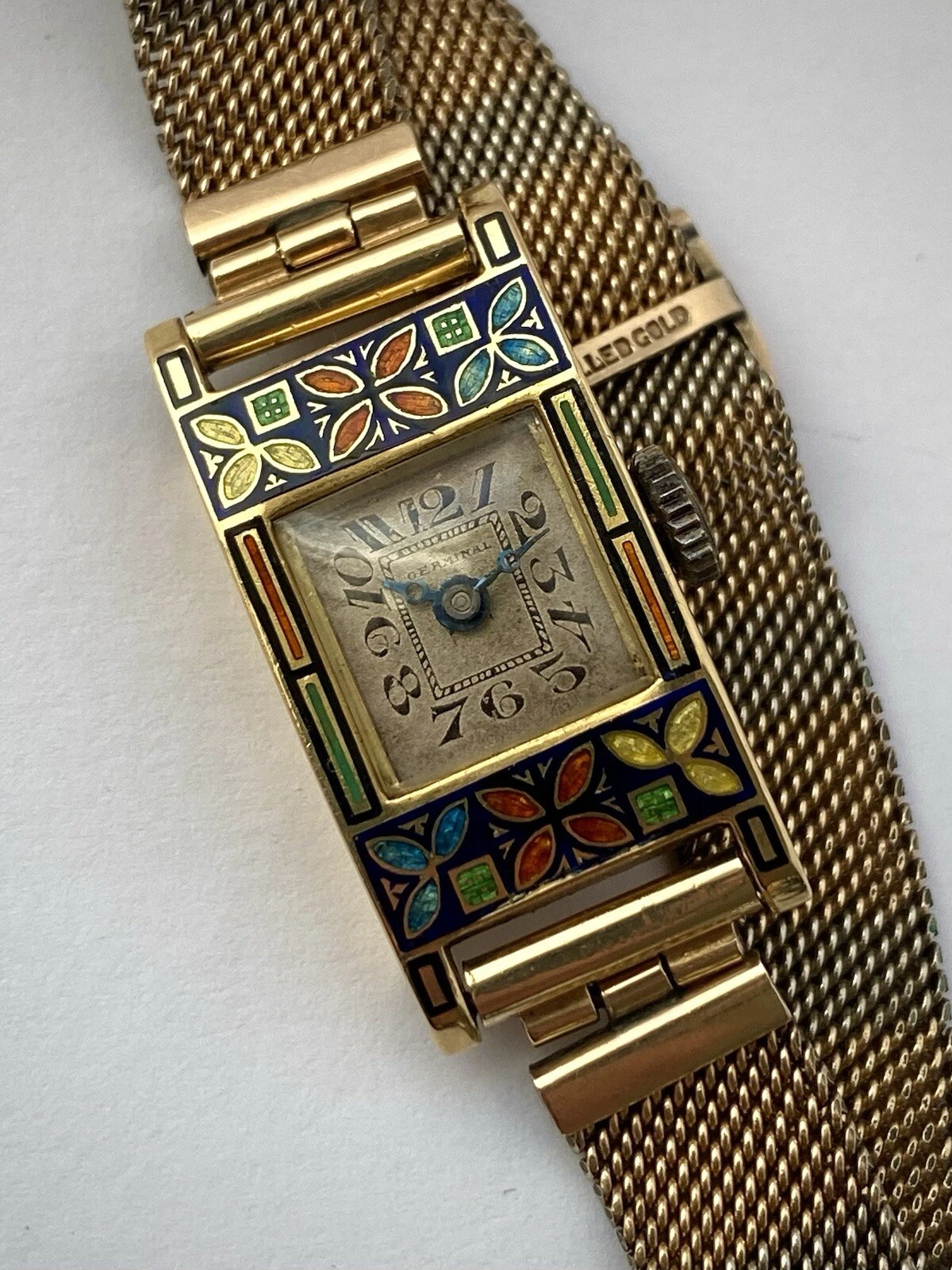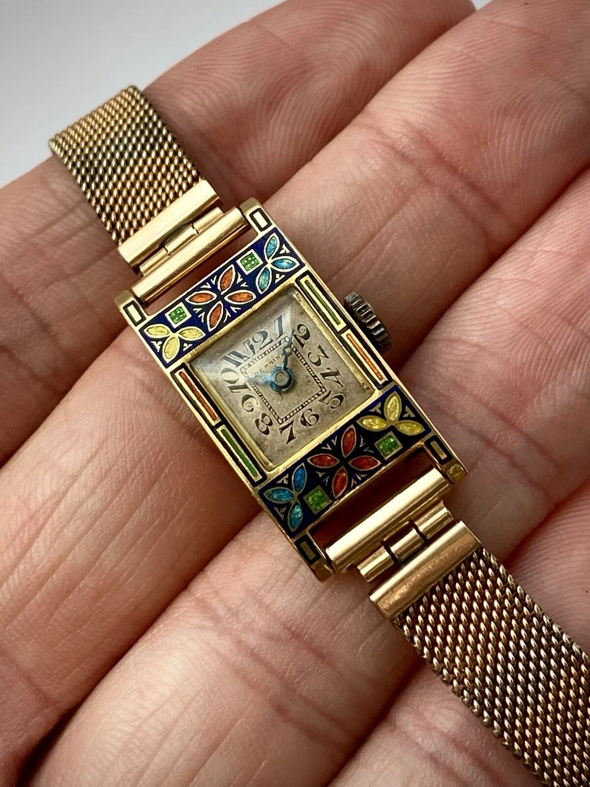 1920s/30s Germinal 18ct gold ladies watch with floral geometric enamel design