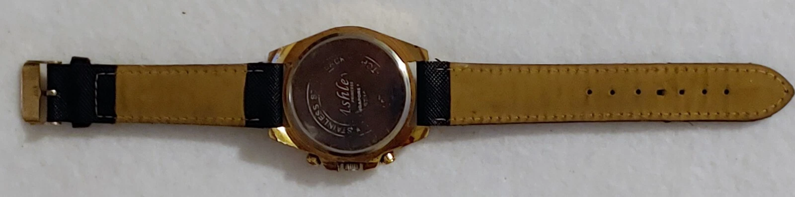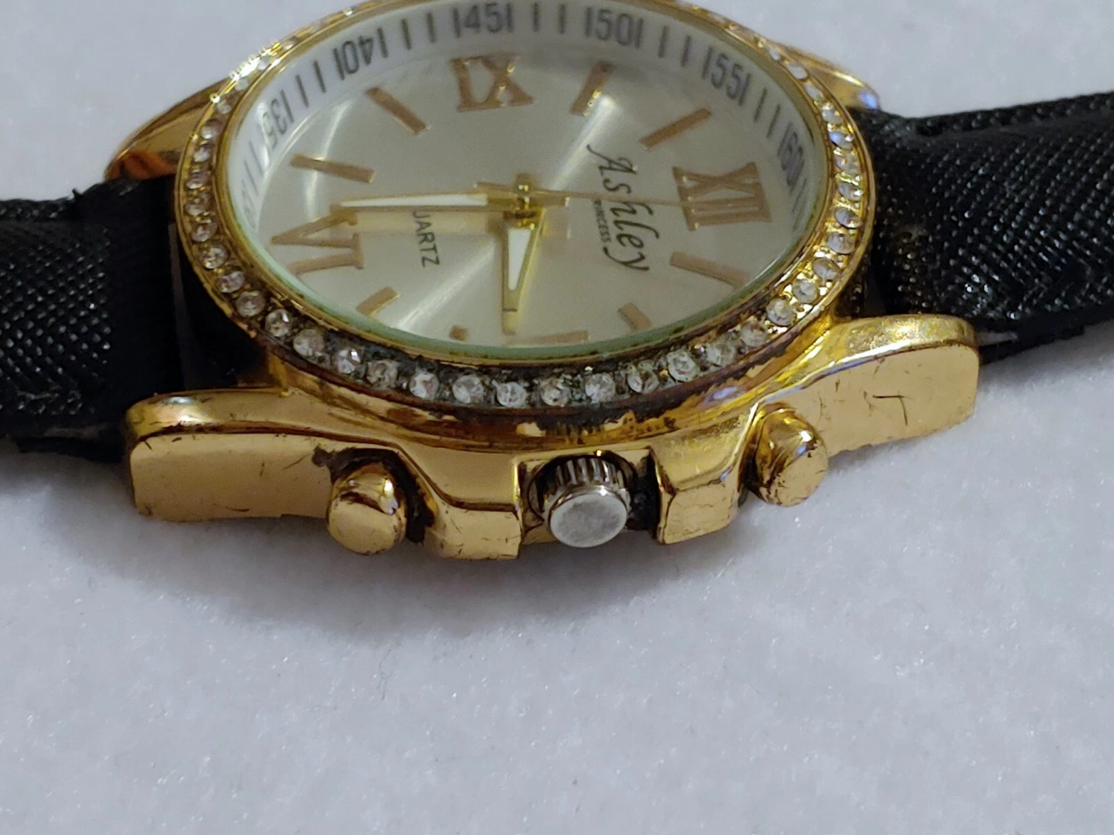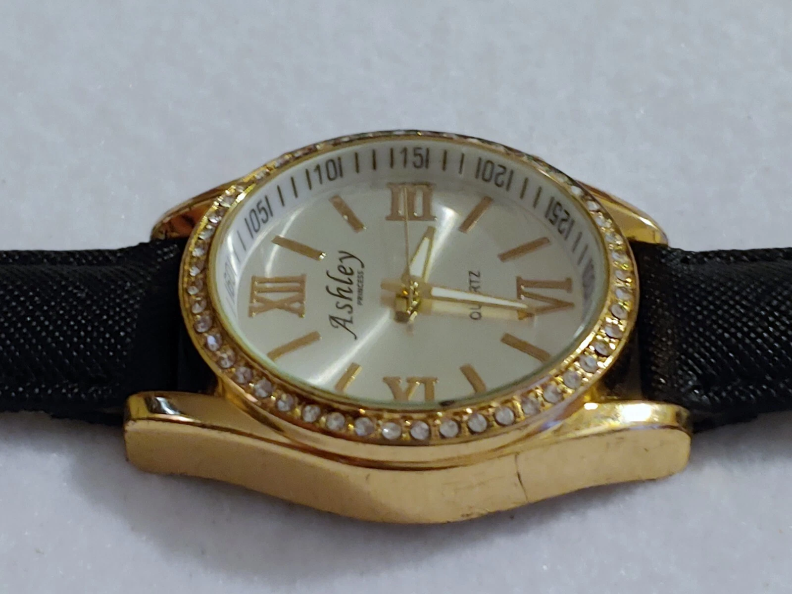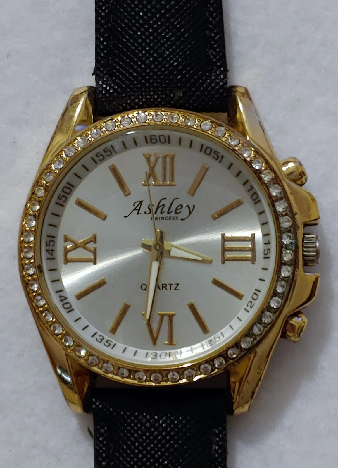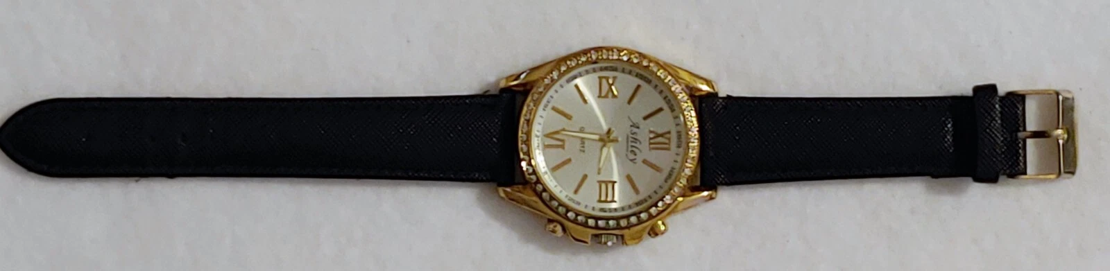 Ashley Princess Gold Tone - Crystal Accent - Faux Leather band - NEW Battery
