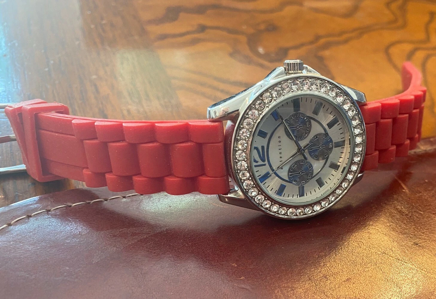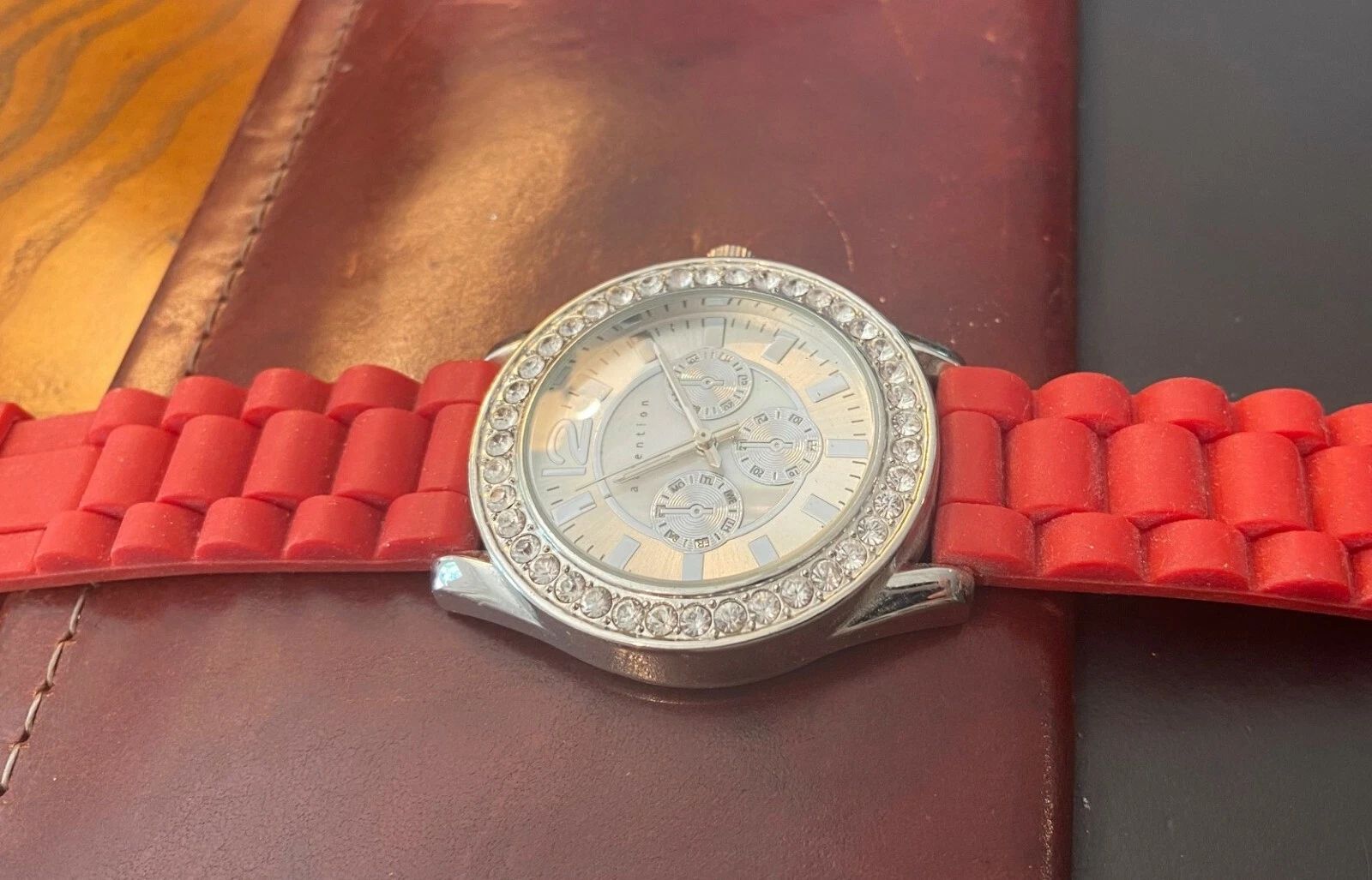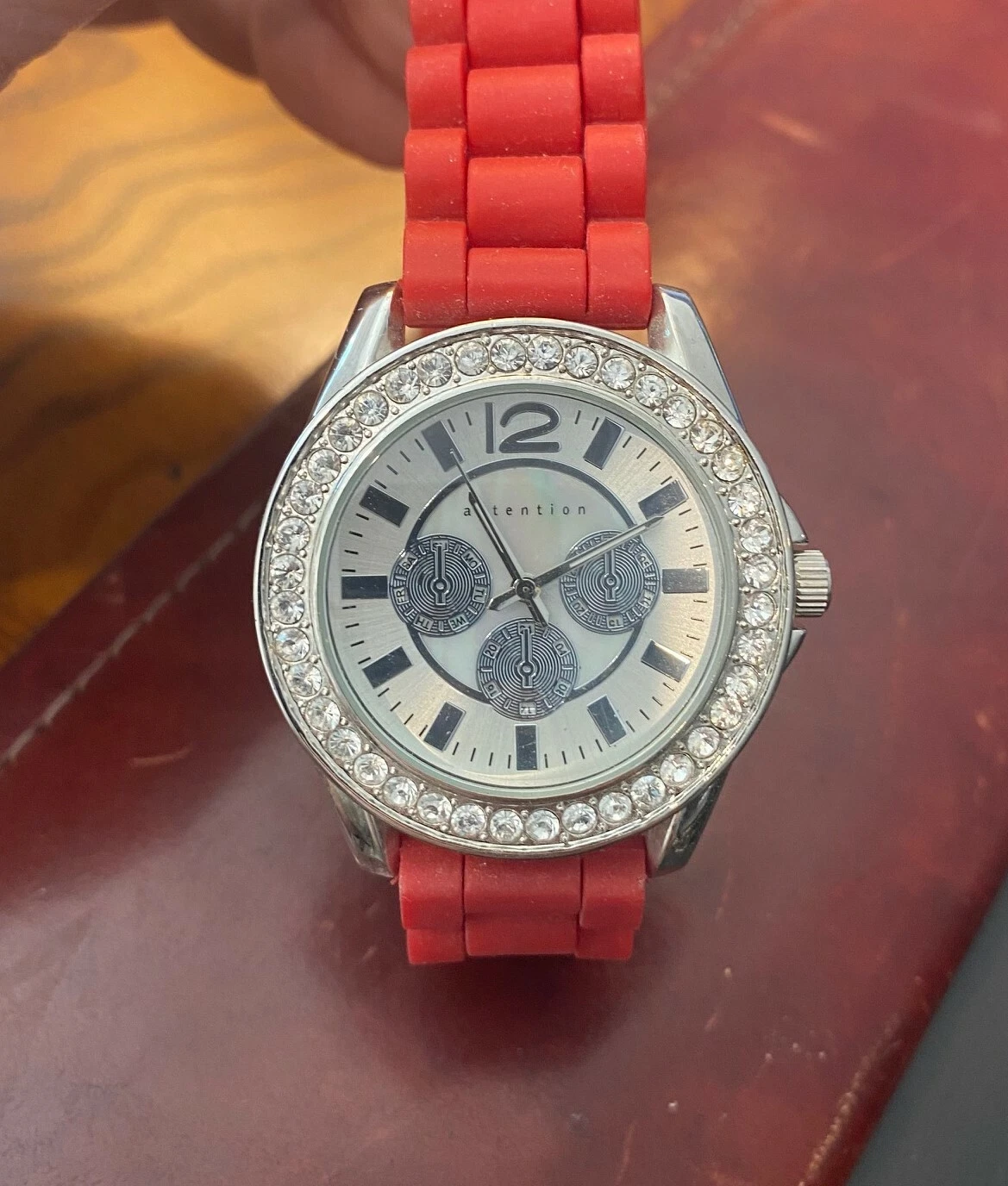 Women's 40mm Silver Tone Attention Watch, Crystal Accents, Red Poly Band