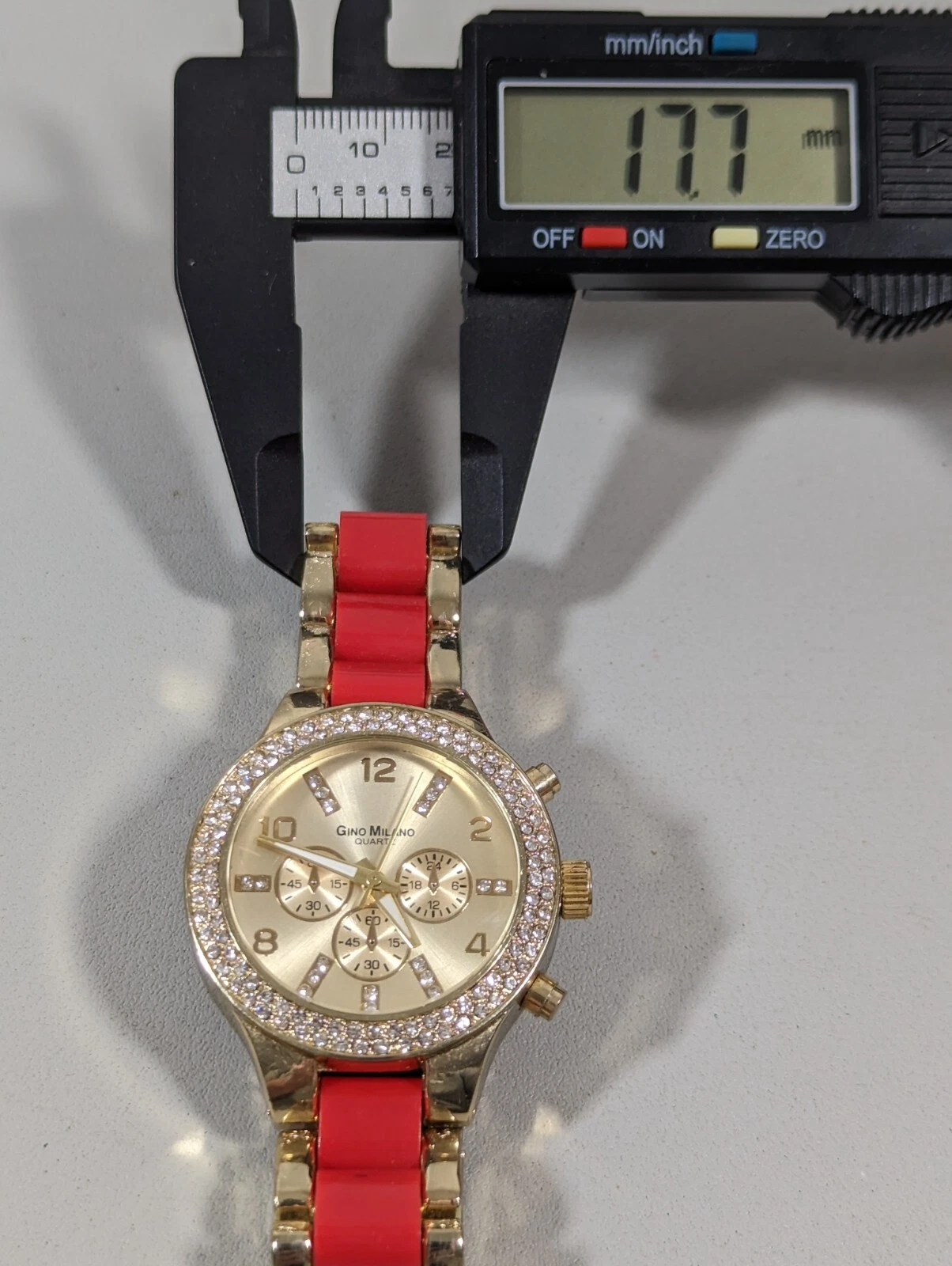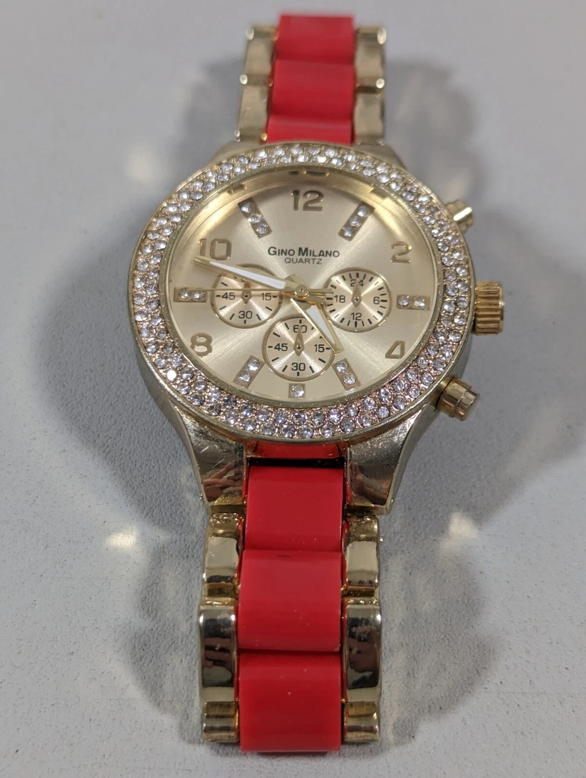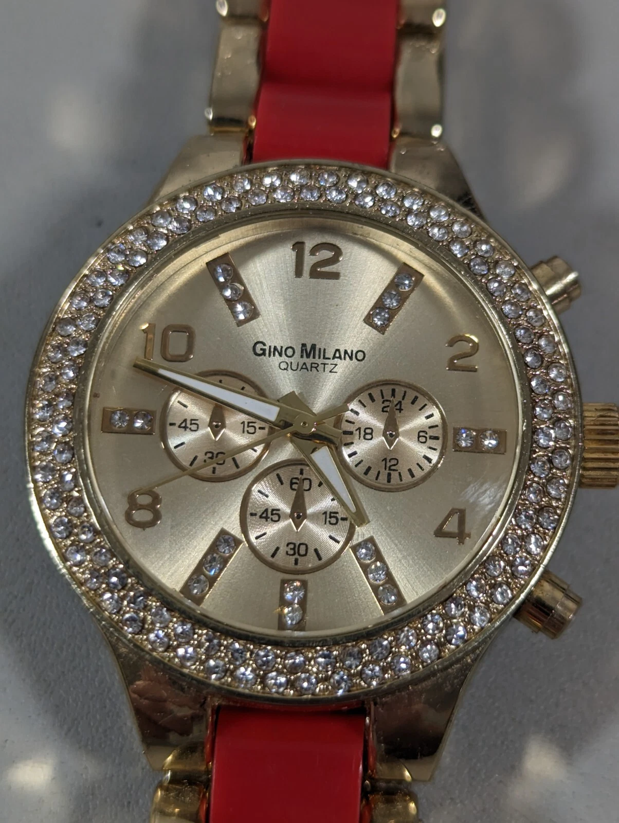 Gino Milano Gold Tone Dial Crystal Accent Round Case Red Link Band Watch