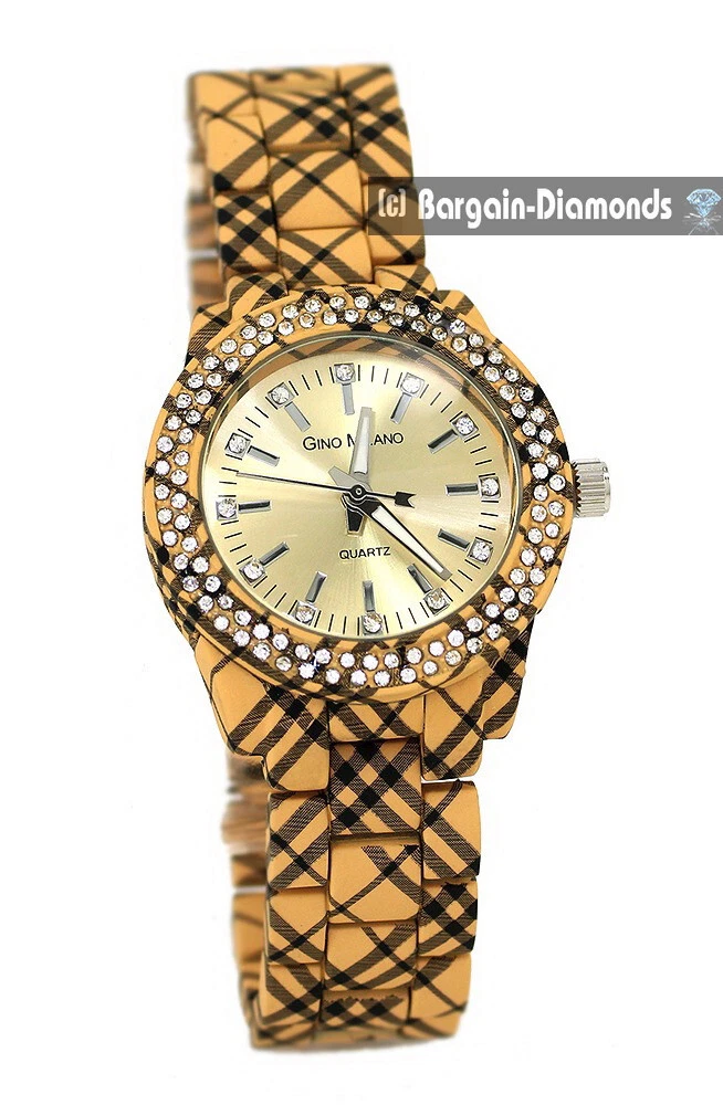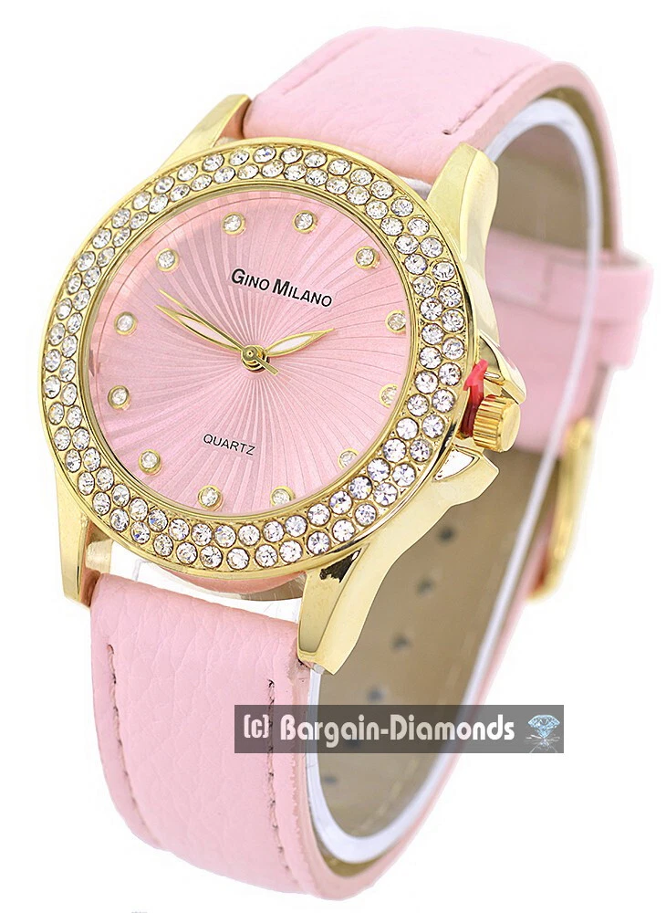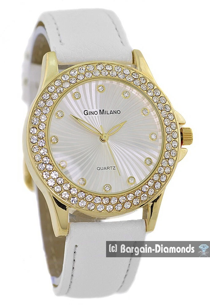 Ladies Gold-CZ Clubbing White Dial/Leatherette Strap to 8.5" Wrist Gold Hands