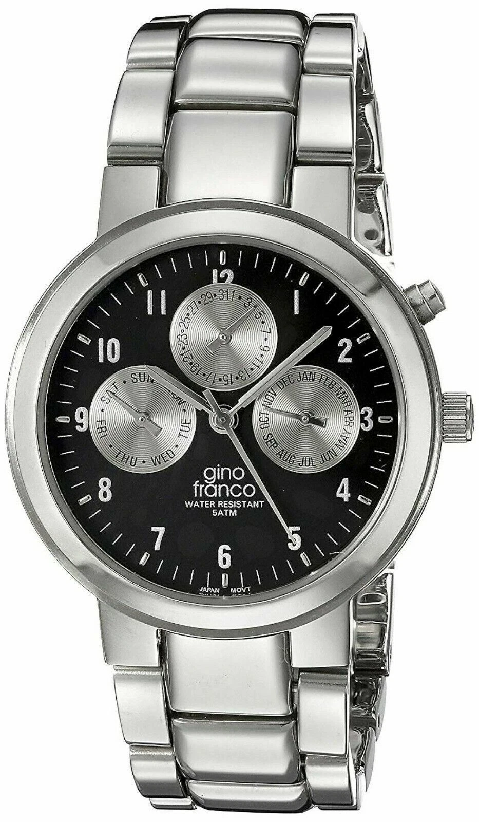 NEW Gino Franco 921BK Men's Month Day Date Round Black Dial Silver SS Watch 50m